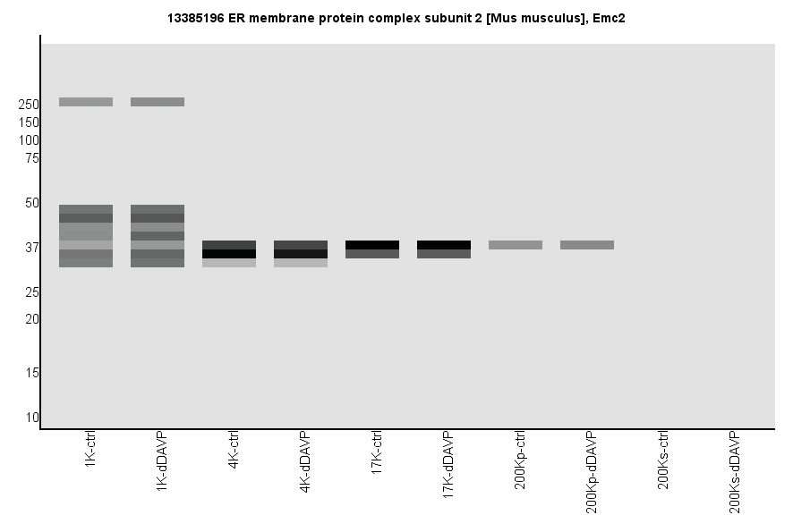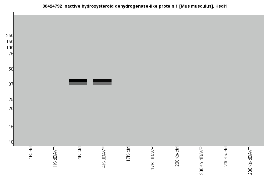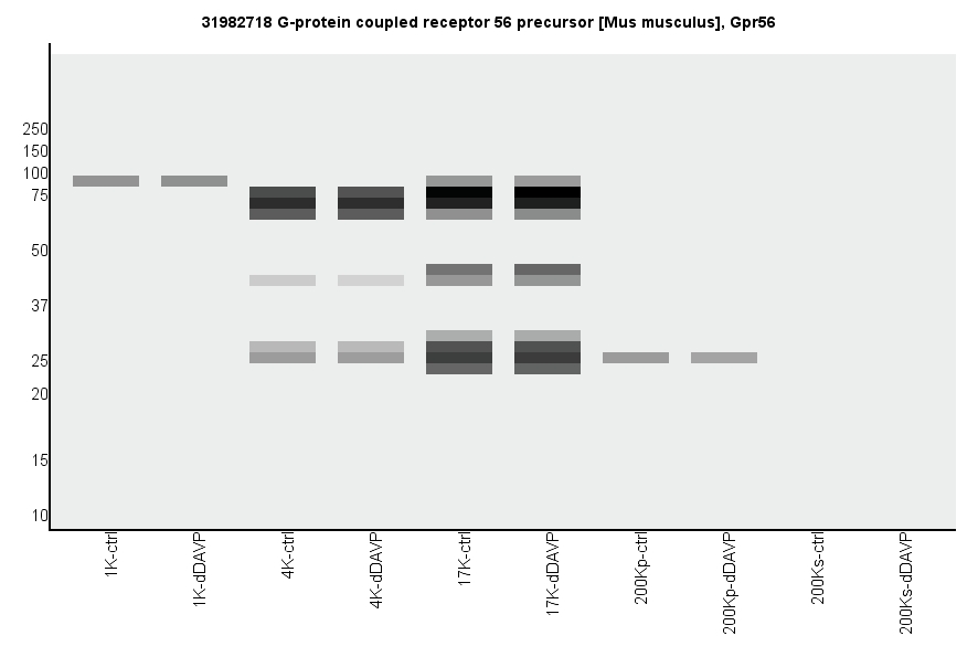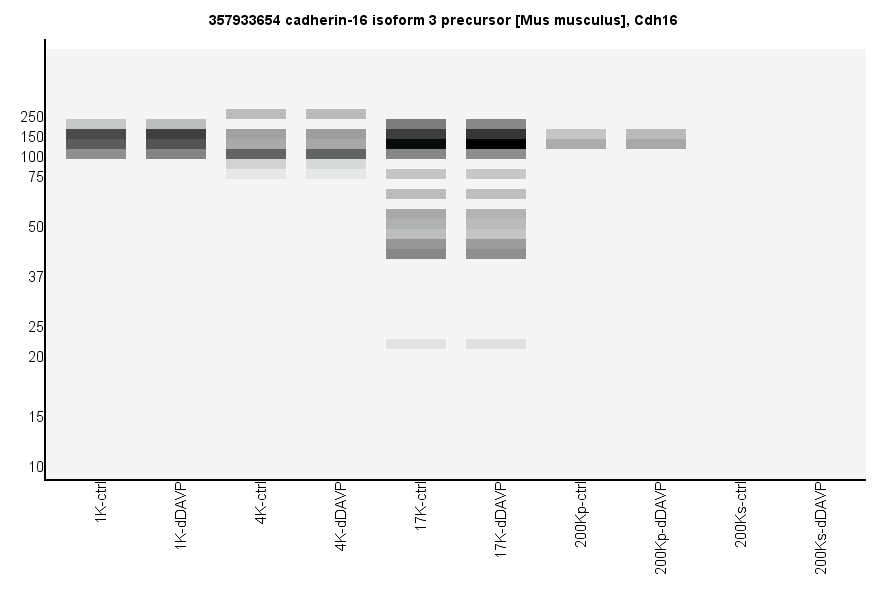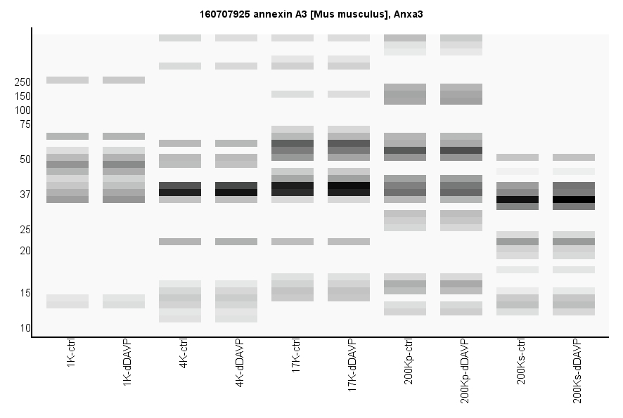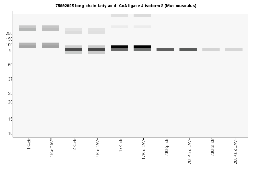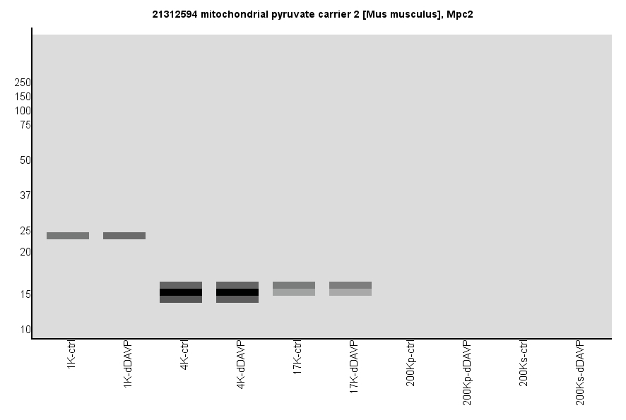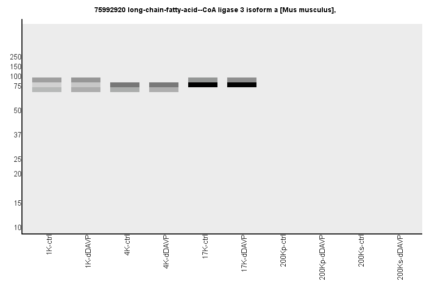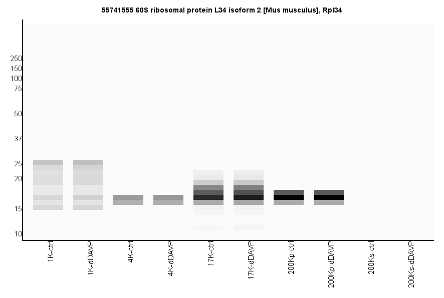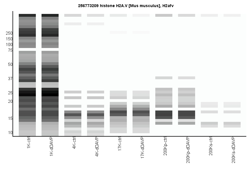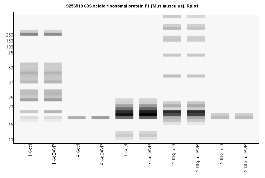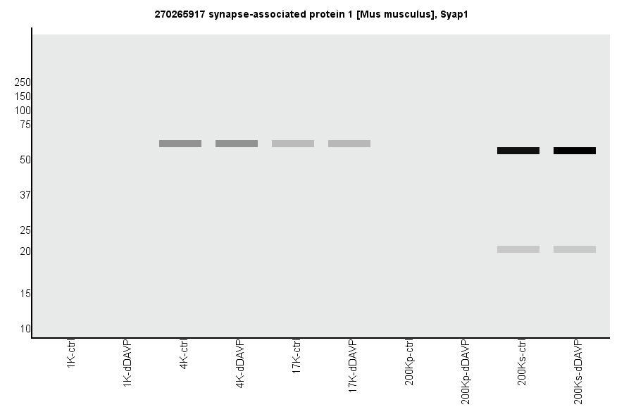 The virtual western blot images show data normalized using a logarithmic conversion scale to map peptide intensities to gray-scale levels. Using this conversion method, low-abundance peptides are generally visible in the blot images. Switch back to the default linear conversion scale database page.