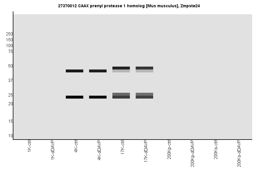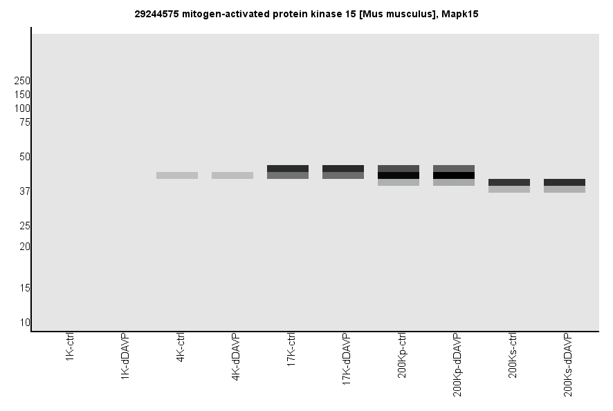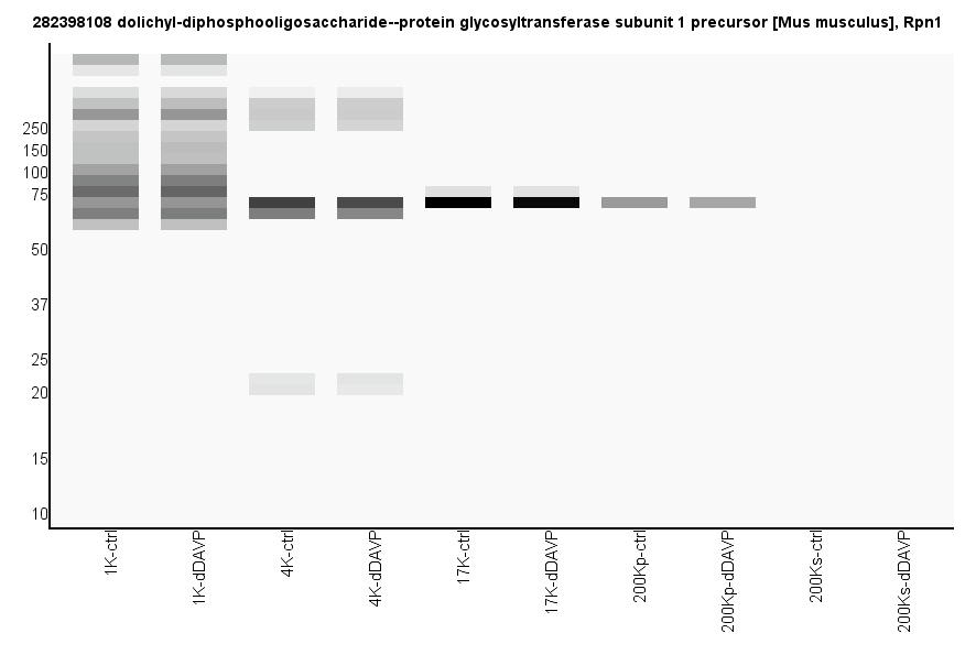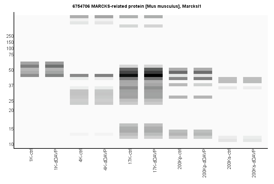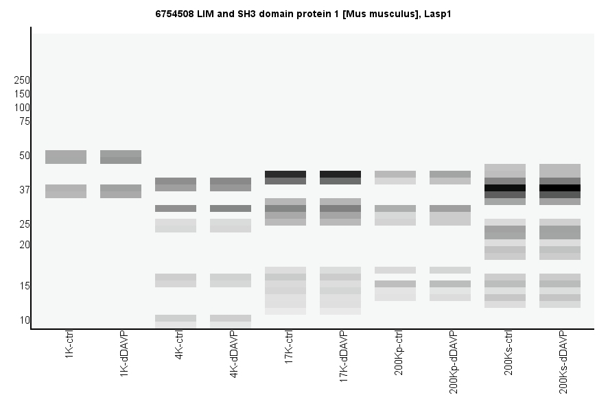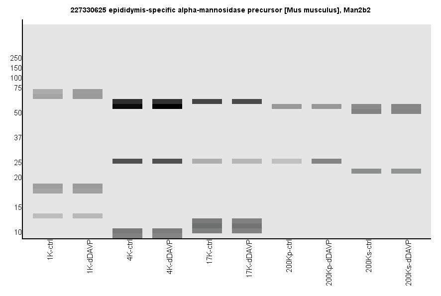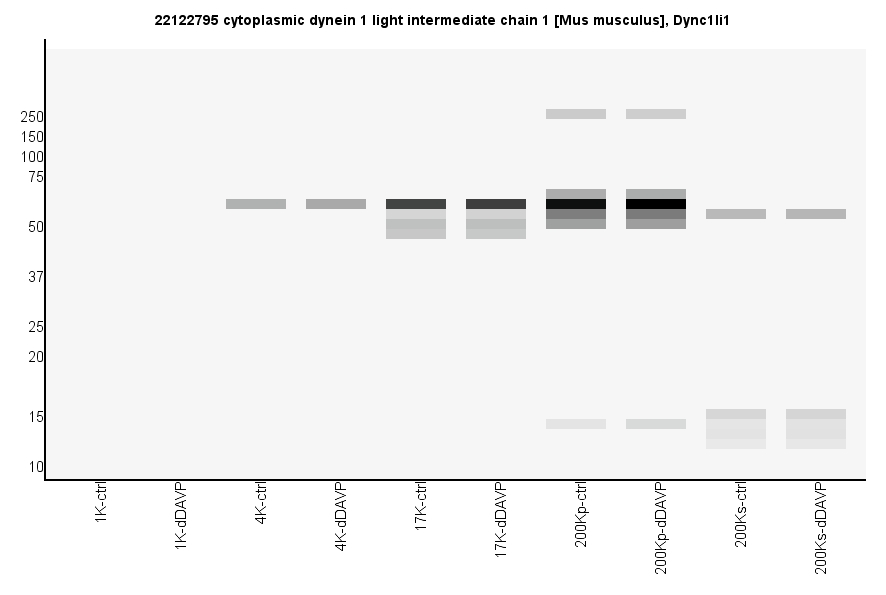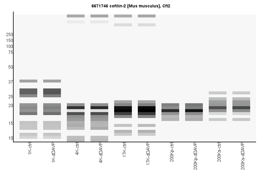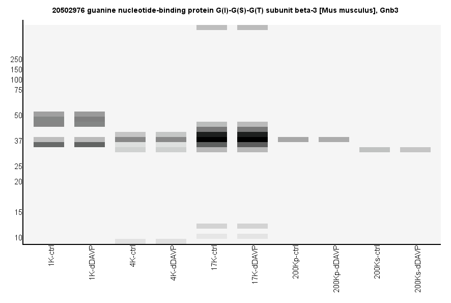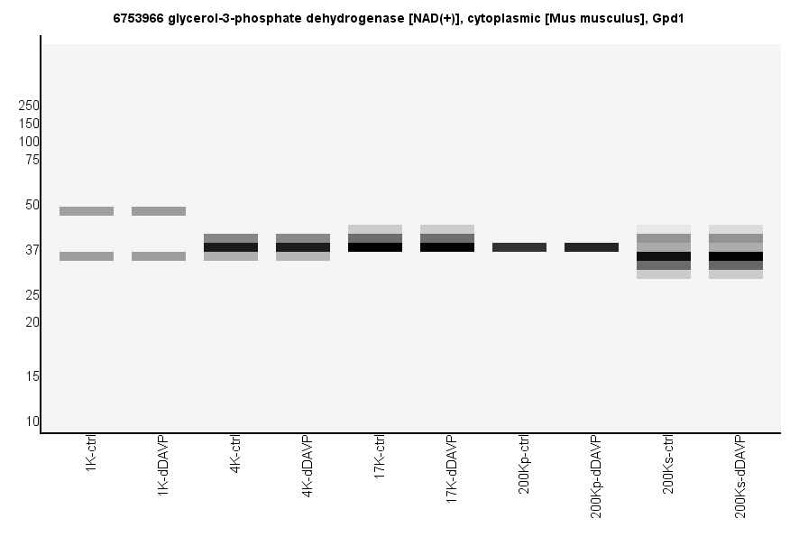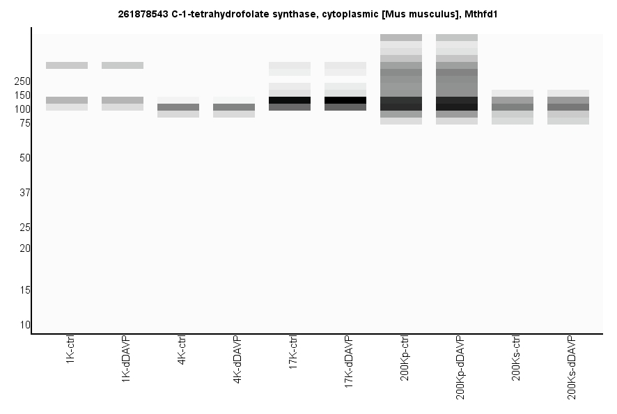 The virtual western blot images show data normalized using a logarithmic conversion scale to map peptide intensities to gray-scale levels. Using this conversion method, low-abundance peptides are generally visible in the blot images. Switch back to the default linear conversion scale database page.
