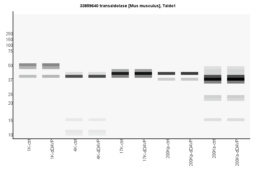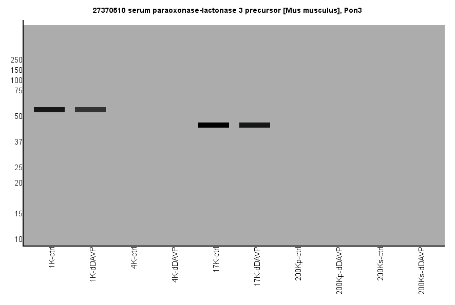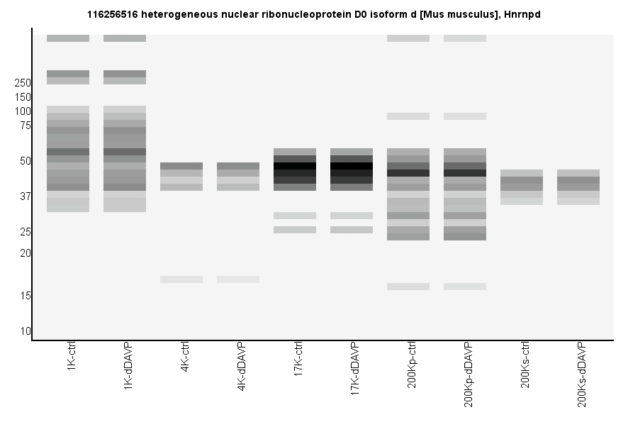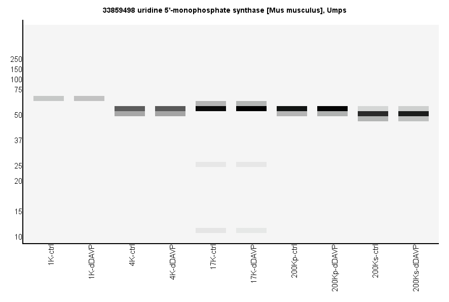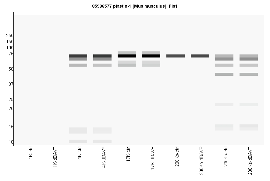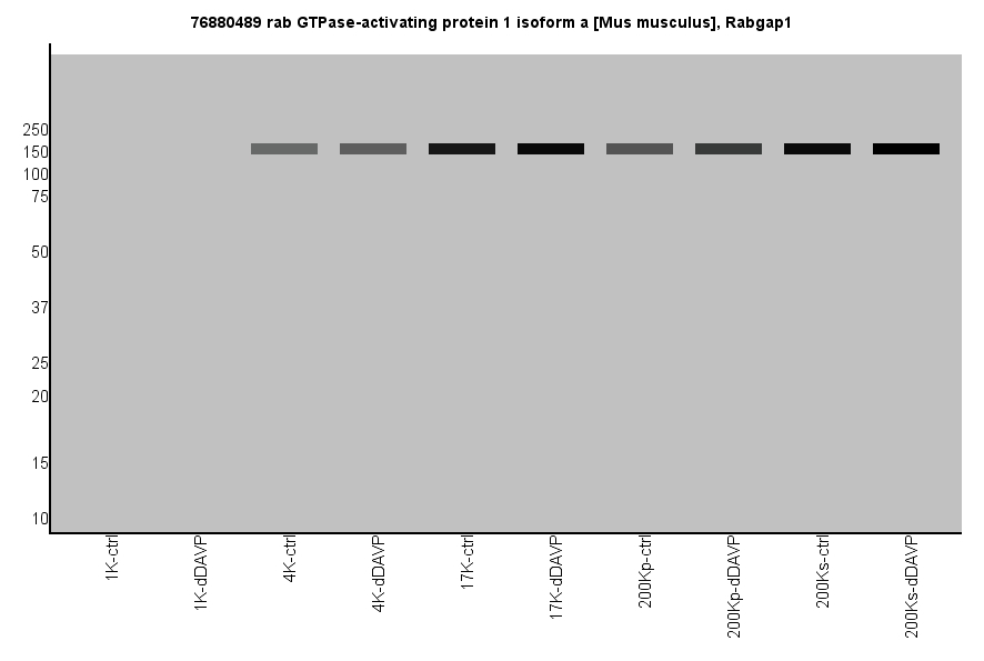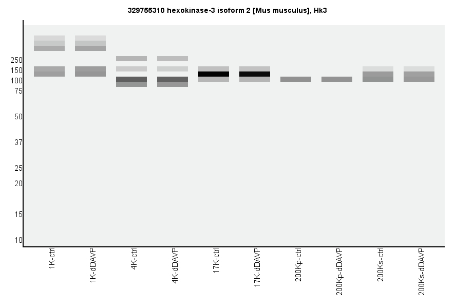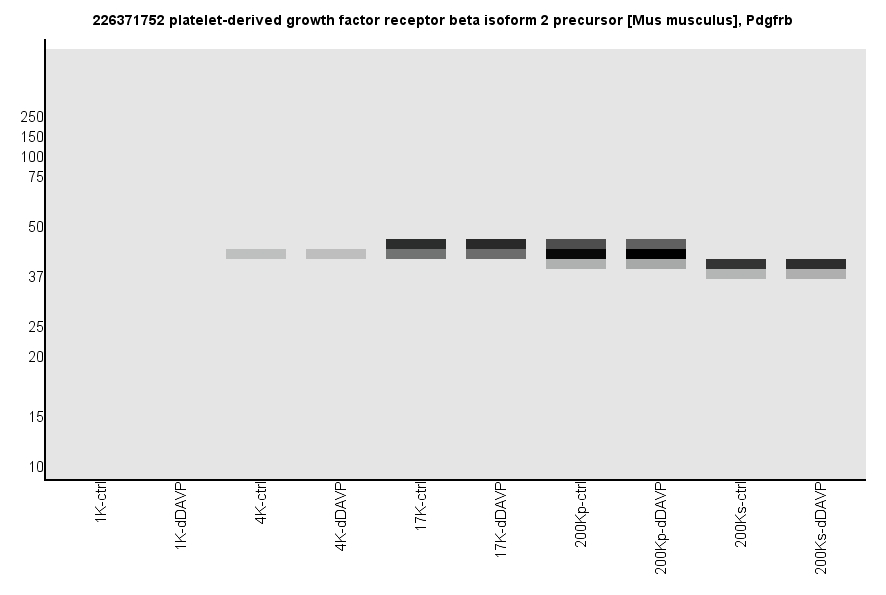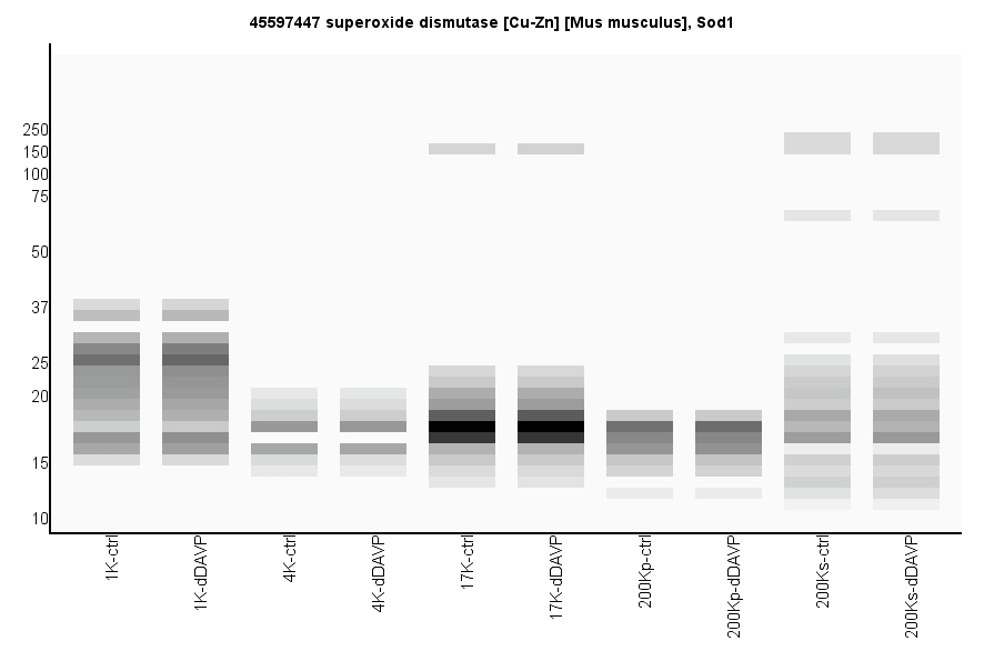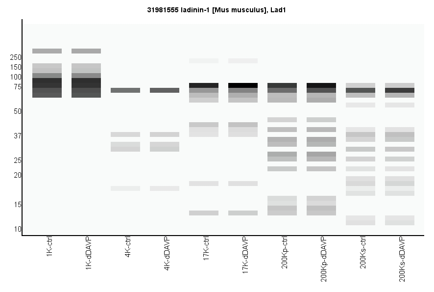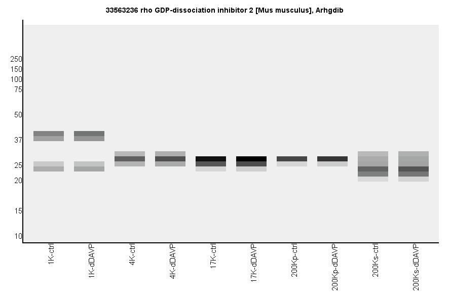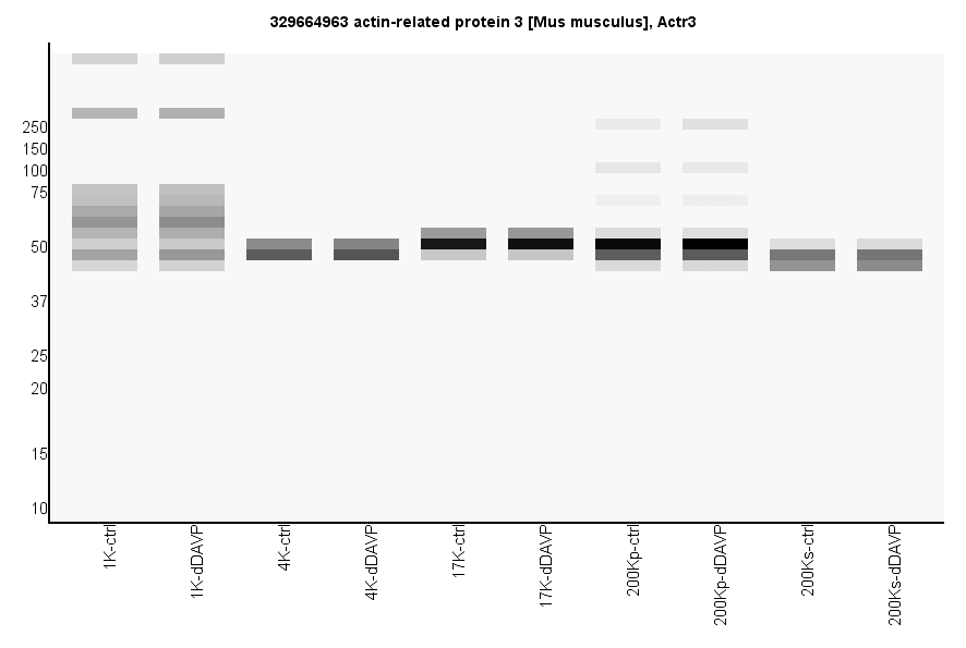 The virtual western blot images show data normalized using a logarithmic conversion scale to map peptide intensities to gray-scale levels. Using this conversion method, low-abundance peptides are generally visible in the blot images. Switch back to the default linear conversion scale database page.