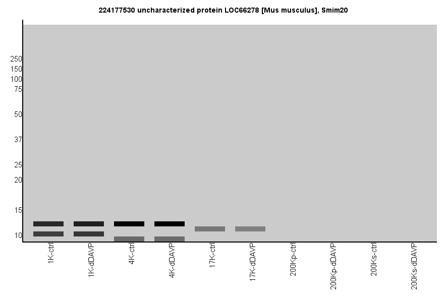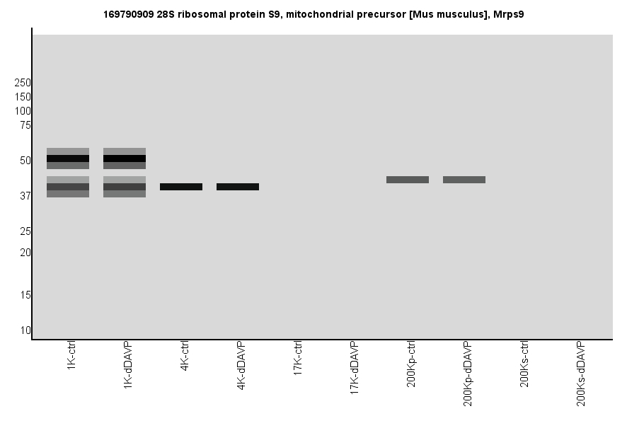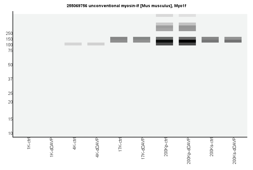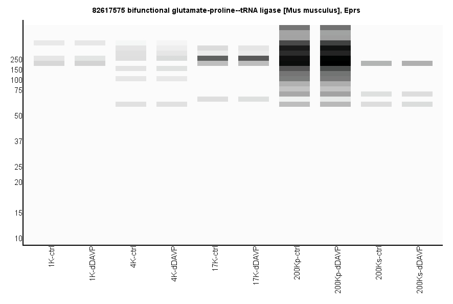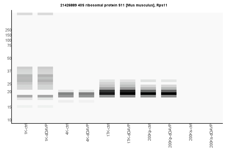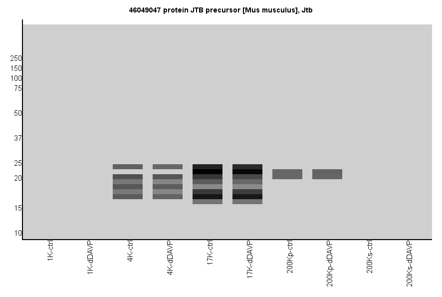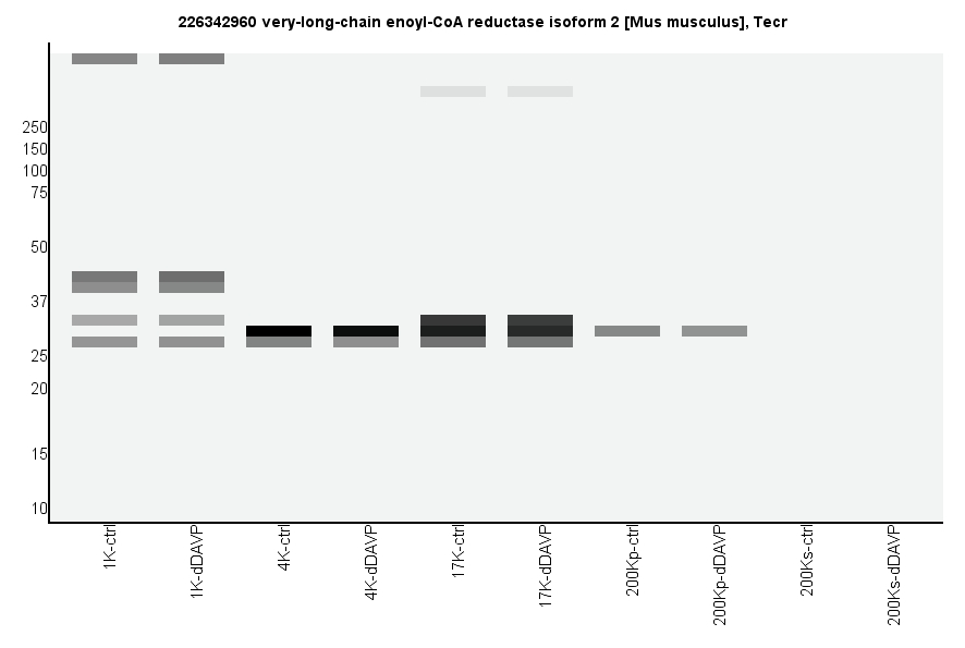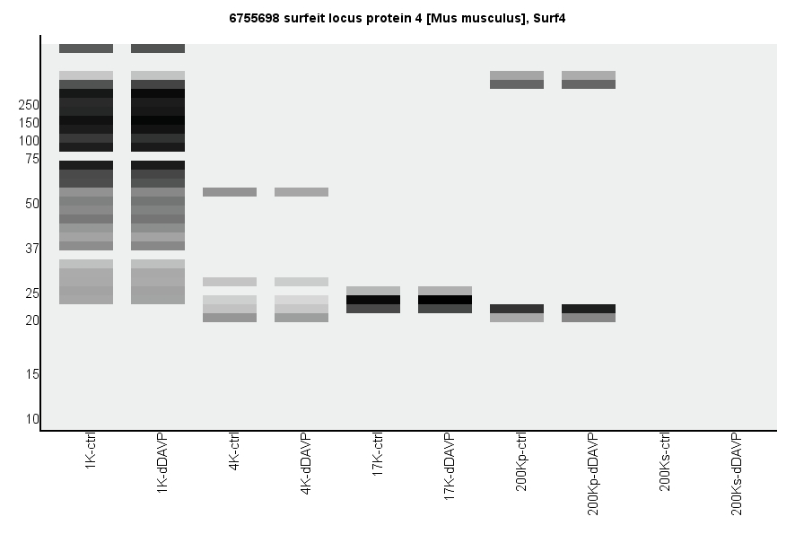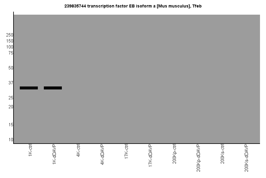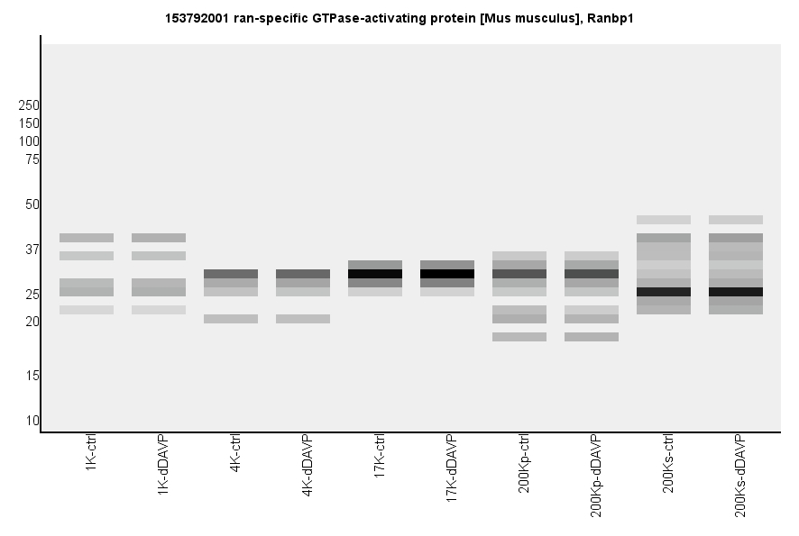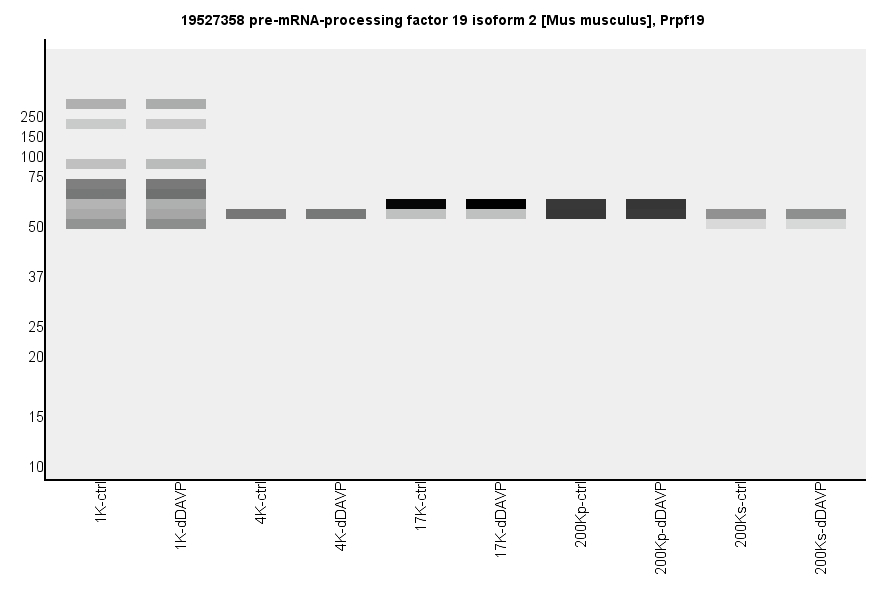 The virtual western blot images show data normalized using a logarithmic conversion scale to map peptide intensities to gray-scale levels. Using this conversion method, low-abundance peptides are generally visible in the blot images. Switch back to the default linear conversion scale database page.