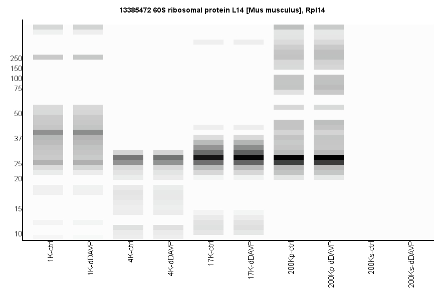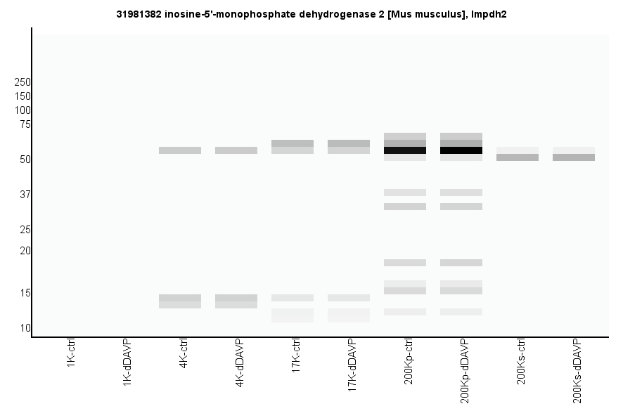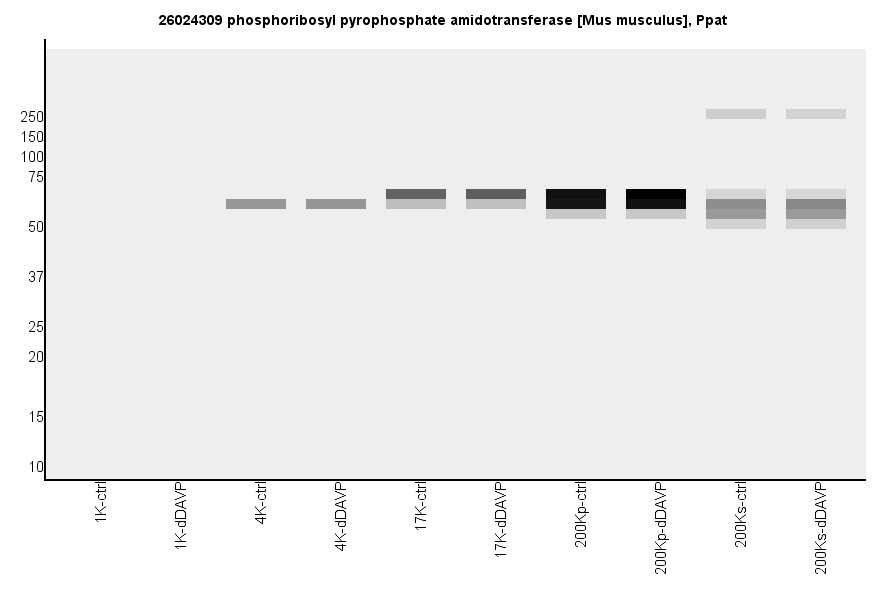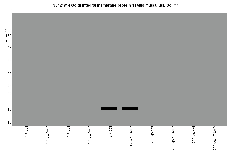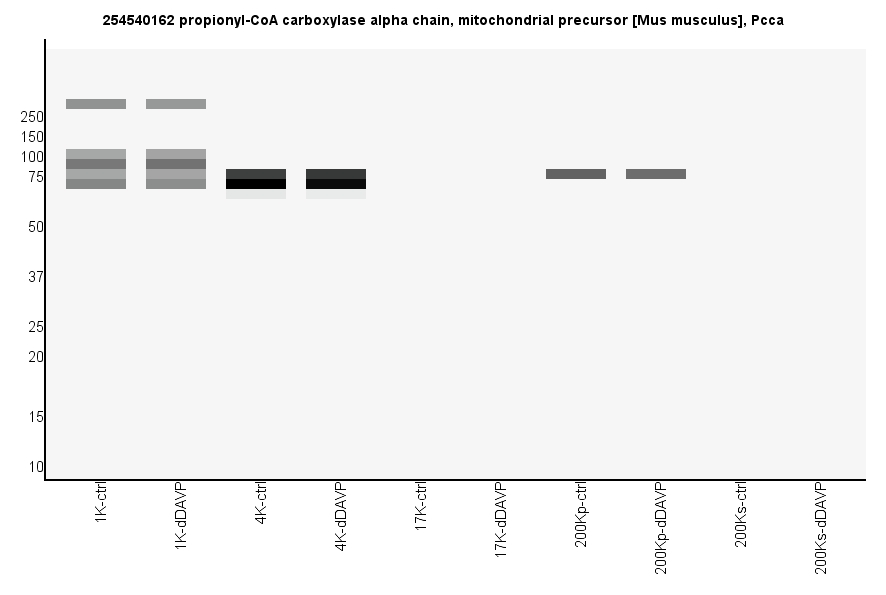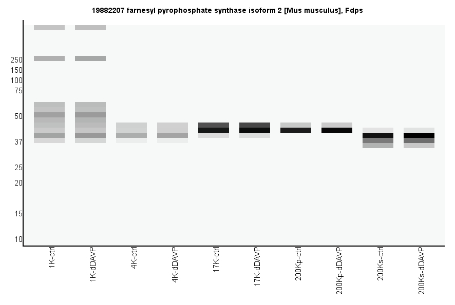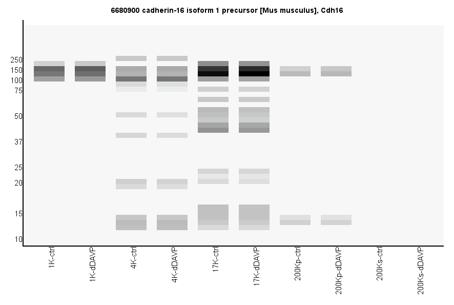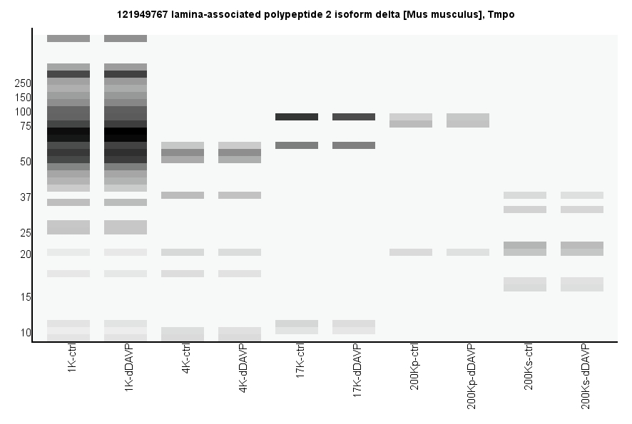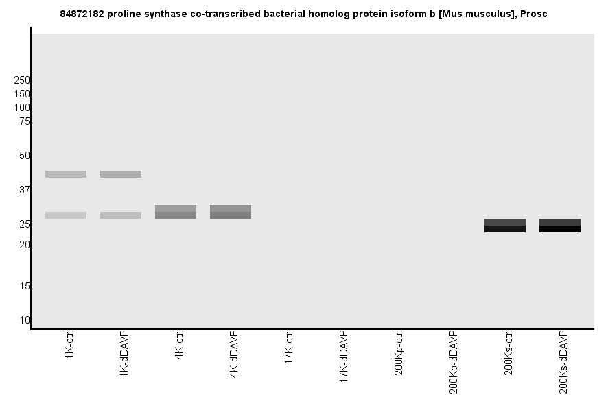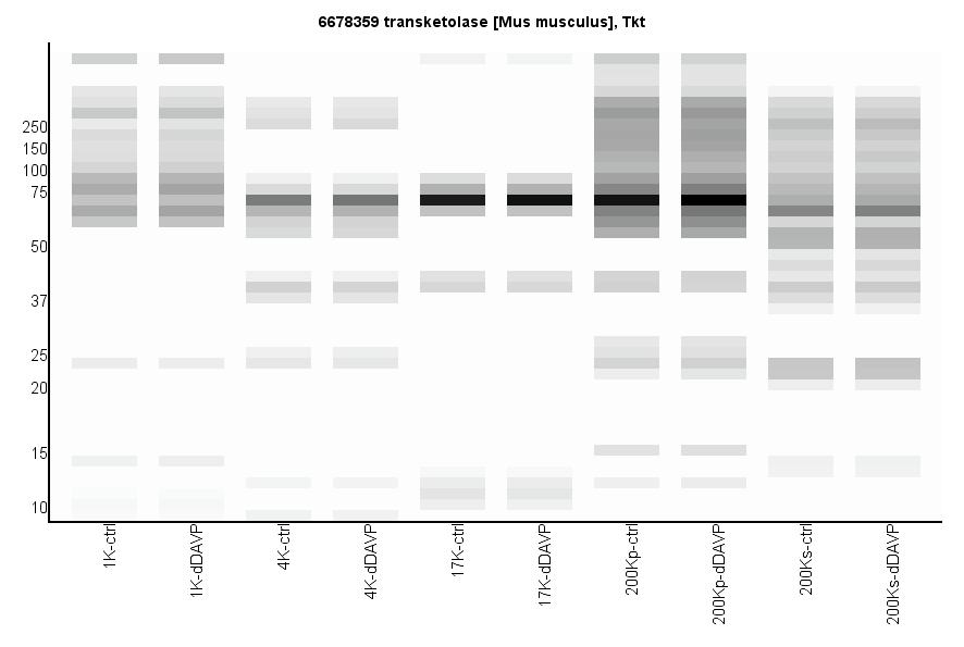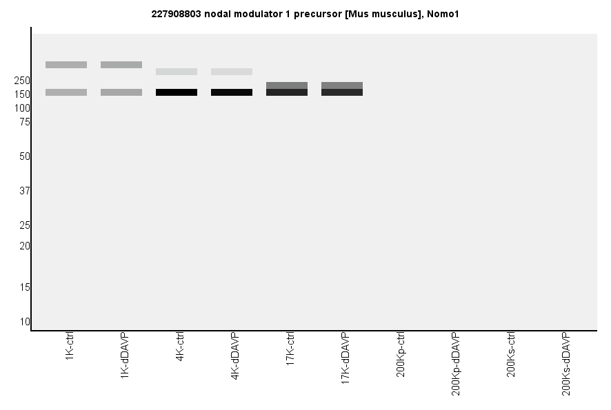 The virtual western blot images show data normalized using a logarithmic conversion scale to map peptide intensities to gray-scale levels. Using this conversion method, low-abundance peptides are generally visible in the blot images. Switch back to the default linear conversion scale database page.