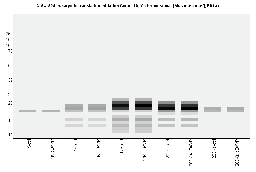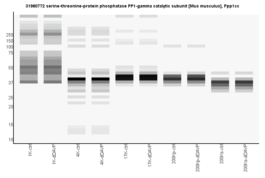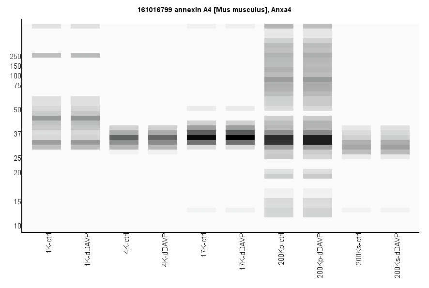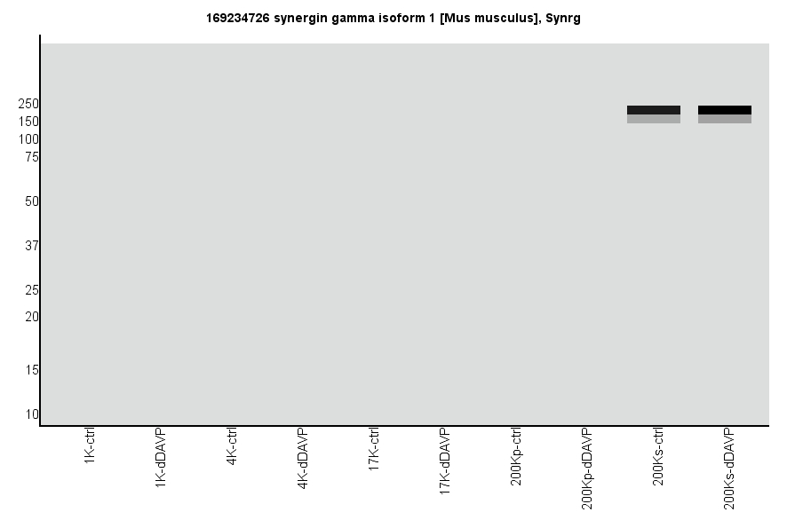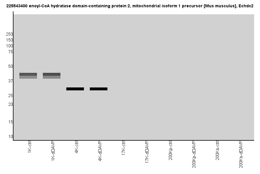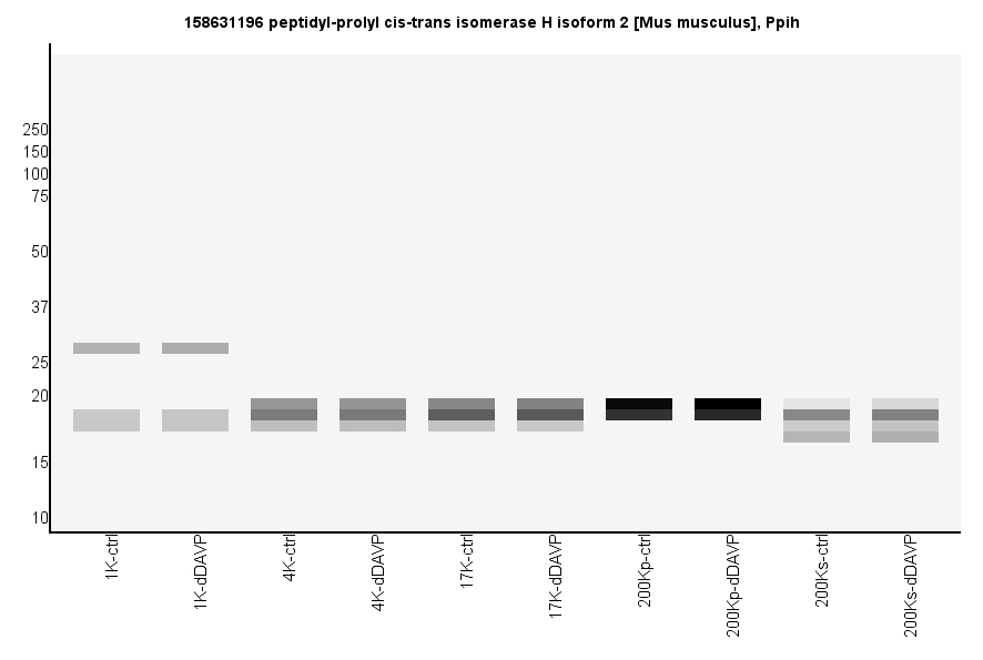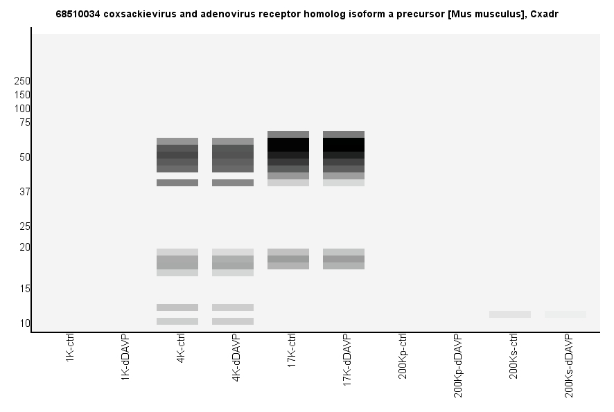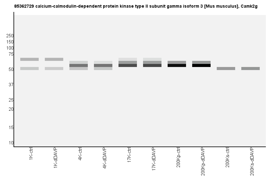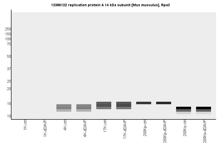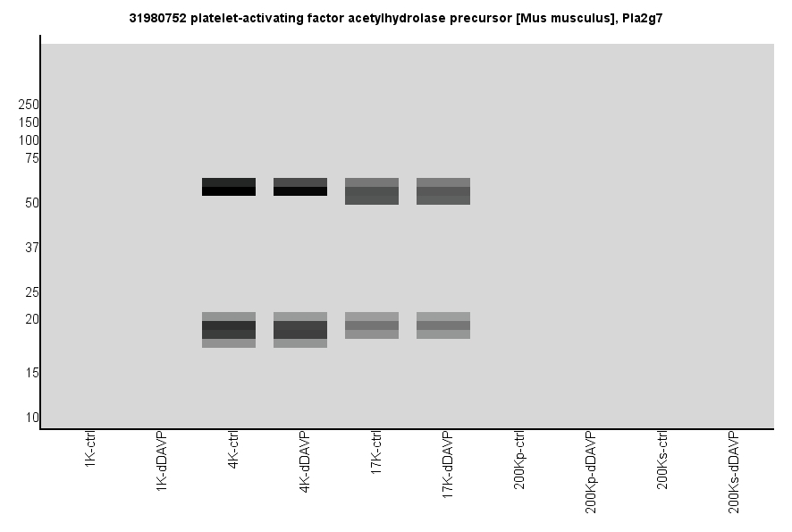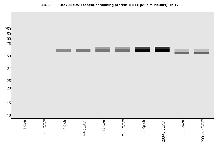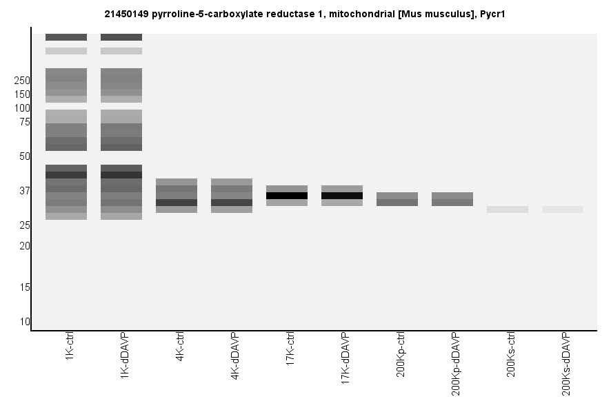 The virtual western blot images show data normalized using a logarithmic conversion scale to map peptide intensities to gray-scale levels. Using this conversion method, low-abundance peptides are generally visible in the blot images. Switch back to the default linear conversion scale database page.