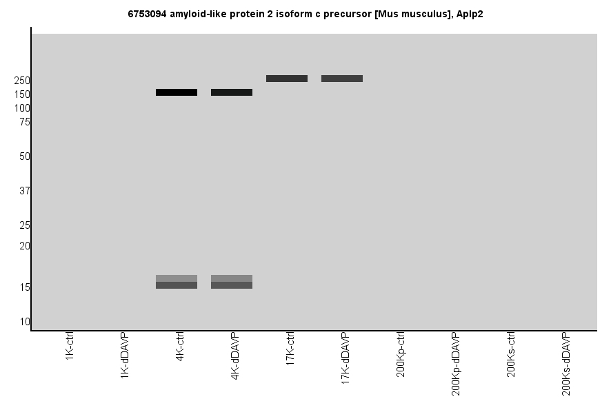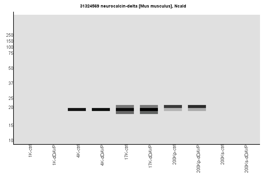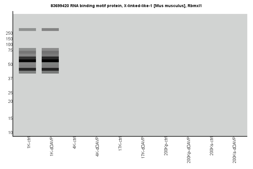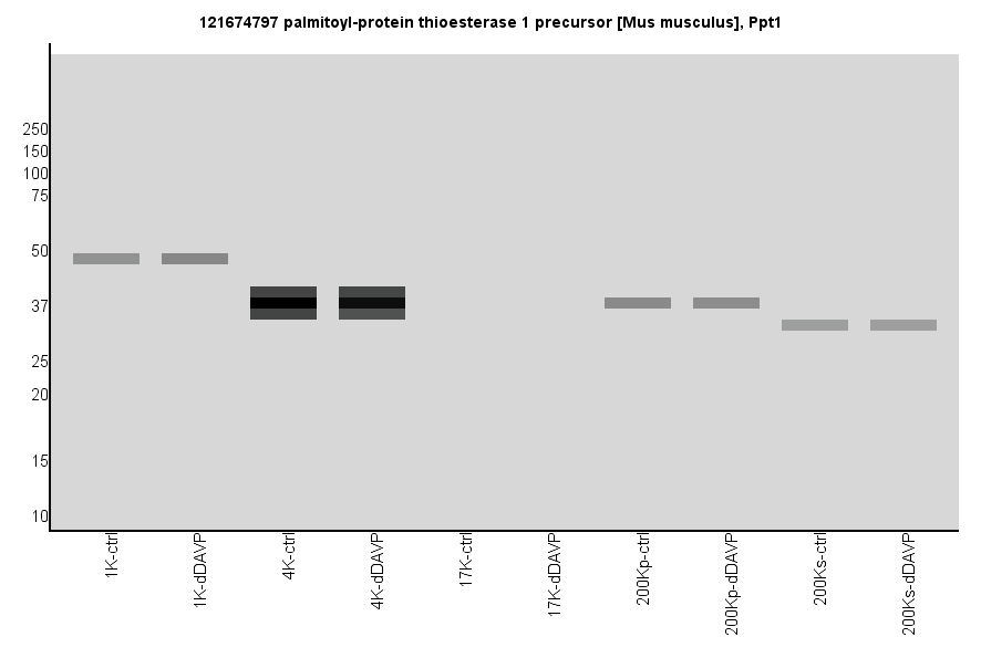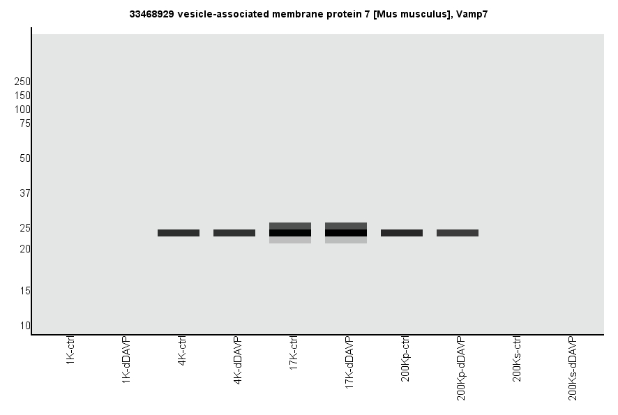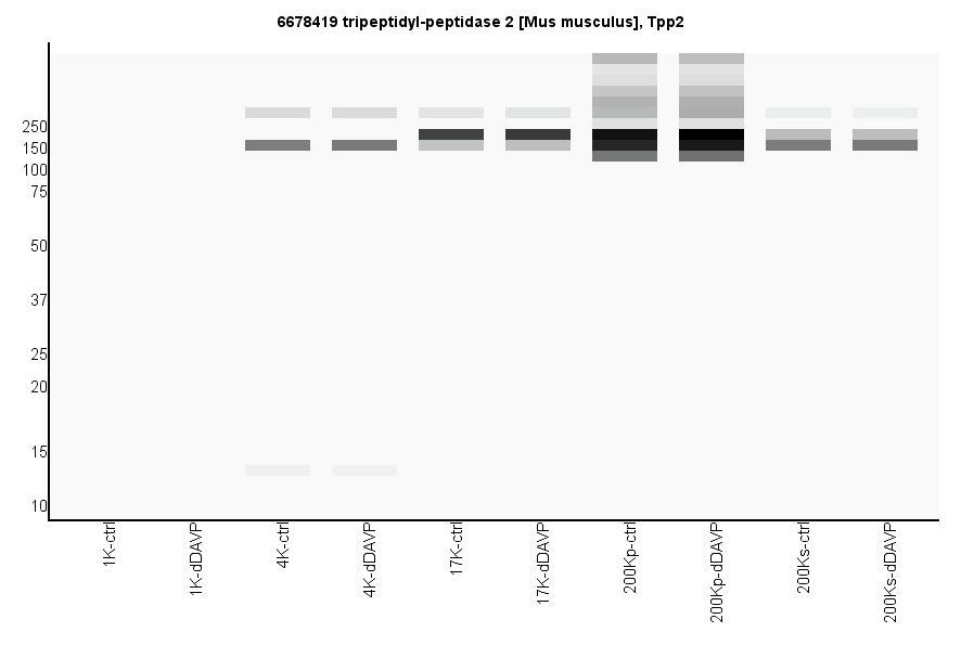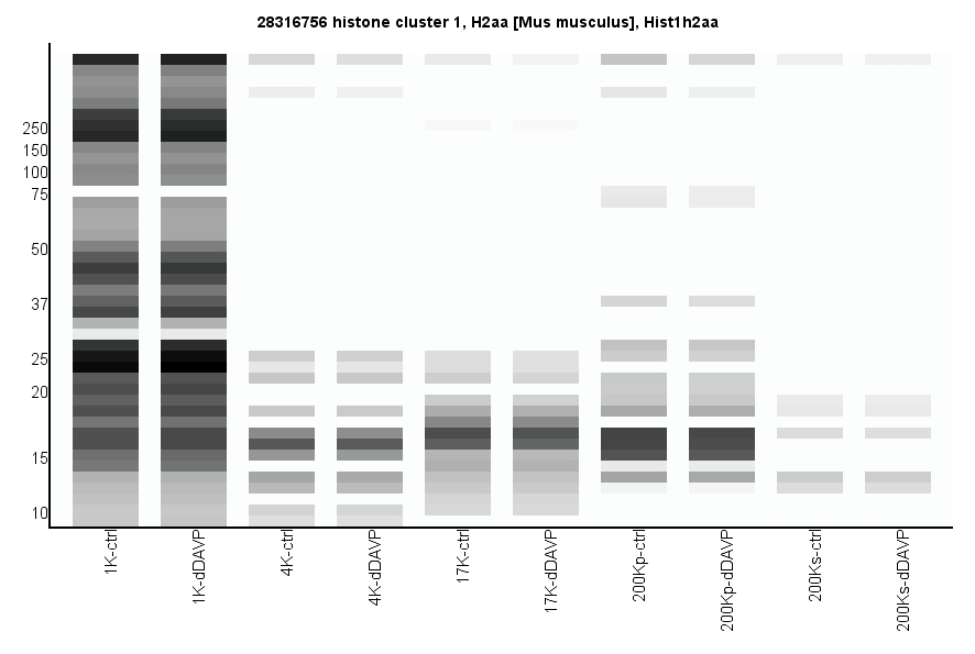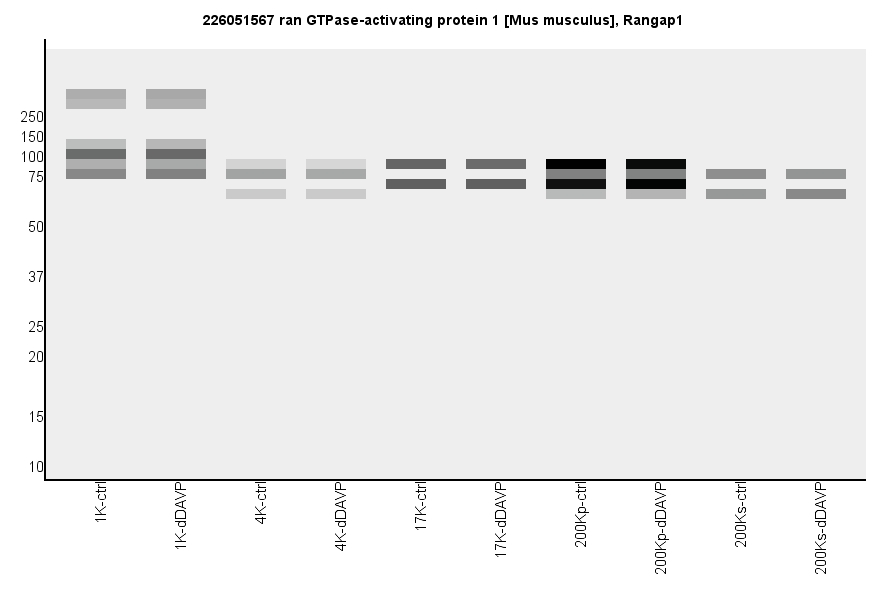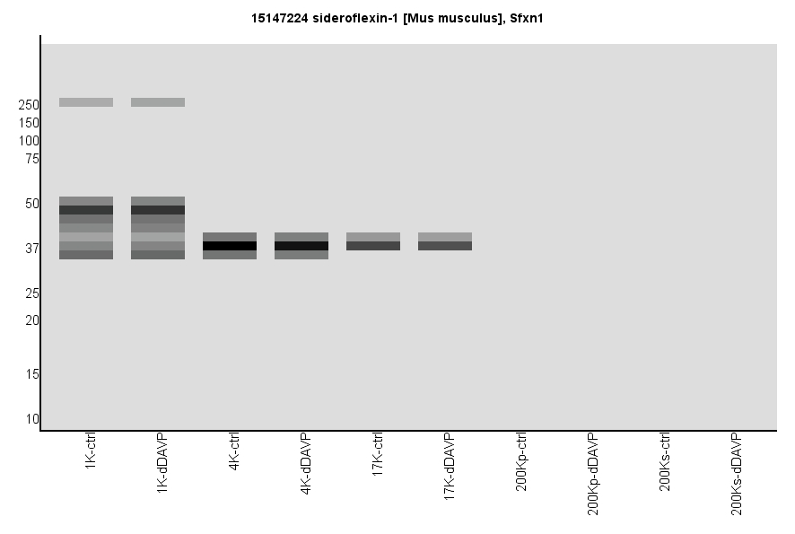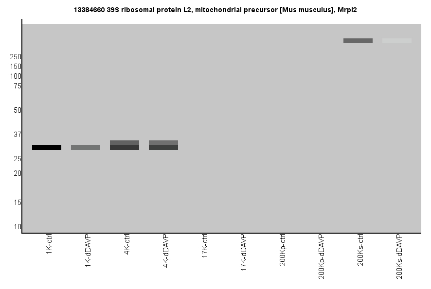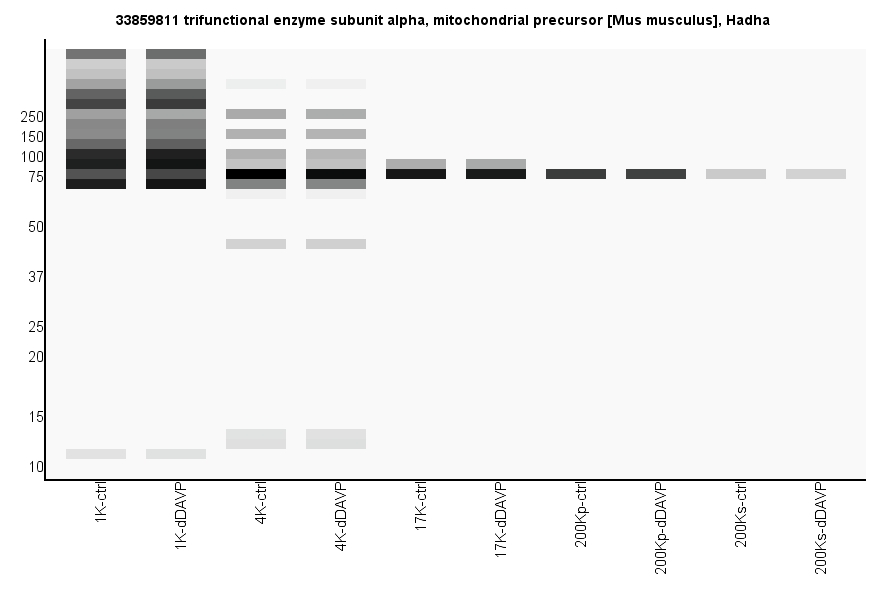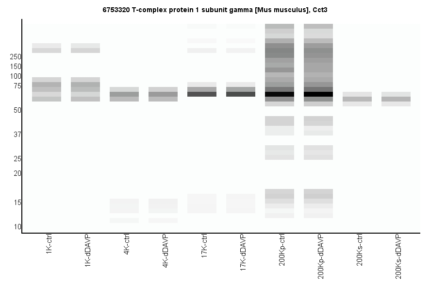 The virtual western blot images show data normalized using a logarithmic conversion scale to map peptide intensities to gray-scale levels. Using this conversion method, low-abundance peptides are generally visible in the blot images. Switch back to the default linear conversion scale database page.
