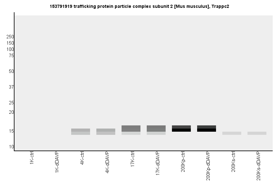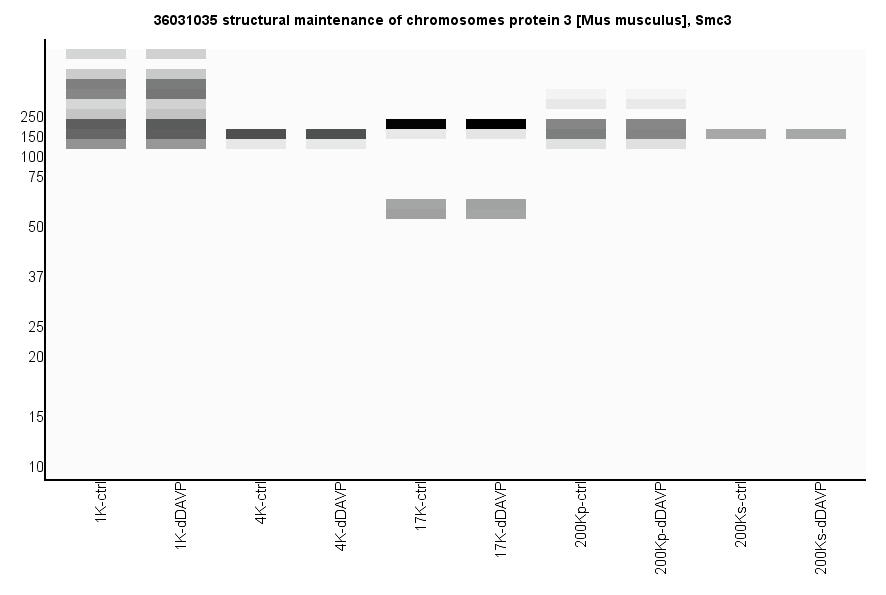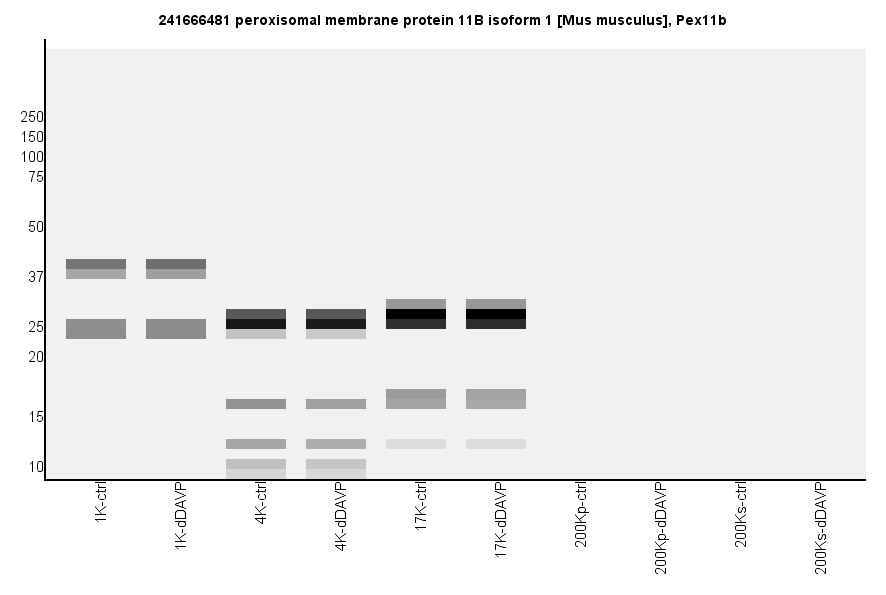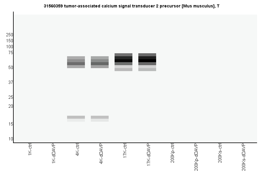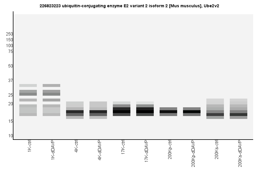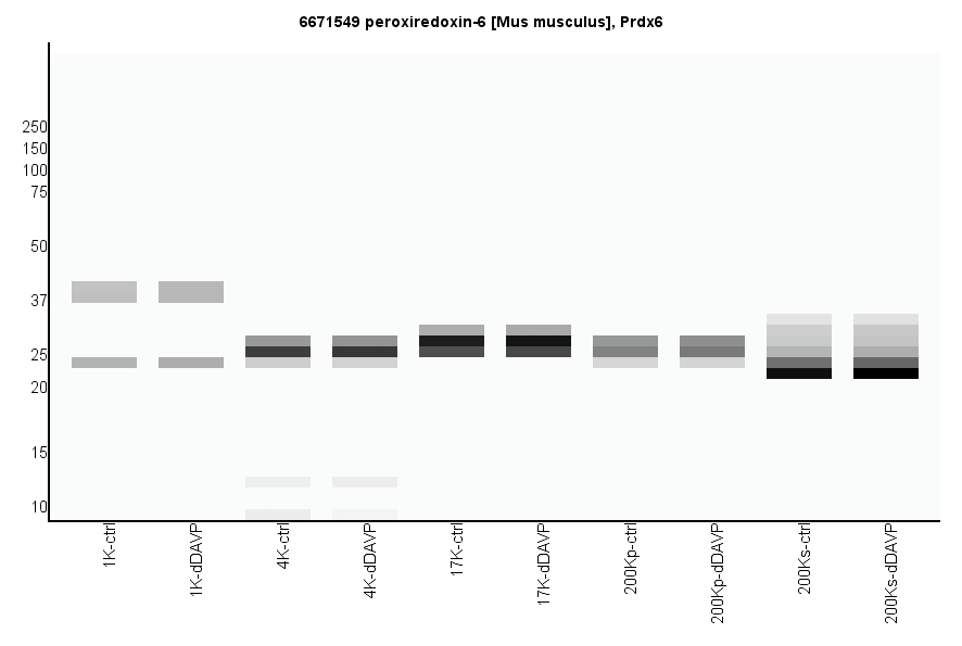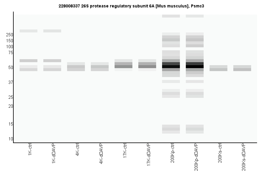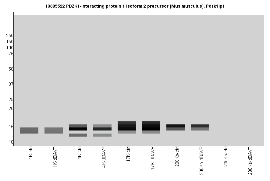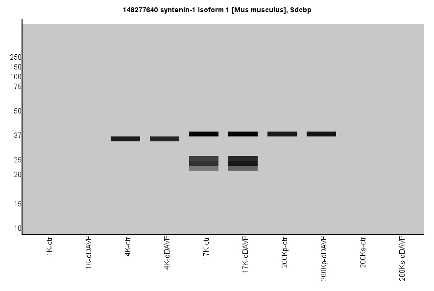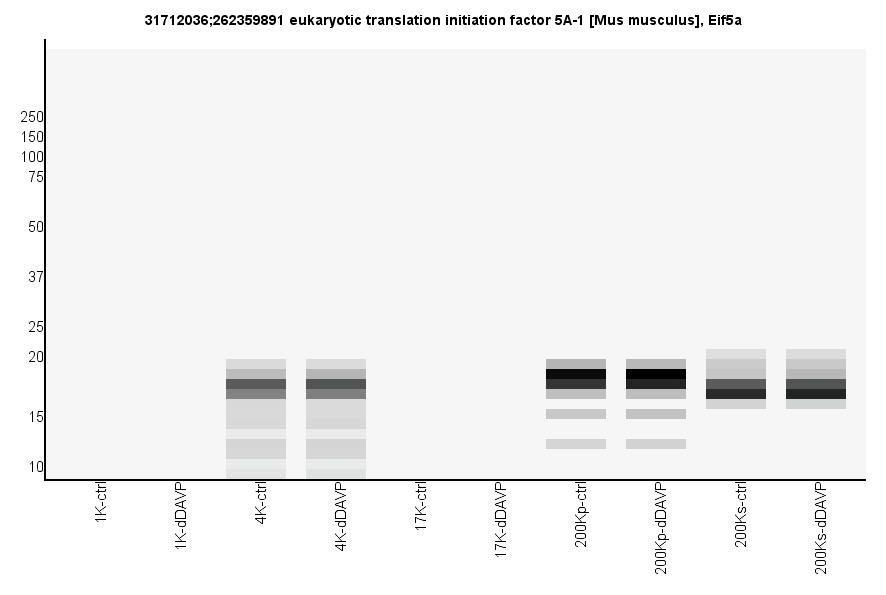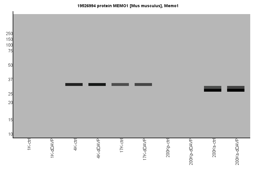 The virtual western blot images show data normalized using a logarithmic conversion scale to map peptide intensities to gray-scale levels. Using this conversion method, low-abundance peptides are generally visible in the blot images. Switch back to the default linear conversion scale database page.