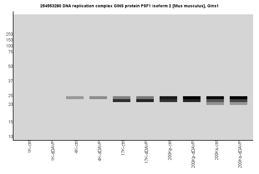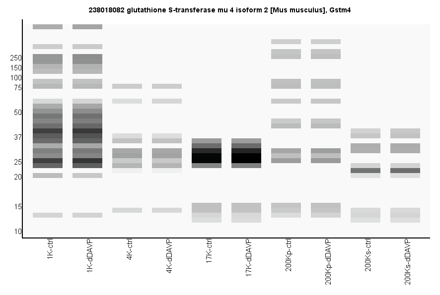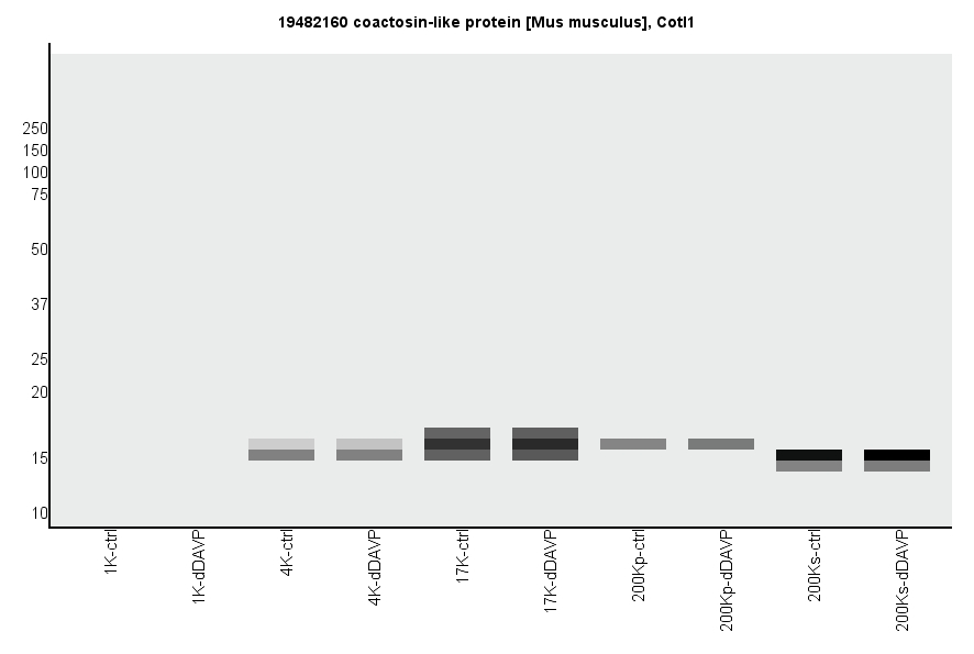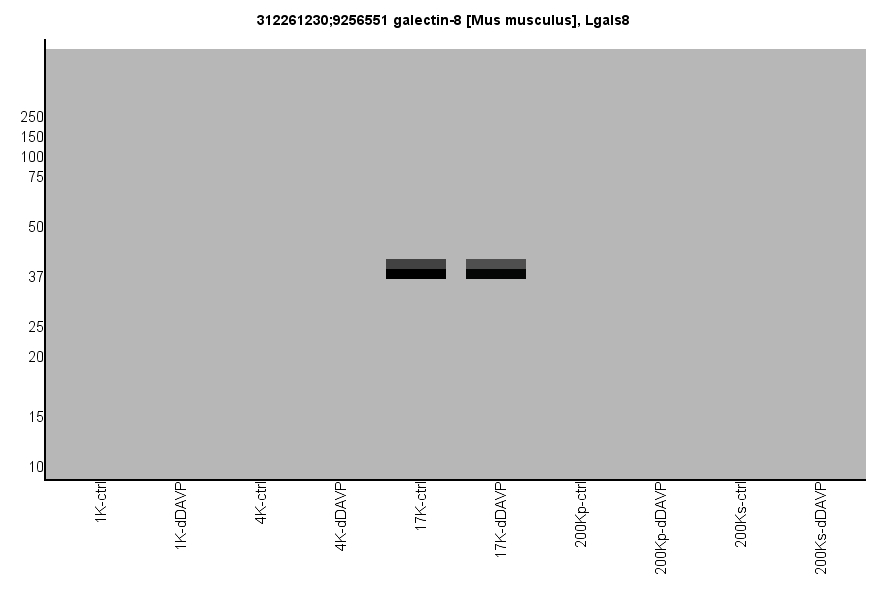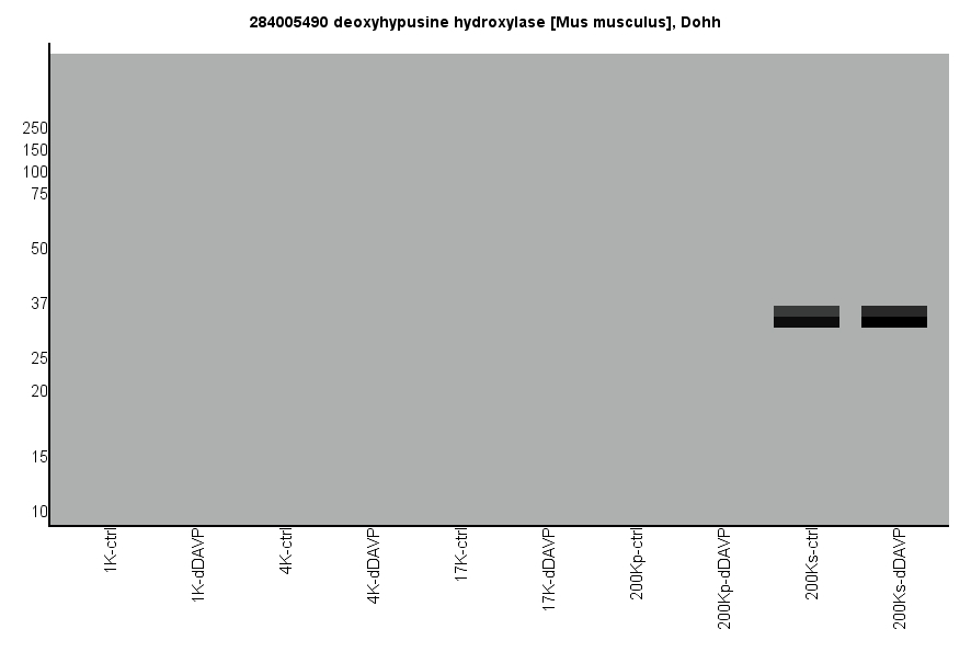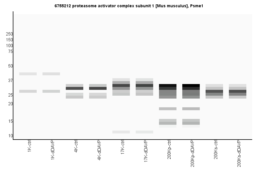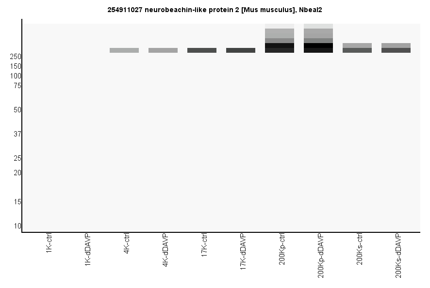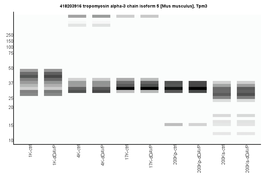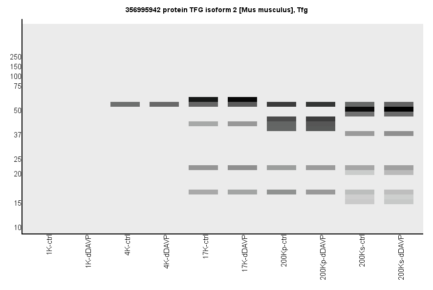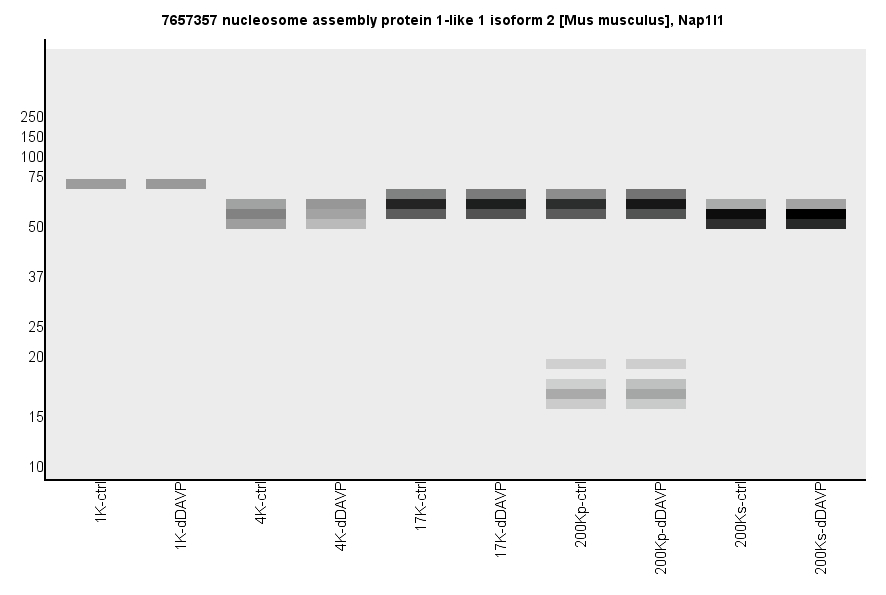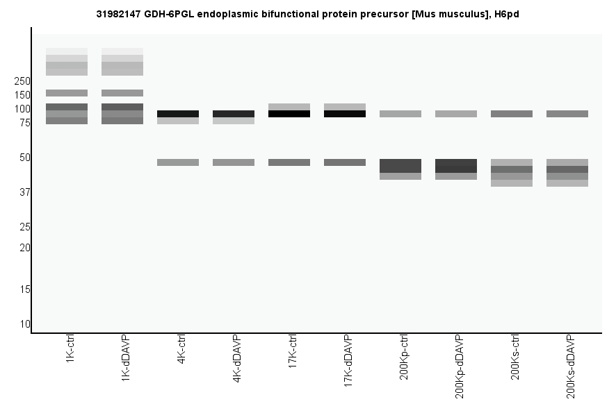 The virtual western blot images show data normalized using a logarithmic conversion scale to map peptide intensities to gray-scale levels. Using this conversion method, low-abundance peptides are generally visible in the blot images. Switch back to the default linear conversion scale database page.