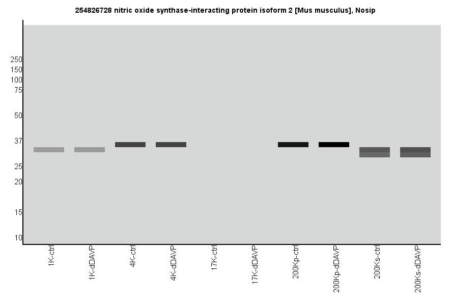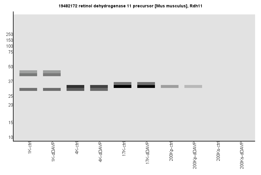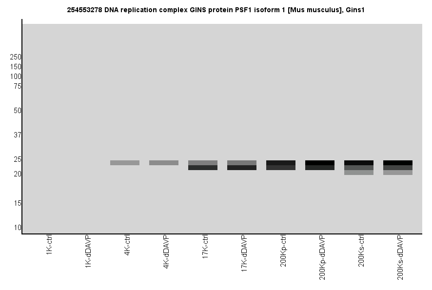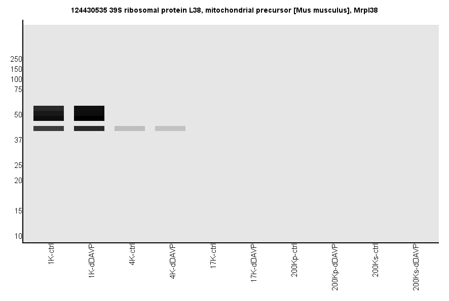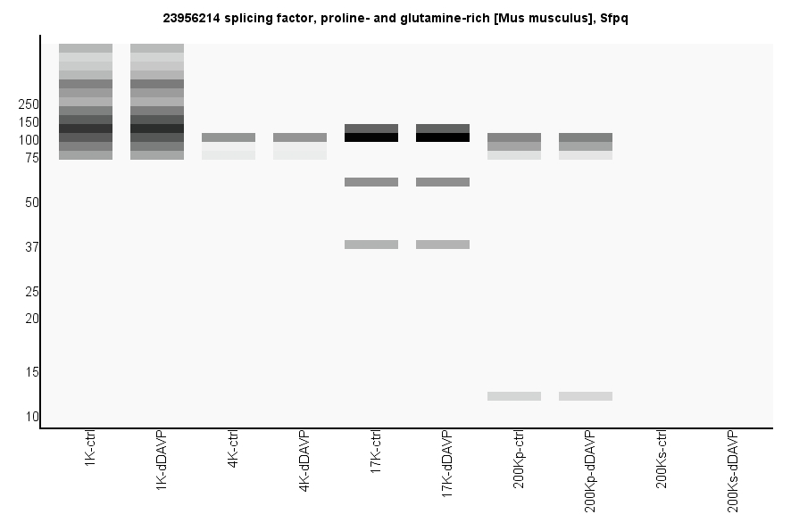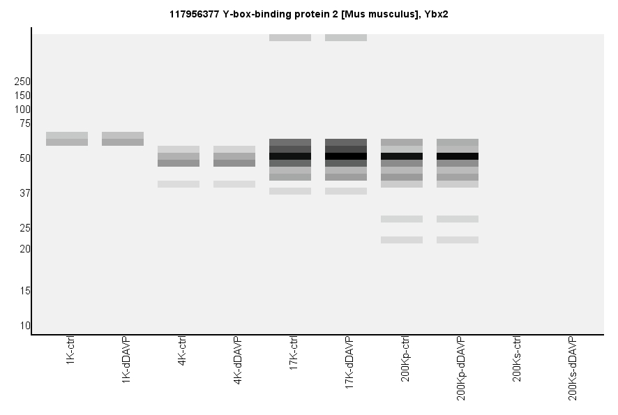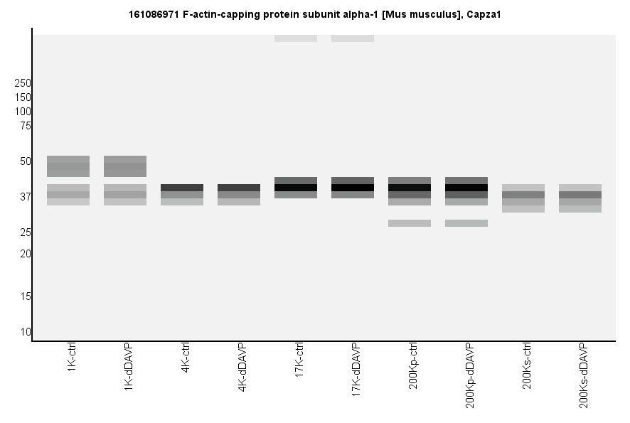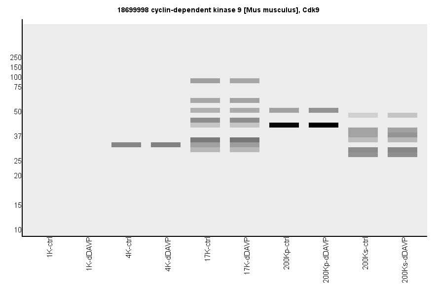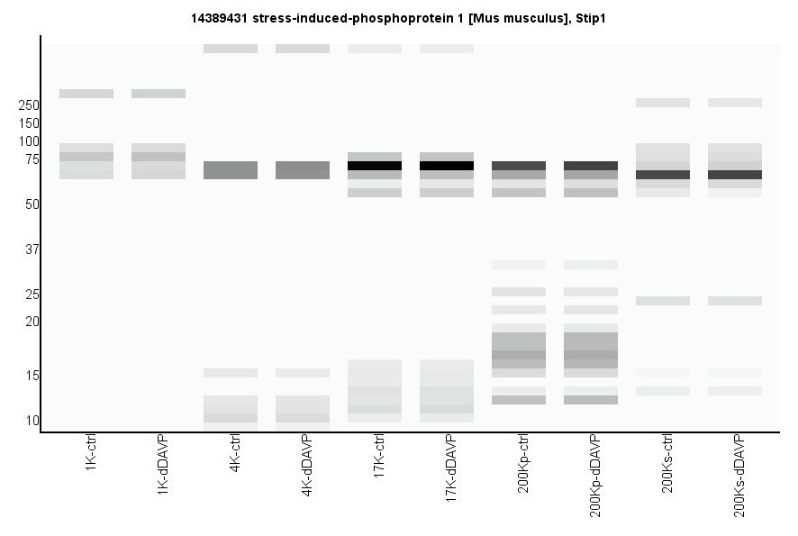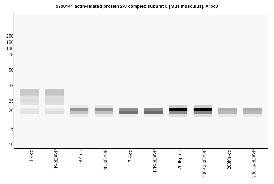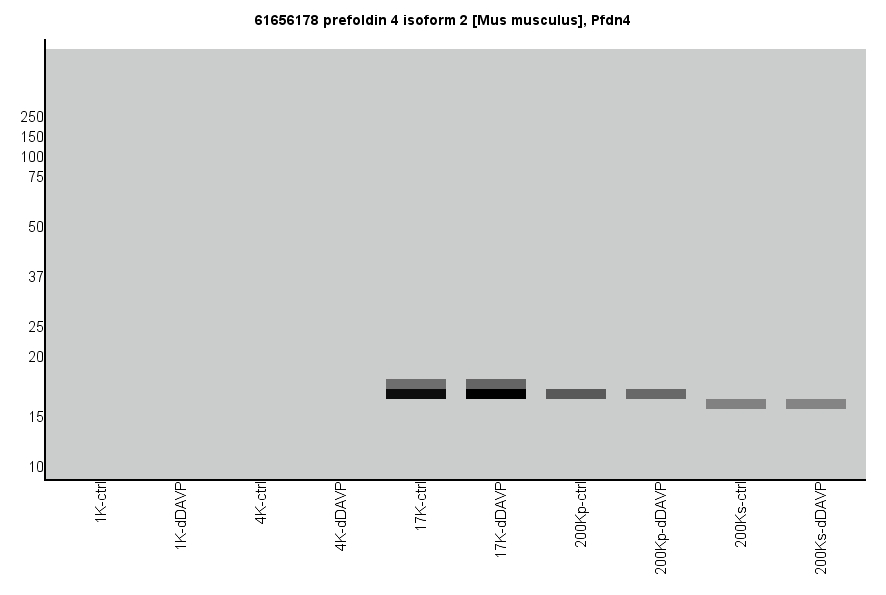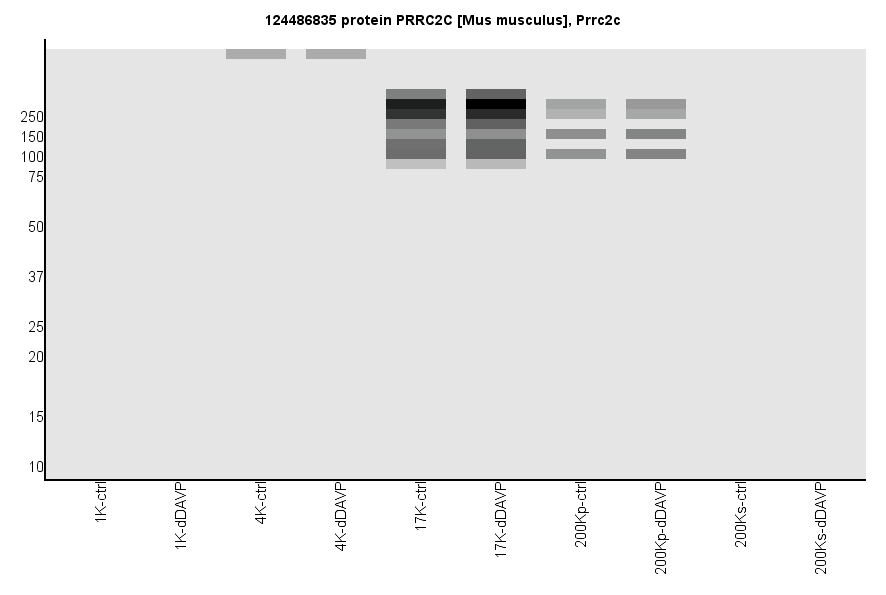 The virtual western blot images show data normalized using a logarithmic conversion scale to map peptide intensities to gray-scale levels. Using this conversion method, low-abundance peptides are generally visible in the blot images. Switch back to the default linear conversion scale database page.