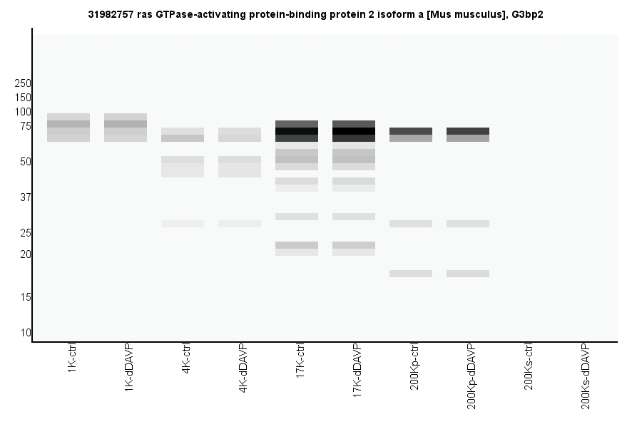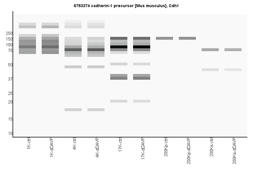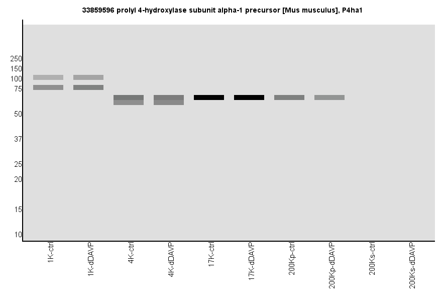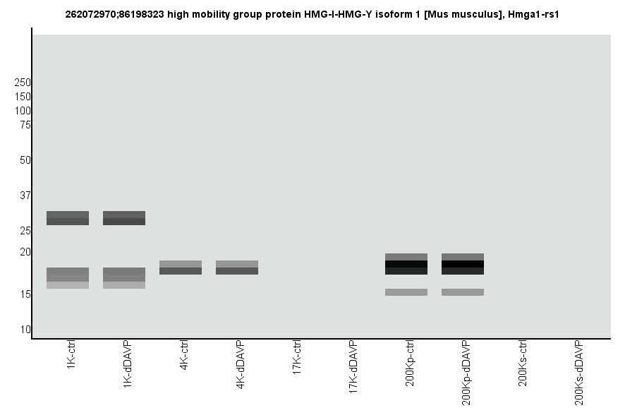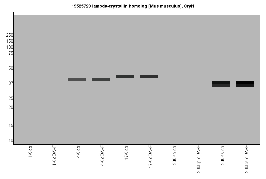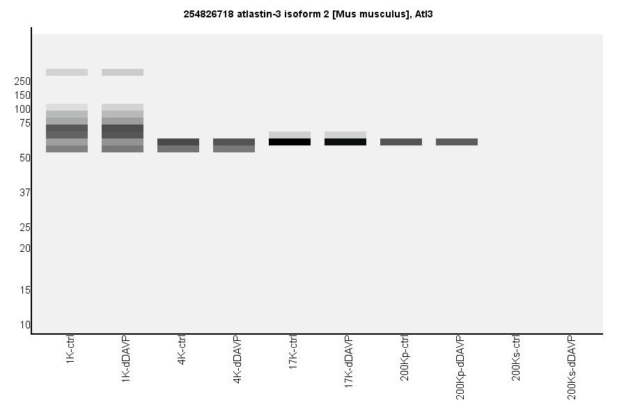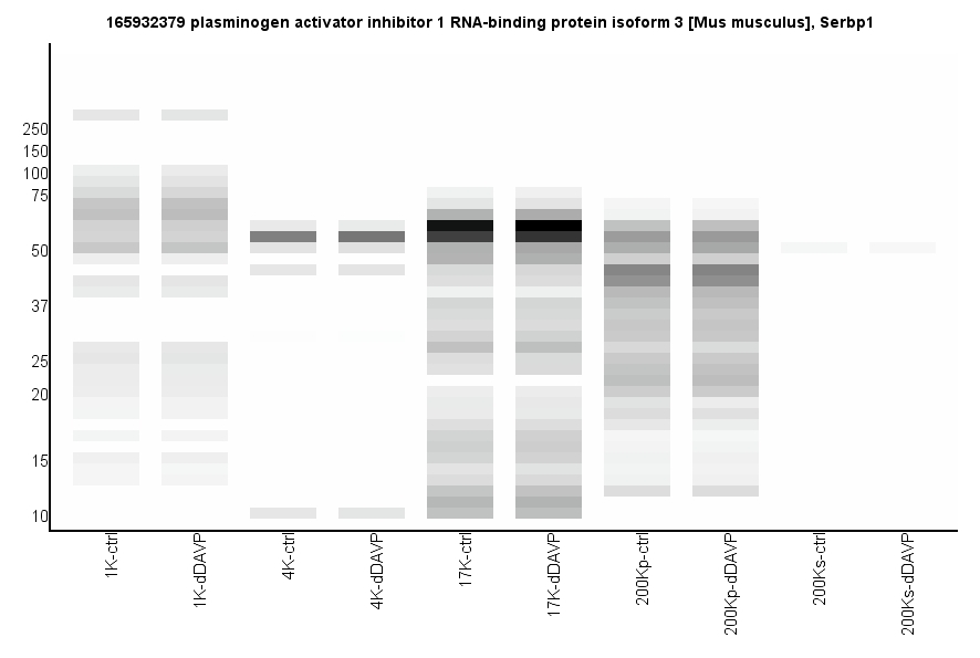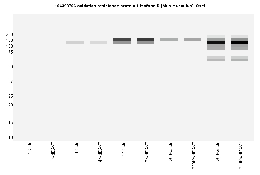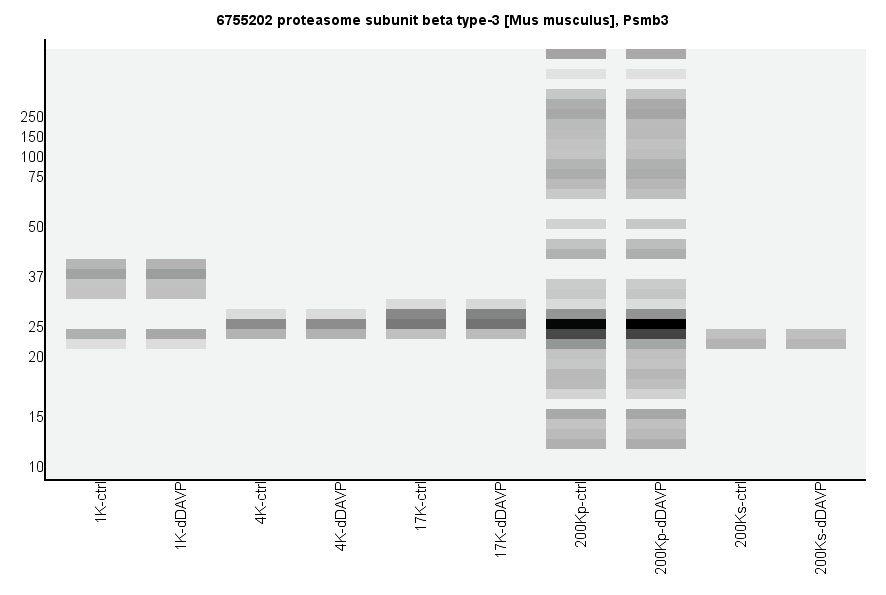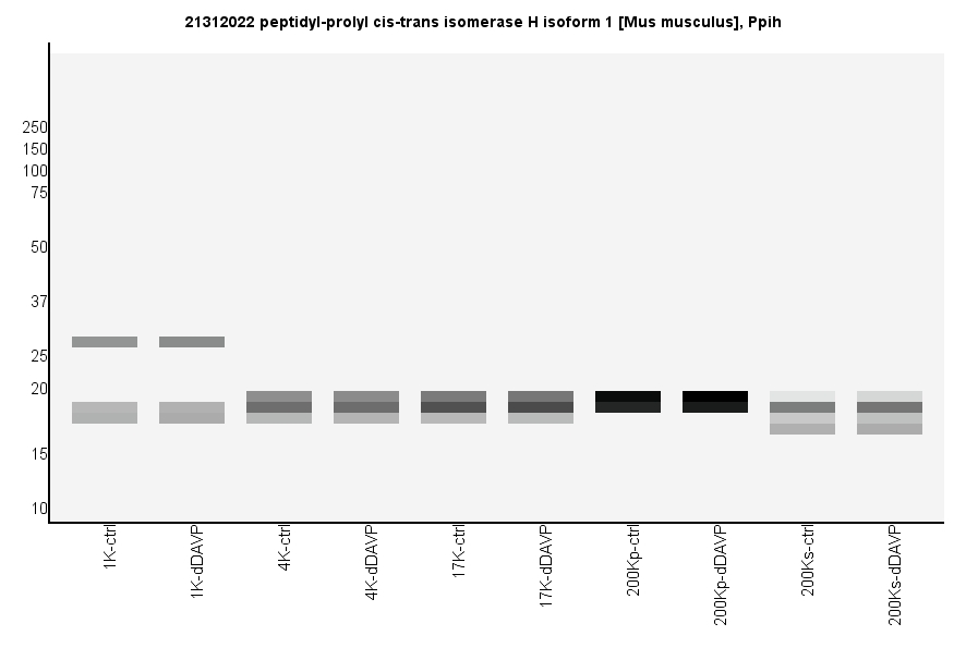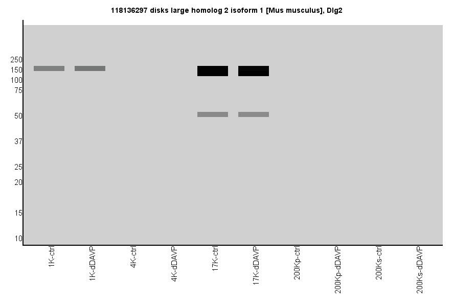 The virtual western blot images show data normalized using a logarithmic conversion scale to map peptide intensities to gray-scale levels. Using this conversion method, low-abundance peptides are generally visible in the blot images. Switch back to the default linear conversion scale database page.
