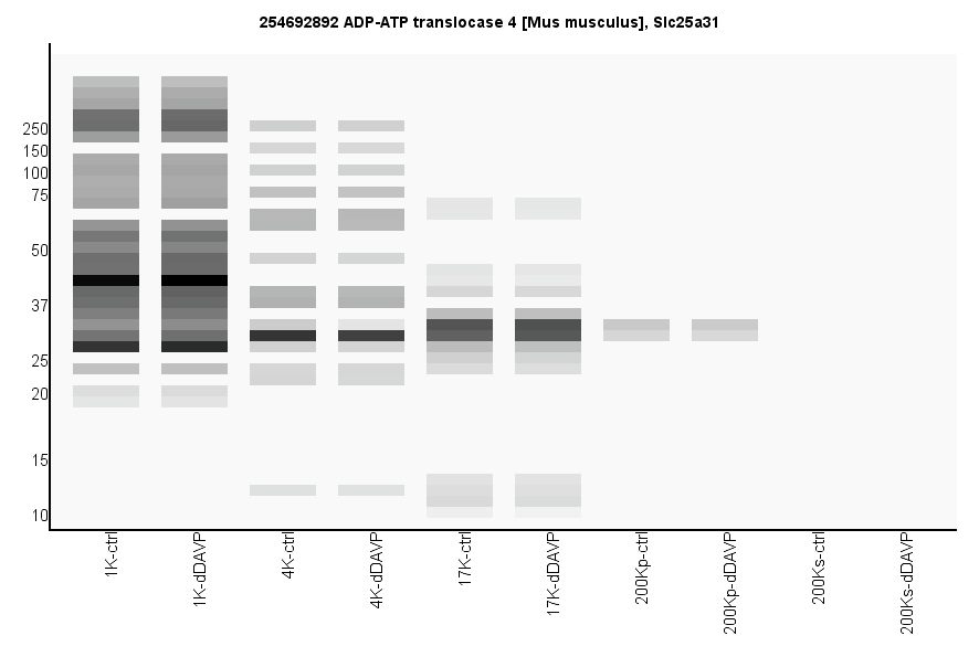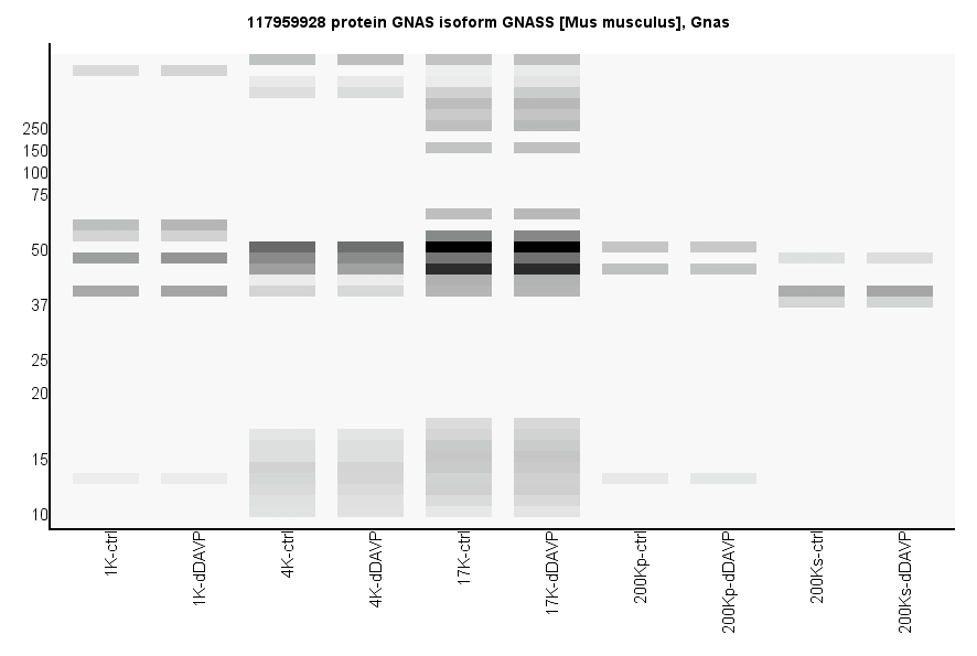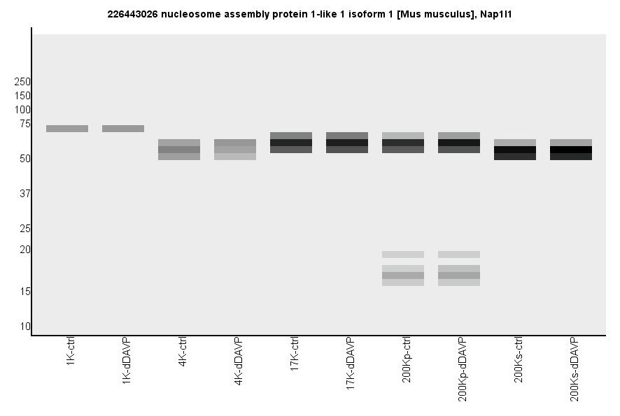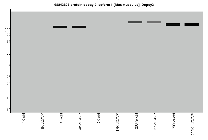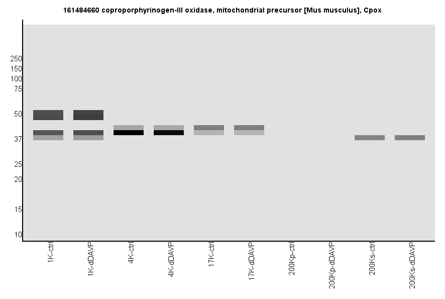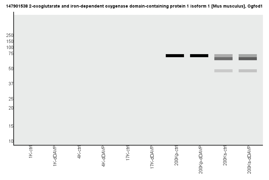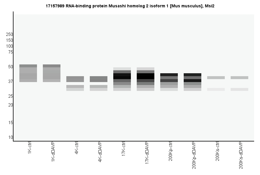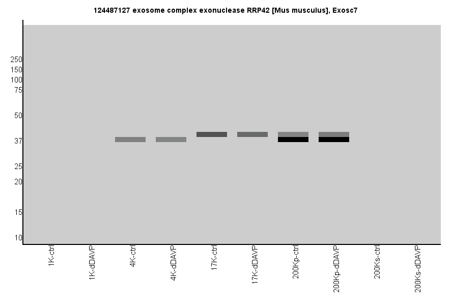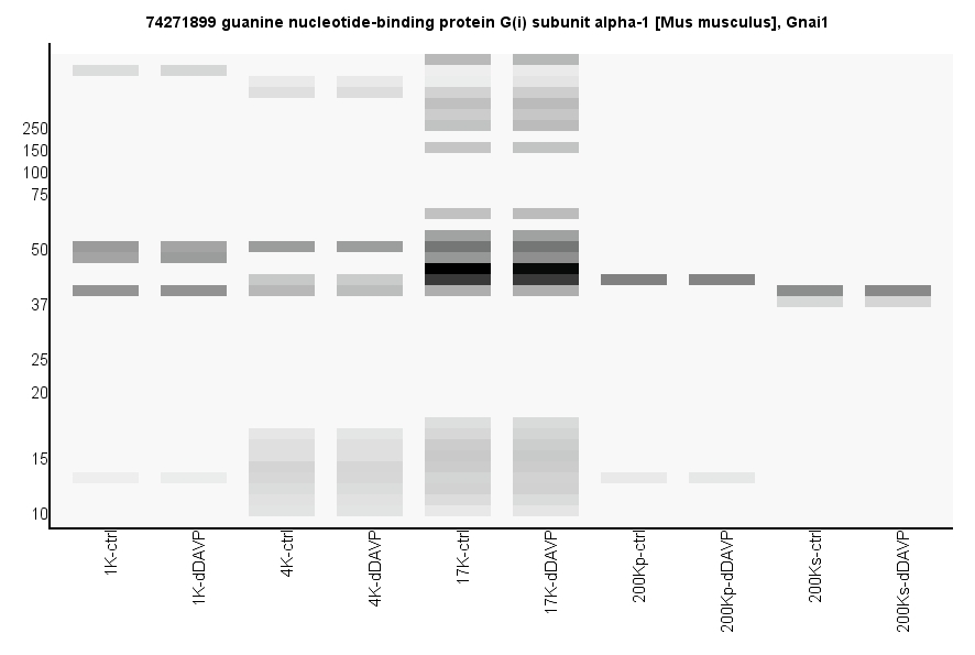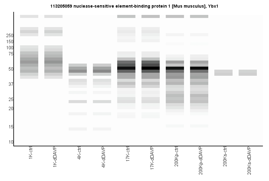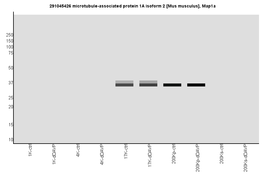 The virtual western blot images show data normalized using a logarithmic conversion scale to map peptide intensities to gray-scale levels. Using this conversion method, low-abundance peptides are generally visible in the blot images. Switch back to the default linear conversion scale database page.