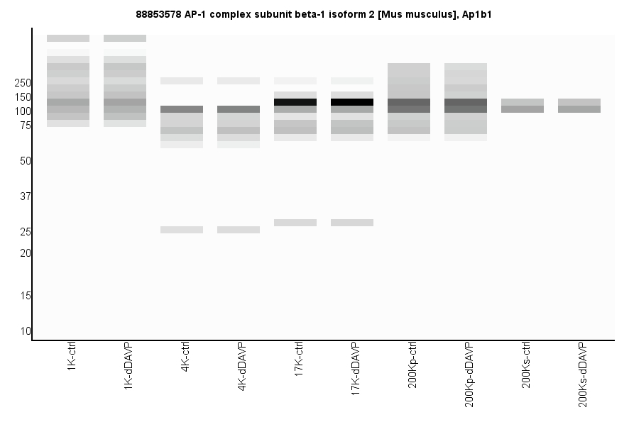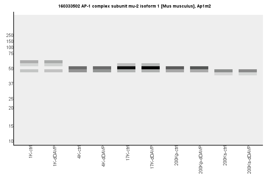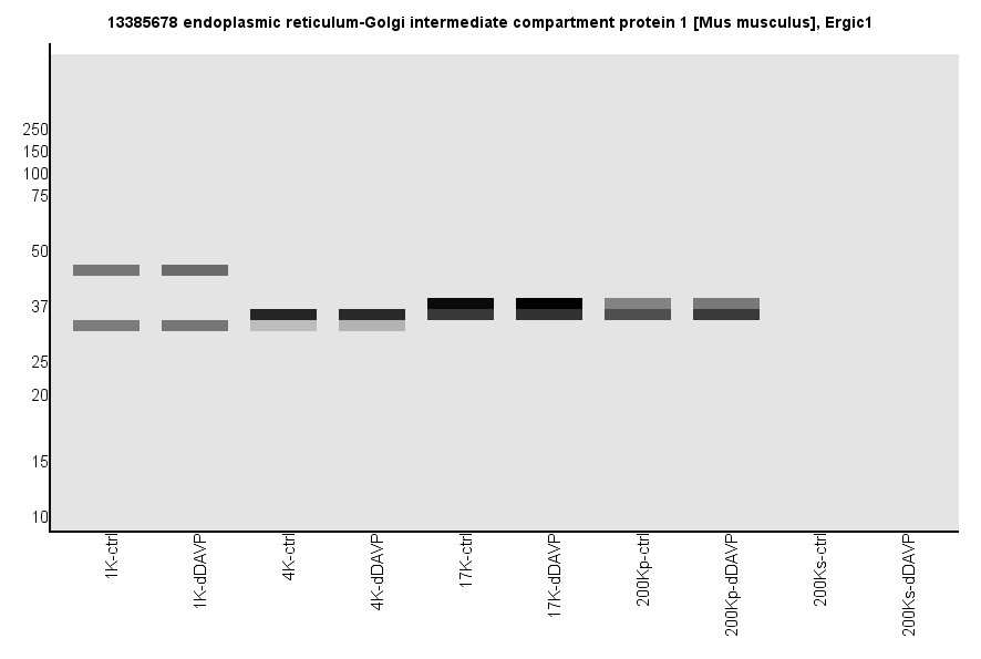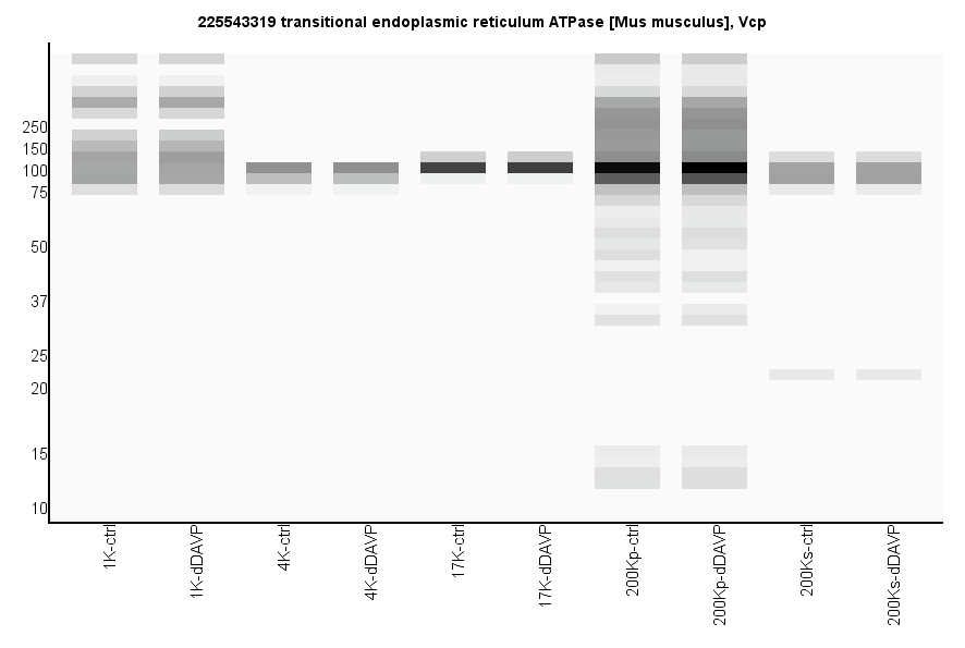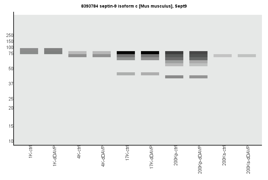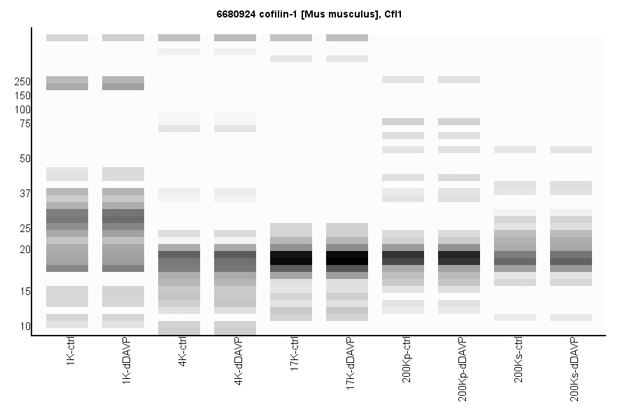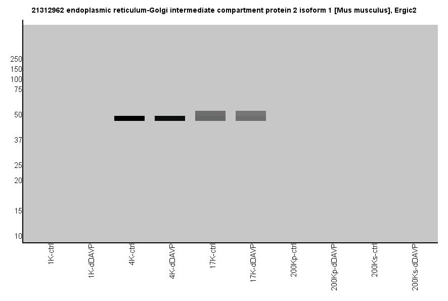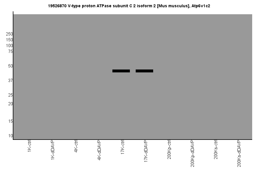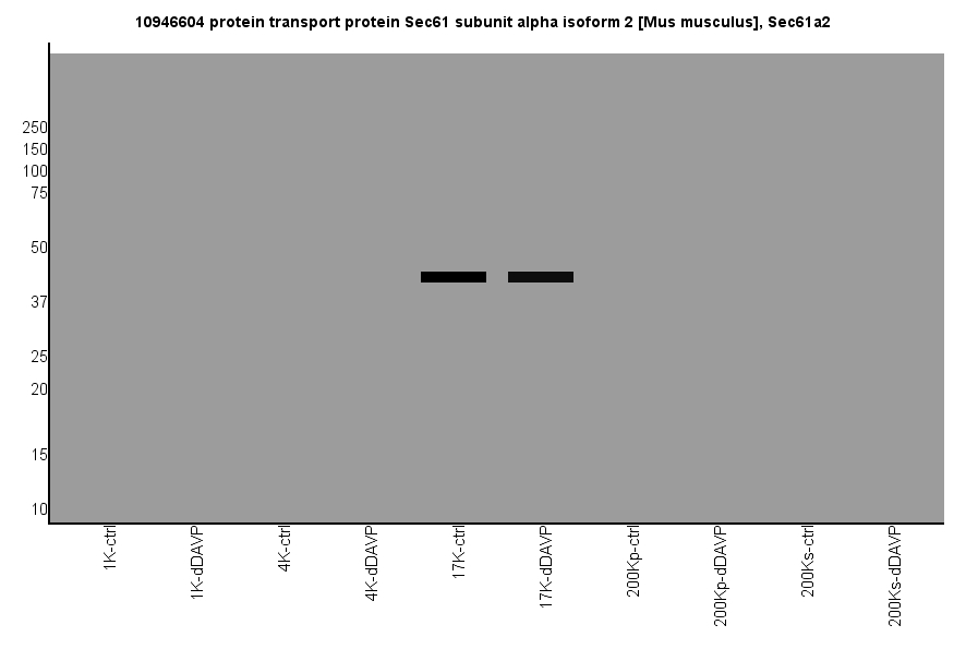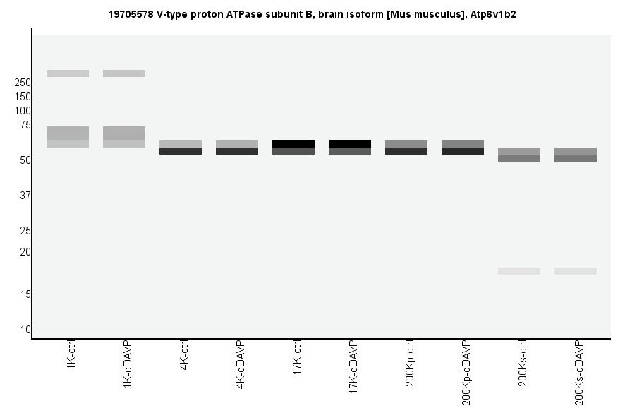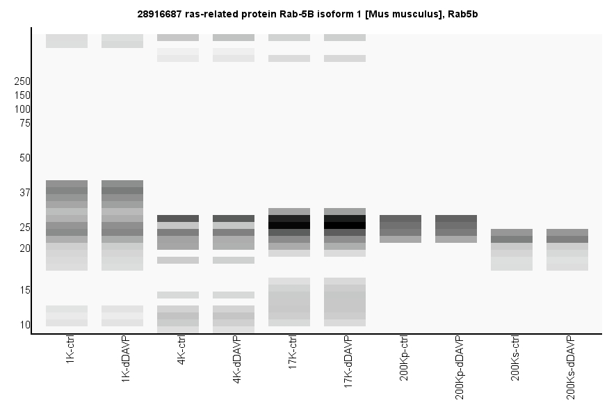 Here, we report large-scale quantification of proteins using LC-MS/MS of subcellular fractions from differential centrifugation in vasopressin- and vehicle-treated mouse mpkCCD cells. Quantification was done by SILAC. Cells treated with the vasopressin analog dDAVP (heavy) or vehicle (light) were mixed 1:1 prior to homogenization and fractionation by differential centrifugation. Fractions were subjected to SDS-PAGE, trypsinization and quantification by LC-MS/MS. Differential centrifugation fractions: 1000 Xg pellet (1K), 4000 Xg pellet (4K), 17,000 Xg pellet (17K), 200,000 Xg pellet (200Kp), and 200,000 Xg supernatant (200Ks). Cells were exposed to vasopressin analog dDAVP at 0.1 nM for 30 minutes. Because each differential centrifugation fraction was resolved by SDS-PAGE and 43 consecutive gel slices were analyzed by MS analysis, the derived data set contains information about the apparent molecular weights of all proteins identified. Such data can be examined individually for each protein by viewing the virtual western blots by mouse over the GI Number at the left. Here, we analyze apparent molecular weights in the entire population of proteins identified compared to the calculated molecular weights obtained from the RefSeq protein records.
