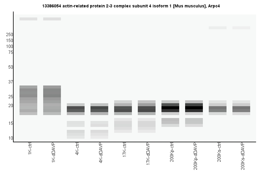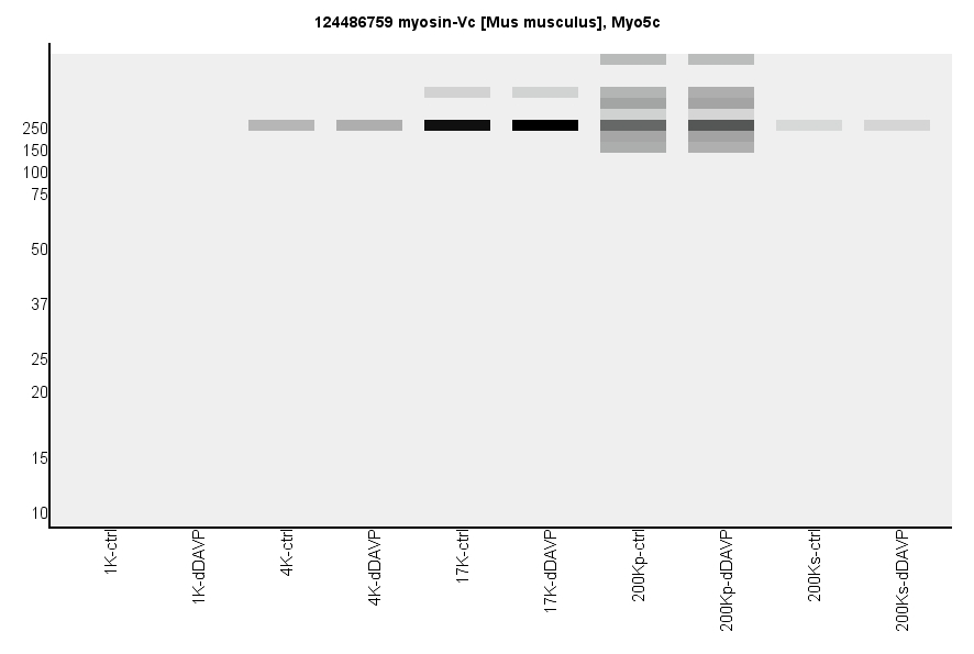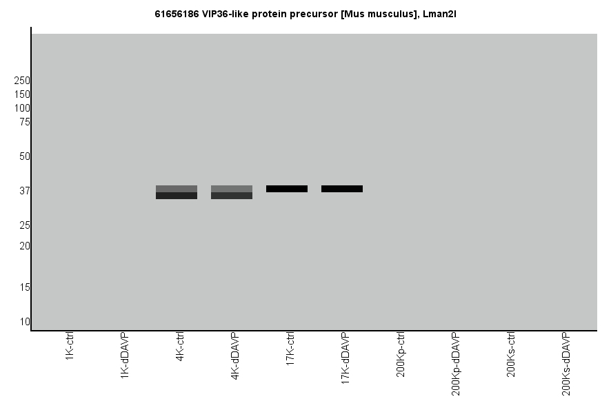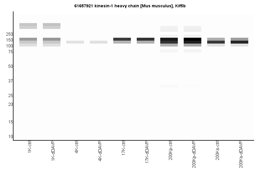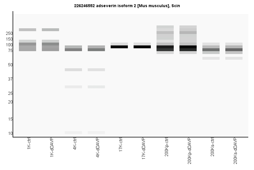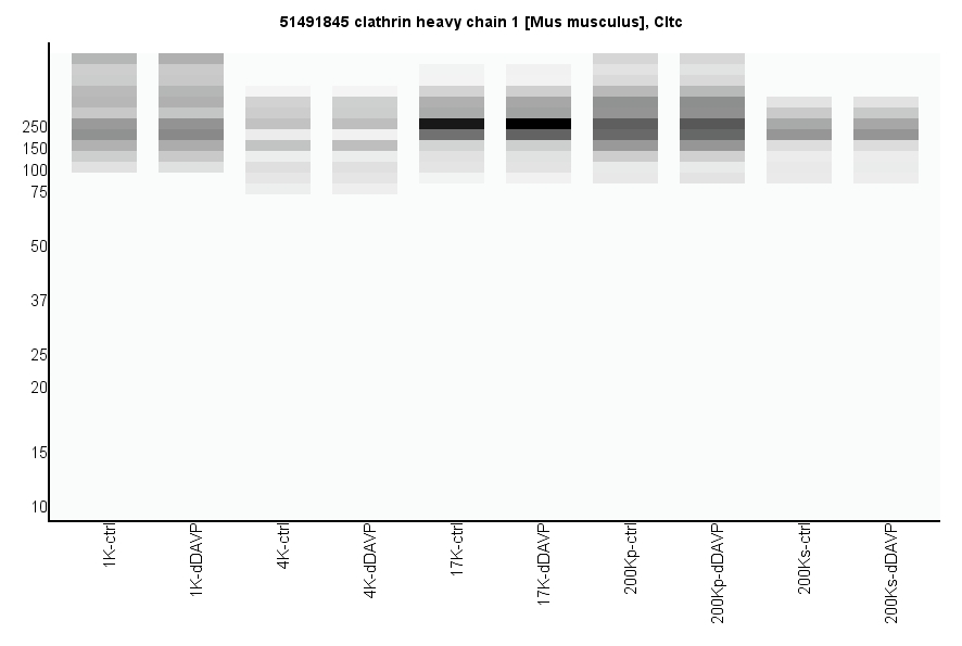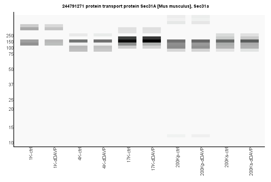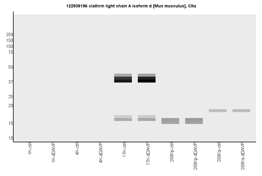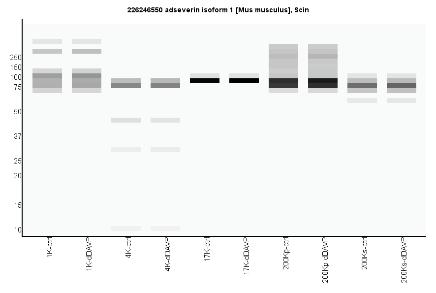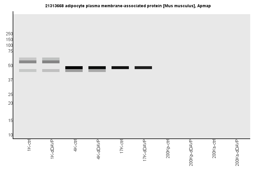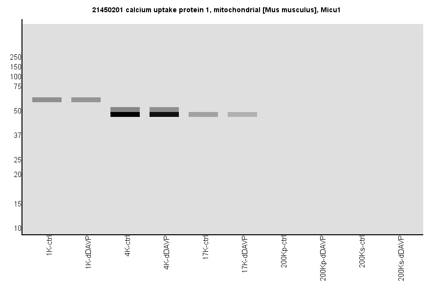 Here, we report large-scale quantification of proteins using LC-MS/MS of subcellular fractions from differential centrifugation in vasopressin- and vehicle-treated mouse mpkCCD cells. Quantification was done by SILAC. Cells treated with the vasopressin analog dDAVP (heavy) or vehicle (light) were mixed 1:1 prior to homogenization and fractionation by differential centrifugation. Fractions were subjected to SDS-PAGE, trypsinization and quantification by LC-MS/MS. Differential centrifugation fractions: 1000 Xg pellet (1K), 4000 Xg pellet (4K), 17,000 Xg pellet (17K), 200,000 Xg pellet (200Kp), and 200,000 Xg supernatant (200Ks). Cells were exposed to vasopressin analog dDAVP at 0.1 nM for 30 minutes. Because each differential centrifugation fraction was resolved by SDS-PAGE and 43 consecutive gel slices were analyzed by MS analysis, the derived data set contains information about the apparent molecular weights of all proteins identified. Such data can be examined individually for each protein by viewing the virtual western blots by mouse over the GI Number at the left. Here, we analyze apparent molecular weights in the entire population of proteins identified compared to the calculated molecular weights obtained from the RefSeq protein records.