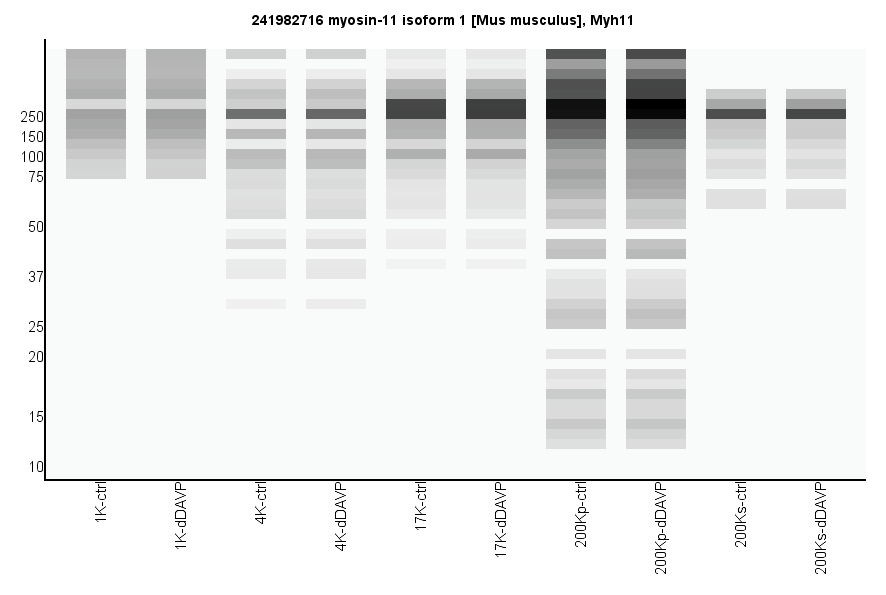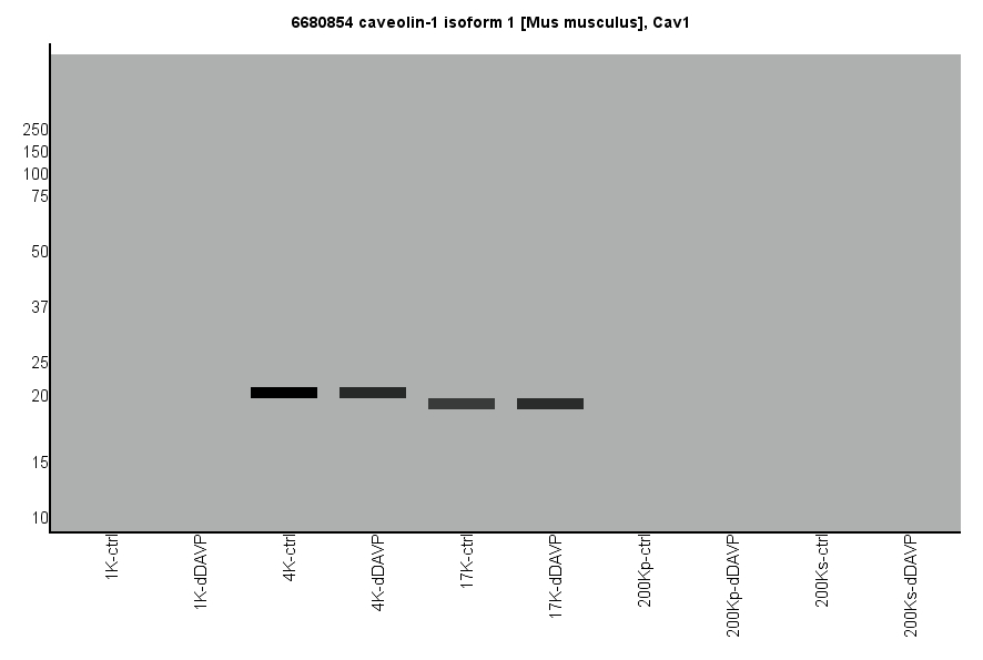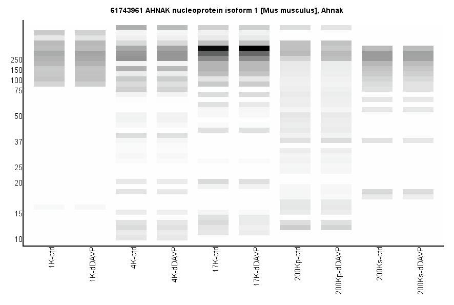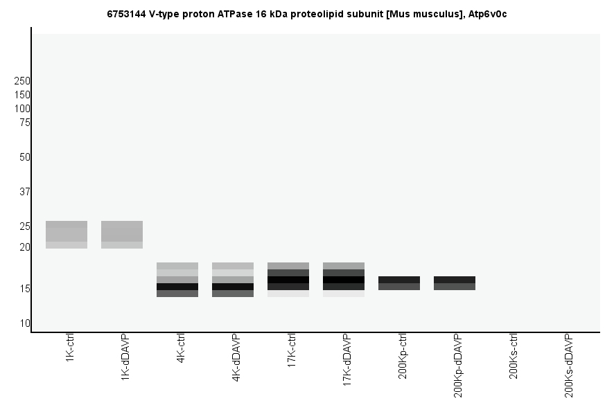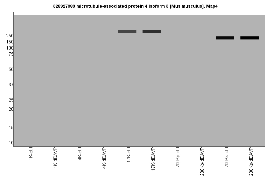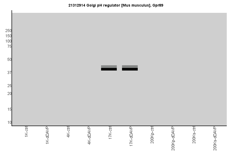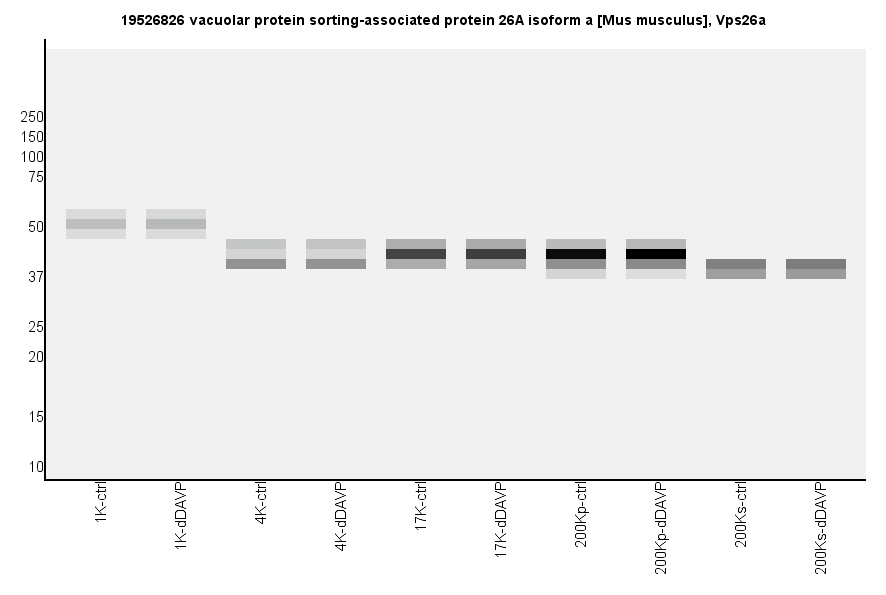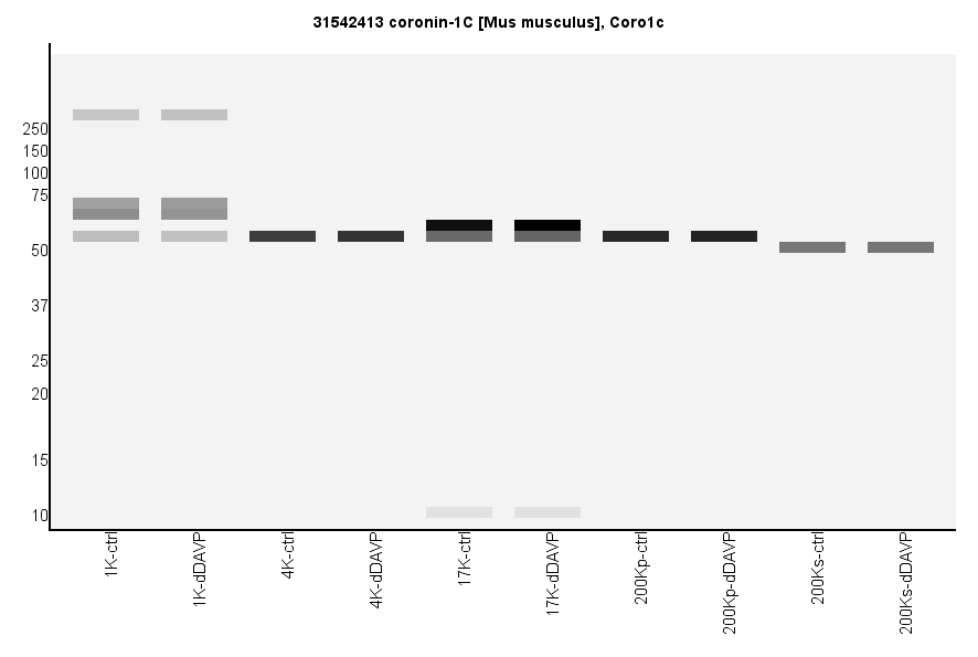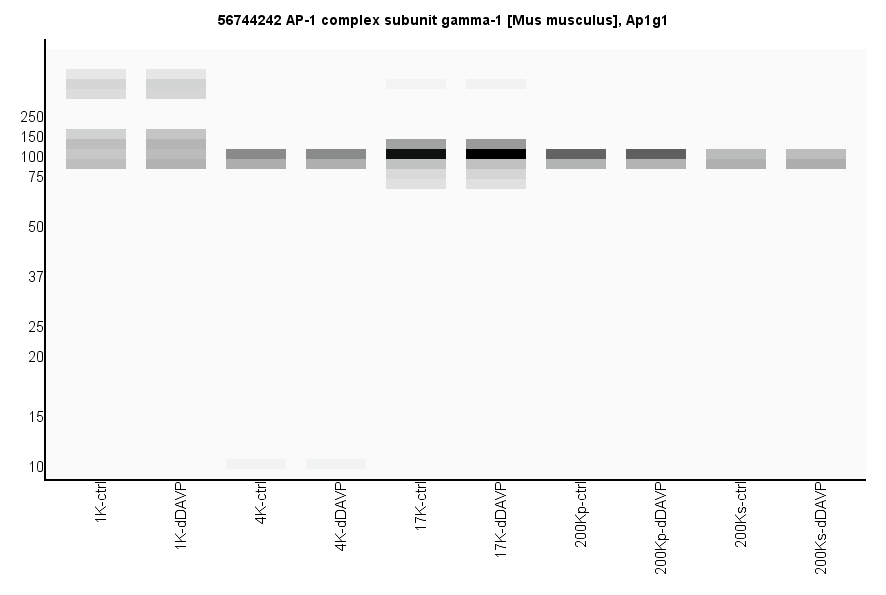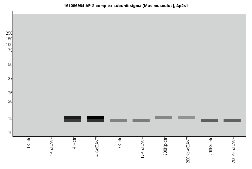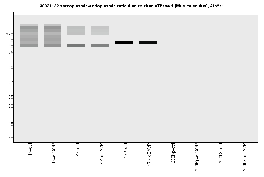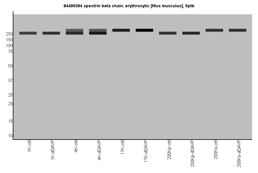 Here, we report large-scale quantification of proteins using LC-MS/MS of subcellular fractions from differential centrifugation in vasopressin- and vehicle-treated mouse mpkCCD cells. Quantification was done by SILAC. Cells treated with the vasopressin analog dDAVP (heavy) or vehicle (light) were mixed 1:1 prior to homogenization and fractionation by differential centrifugation. Fractions were subjected to SDS-PAGE, trypsinization and quantification by LC-MS/MS. Differential centrifugation fractions: 1000 Xg pellet (1K), 4000 Xg pellet (4K), 17,000 Xg pellet (17K), 200,000 Xg pellet (200Kp), and 200,000 Xg supernatant (200Ks). Cells were exposed to vasopressin analog dDAVP at 0.1 nM for 30 minutes. Because each differential centrifugation fraction was resolved by SDS-PAGE and 43 consecutive gel slices were analyzed by MS analysis, the derived data set contains information about the apparent molecular weights of all proteins identified. Such data can be examined individually for each protein by viewing the virtual western blots by mouse over the GI Number at the left. Here, we analyze apparent molecular weights in the entire population of proteins identified compared to the calculated molecular weights obtained from the RefSeq protein records.