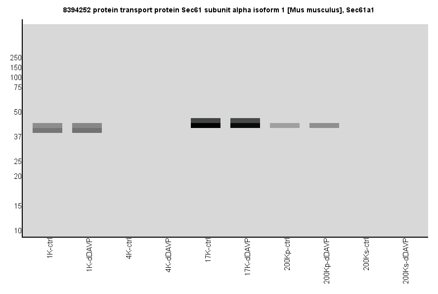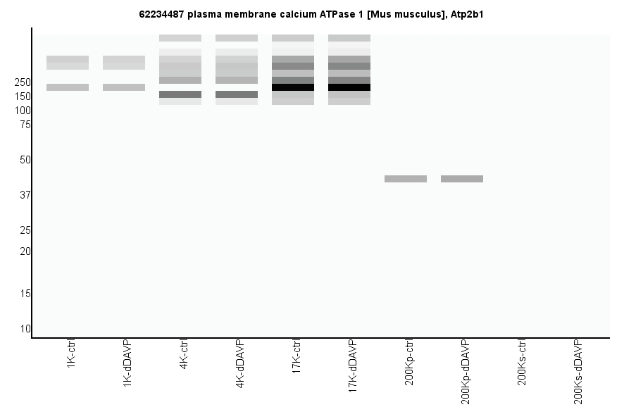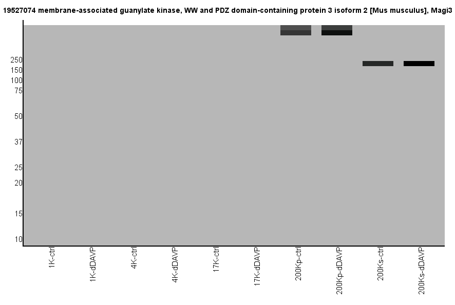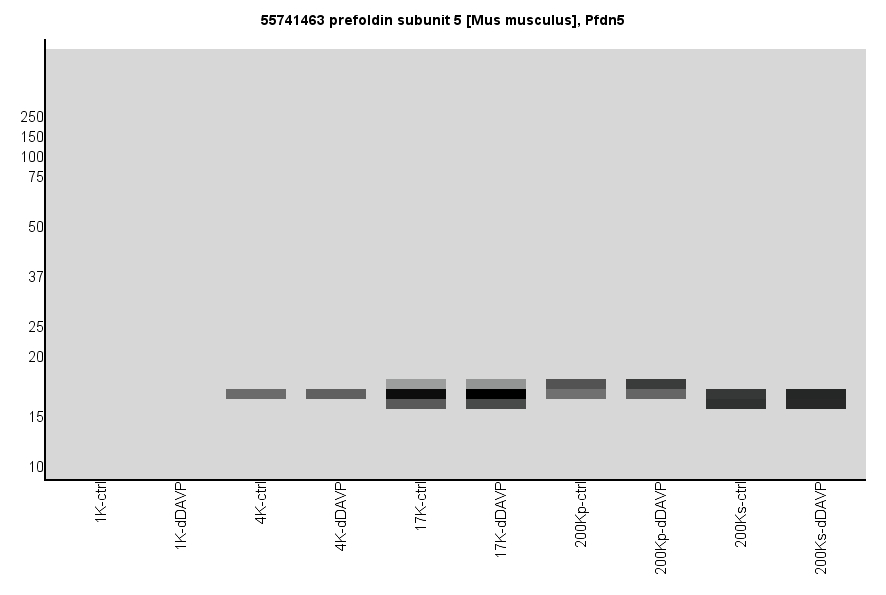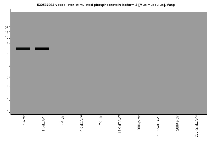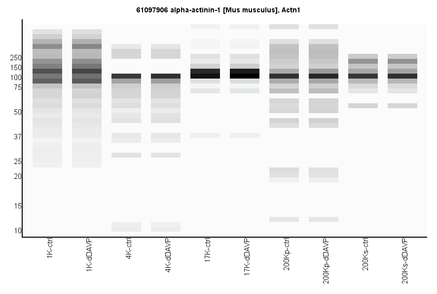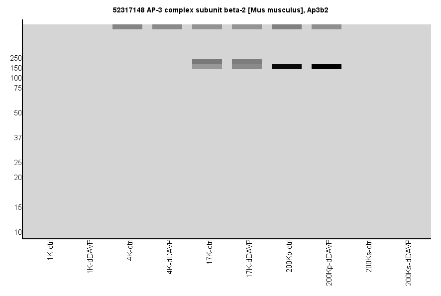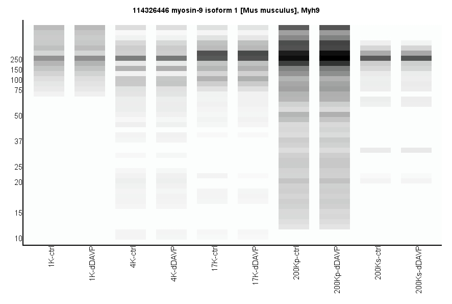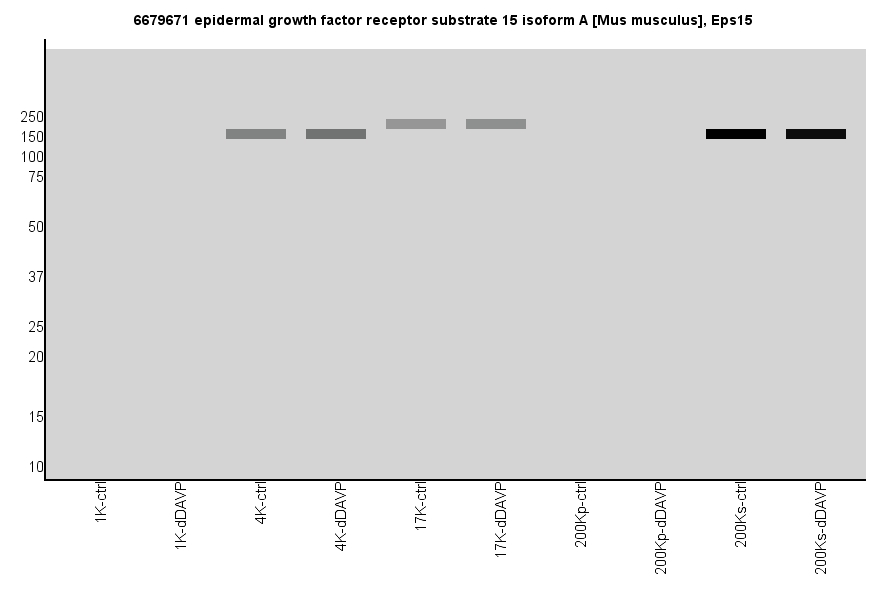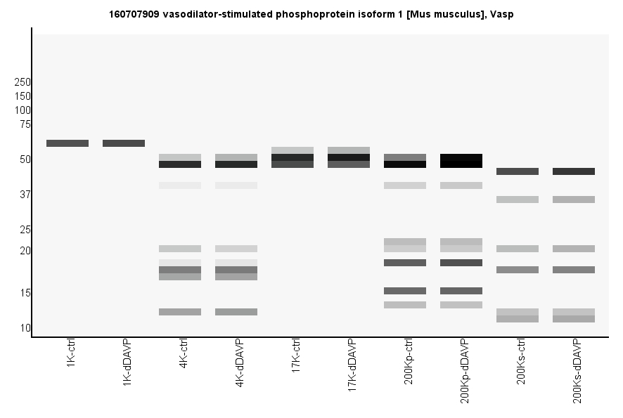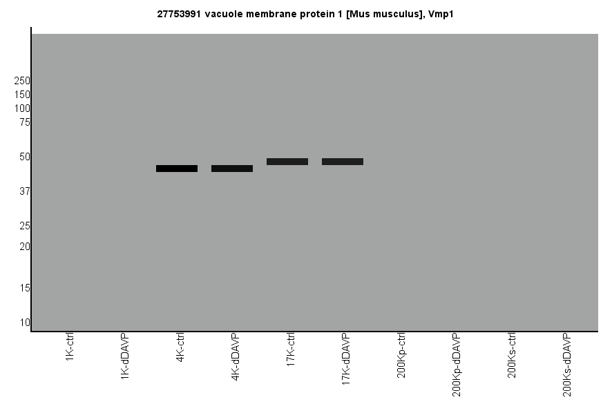 Here, we report large-scale quantification of proteins using LC-MS/MS of subcellular fractions from differential centrifugation in vasopressin- and vehicle-treated mouse mpkCCD cells. Quantification was done by SILAC. Cells treated with the vasopressin analog dDAVP (heavy) or vehicle (light) were mixed 1:1 prior to homogenization and fractionation by differential centrifugation. Fractions were subjected to SDS-PAGE, trypsinization and quantification by LC-MS/MS. Differential centrifugation fractions: 1000 Xg pellet (1K), 4000 Xg pellet (4K), 17,000 Xg pellet (17K), 200,000 Xg pellet (200Kp), and 200,000 Xg supernatant (200Ks). Cells were exposed to vasopressin analog dDAVP at 0.1 nM for 30 minutes. Because each differential centrifugation fraction was resolved by SDS-PAGE and 43 consecutive gel slices were analyzed by MS analysis, the derived data set contains information about the apparent molecular weights of all proteins identified. Such data can be examined individually for each protein by viewing the virtual western blots by mouse over the GI Number at the left. Here, we analyze apparent molecular weights in the entire population of proteins identified compared to the calculated molecular weights obtained from the RefSeq protein records.