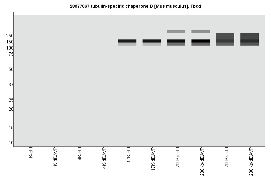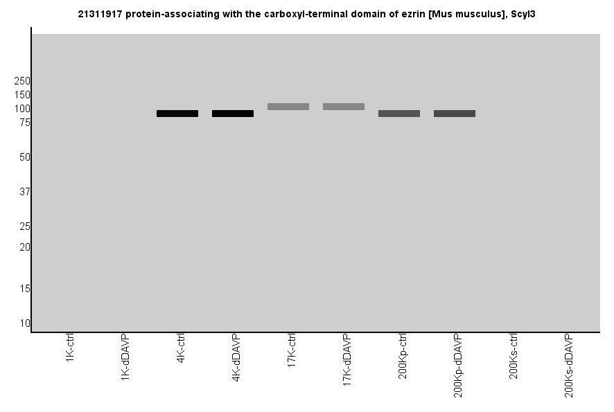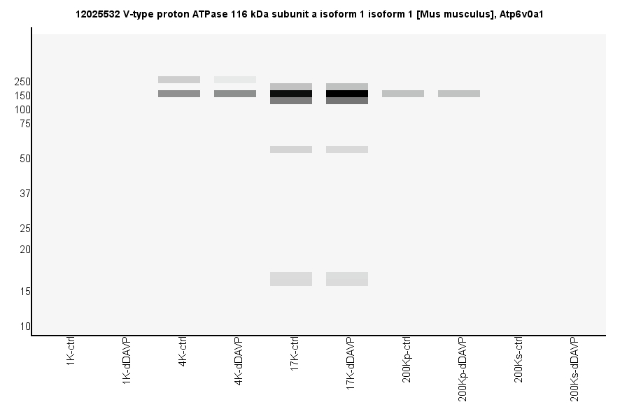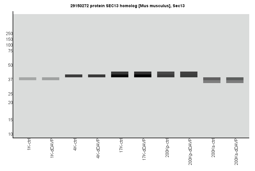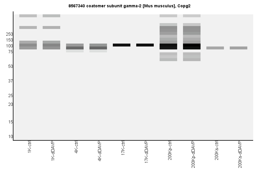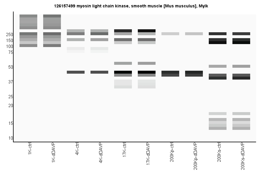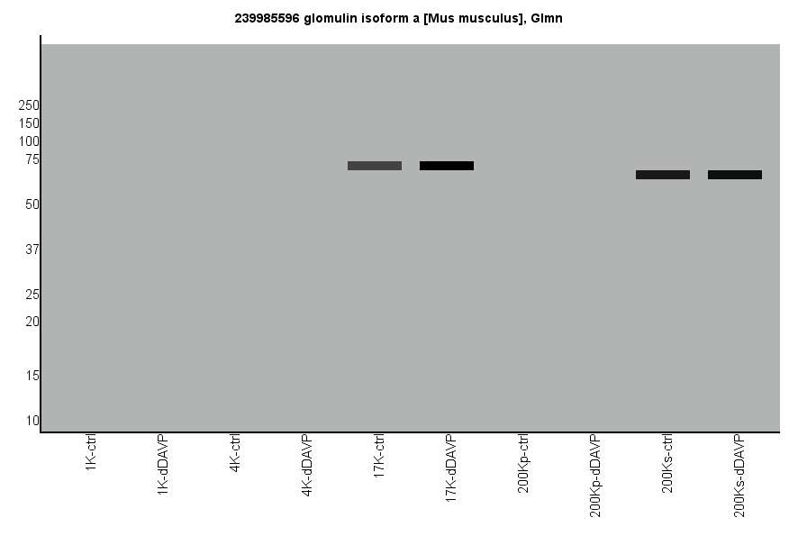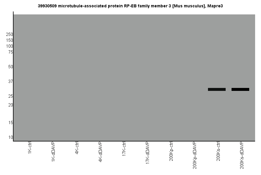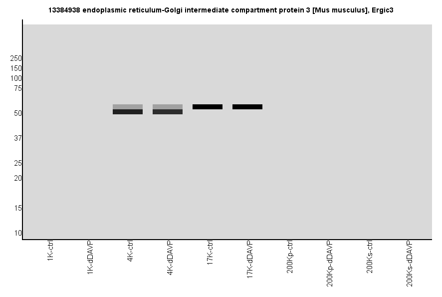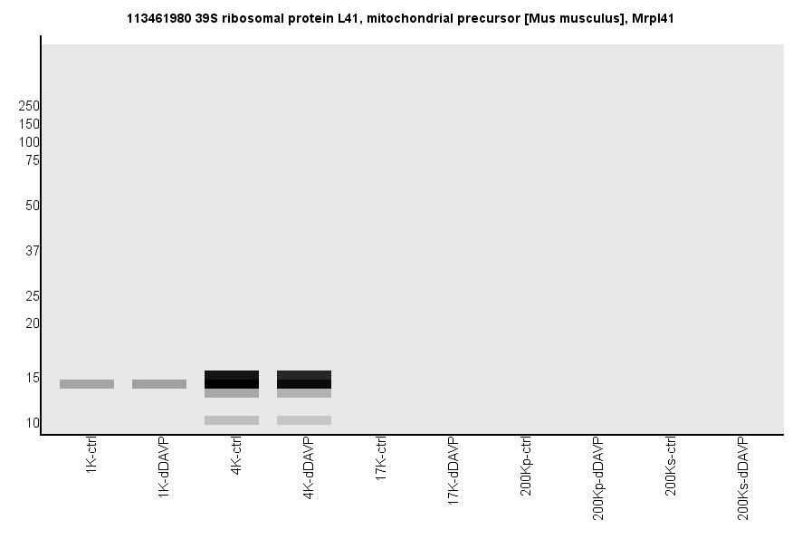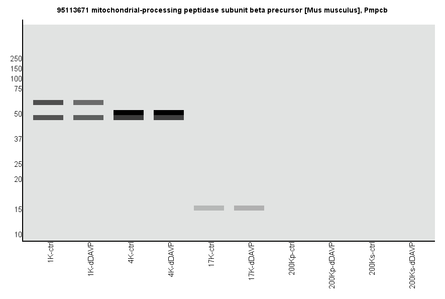 Here, we report large-scale quantification of proteins using LC-MS/MS of subcellular fractions from differential centrifugation in vasopressin- and vehicle-treated mouse mpkCCD cells. Quantification was done by SILAC. Cells treated with the vasopressin analog dDAVP (heavy) or vehicle (light) were mixed 1:1 prior to homogenization and fractionation by differential centrifugation. Fractions were subjected to SDS-PAGE, trypsinization and quantification by LC-MS/MS. Differential centrifugation fractions: 1000 Xg pellet (1K), 4000 Xg pellet (4K), 17,000 Xg pellet (17K), 200,000 Xg pellet (200Kp), and 200,000 Xg supernatant (200Ks). Cells were exposed to vasopressin analog dDAVP at 0.1 nM for 30 minutes. Because each differential centrifugation fraction was resolved by SDS-PAGE and 43 consecutive gel slices were analyzed by MS analysis, the derived data set contains information about the apparent molecular weights of all proteins identified. Such data can be examined individually for each protein by viewing the virtual western blots by mouse over the GI Number at the left. Here, we analyze apparent molecular weights in the entire population of proteins identified compared to the calculated molecular weights obtained from the RefSeq protein records.