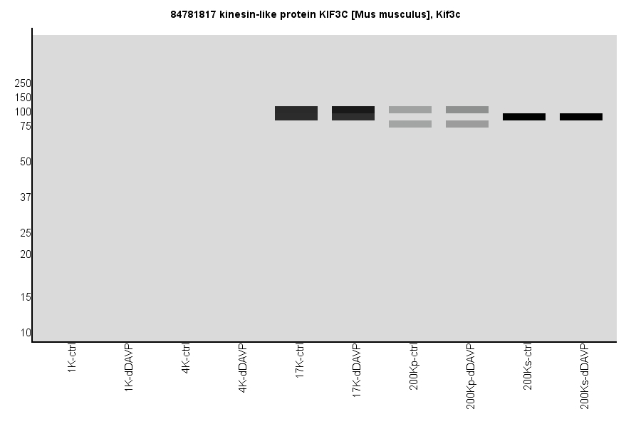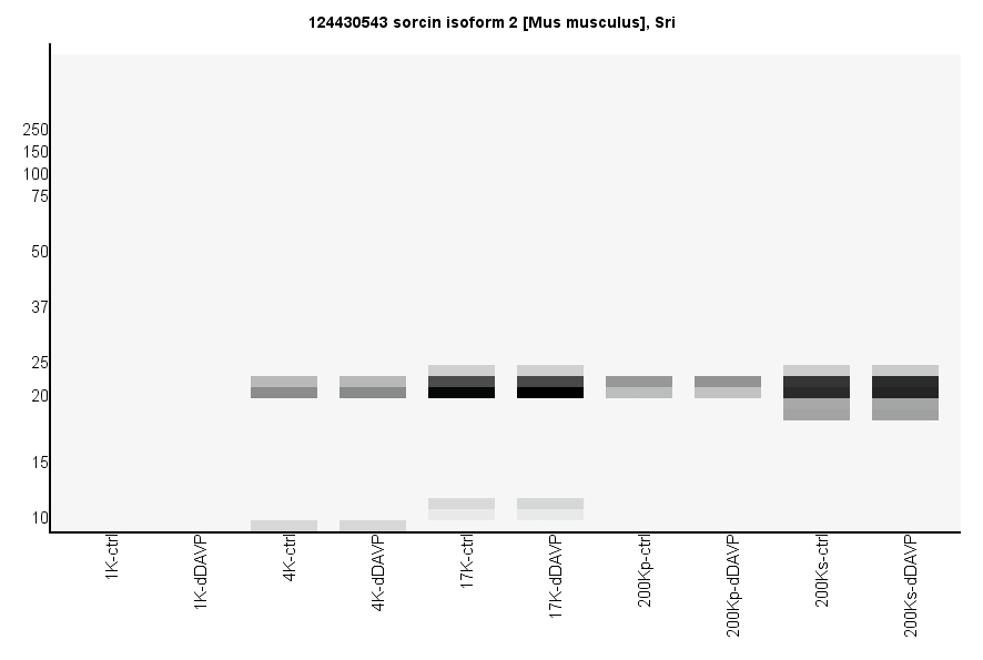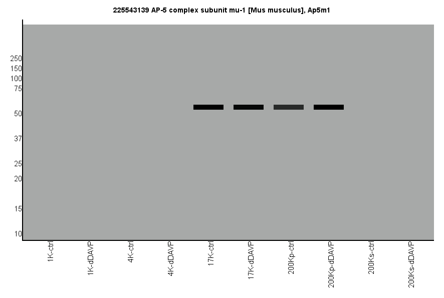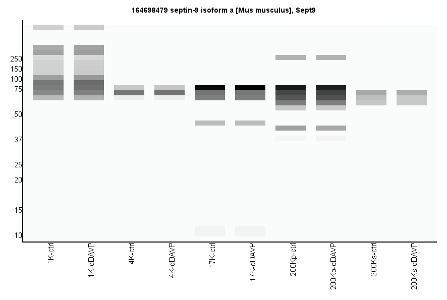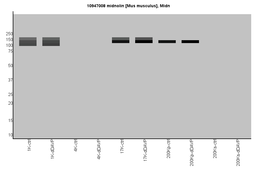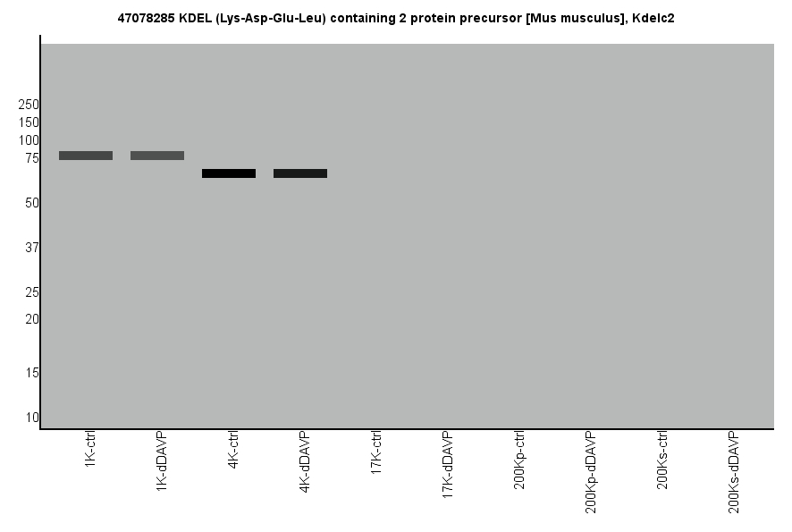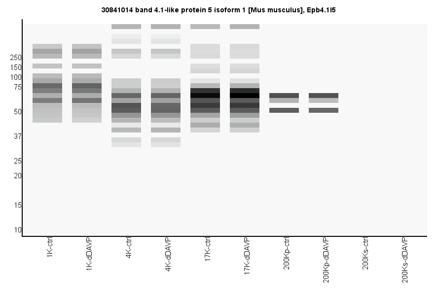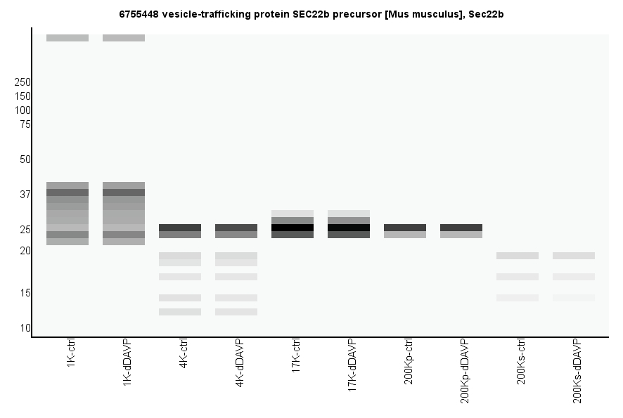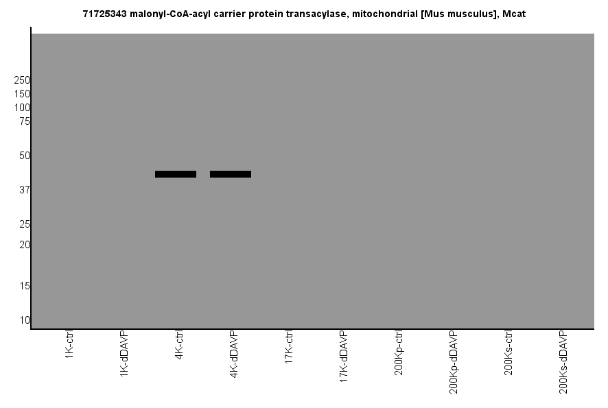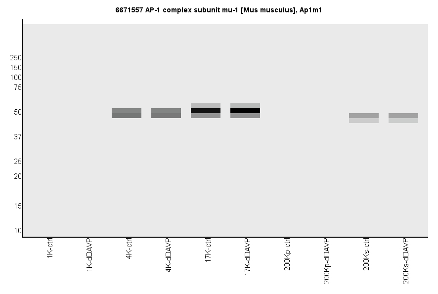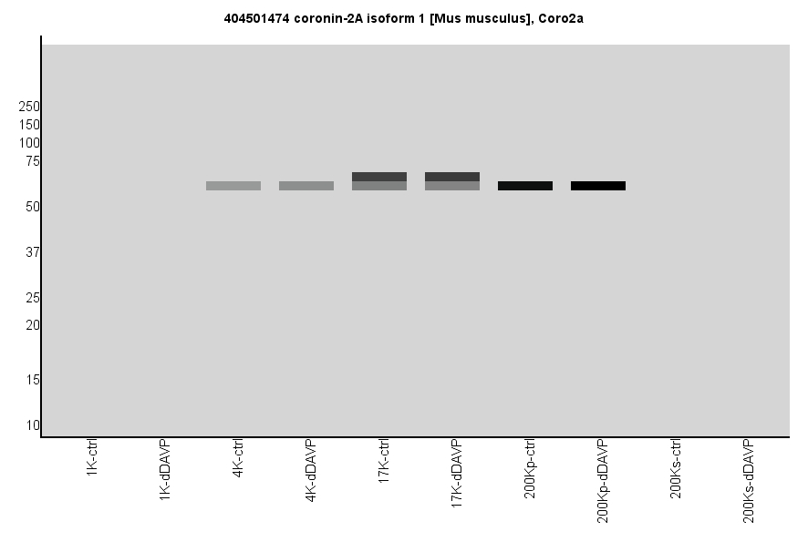 Here, we report large-scale quantification of proteins using LC-MS/MS of subcellular fractions from differential centrifugation in vasopressin- and vehicle-treated mouse mpkCCD cells. Quantification was done by SILAC. Cells treated with the vasopressin analog dDAVP (heavy) or vehicle (light) were mixed 1:1 prior to homogenization and fractionation by differential centrifugation. Fractions were subjected to SDS-PAGE, trypsinization and quantification by LC-MS/MS. Differential centrifugation fractions: 1000 Xg pellet (1K), 4000 Xg pellet (4K), 17,000 Xg pellet (17K), 200,000 Xg pellet (200Kp), and 200,000 Xg supernatant (200Ks). Cells were exposed to vasopressin analog dDAVP at 0.1 nM for 30 minutes. Because each differential centrifugation fraction was resolved by SDS-PAGE and 43 consecutive gel slices were analyzed by MS analysis, the derived data set contains information about the apparent molecular weights of all proteins identified. Such data can be examined individually for each protein by viewing the virtual western blots by mouse over the GI Number at the left. Here, we analyze apparent molecular weights in the entire population of proteins identified compared to the calculated molecular weights obtained from the RefSeq protein records.