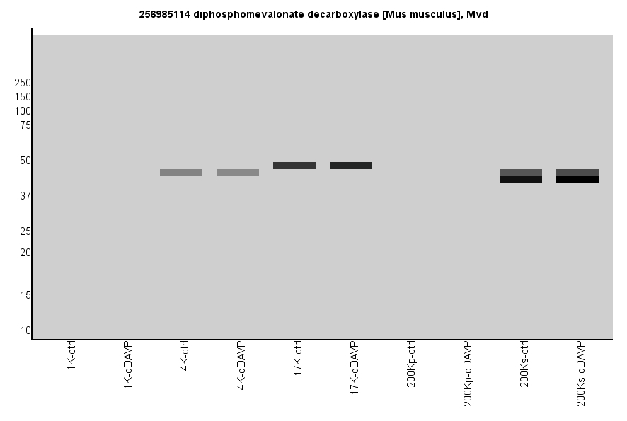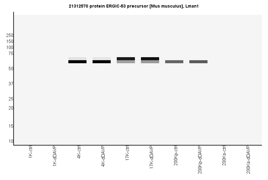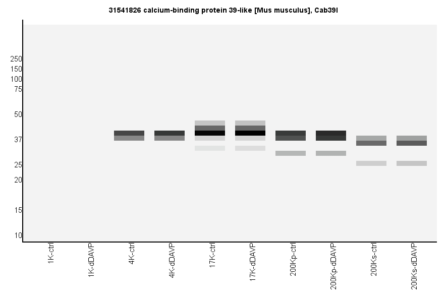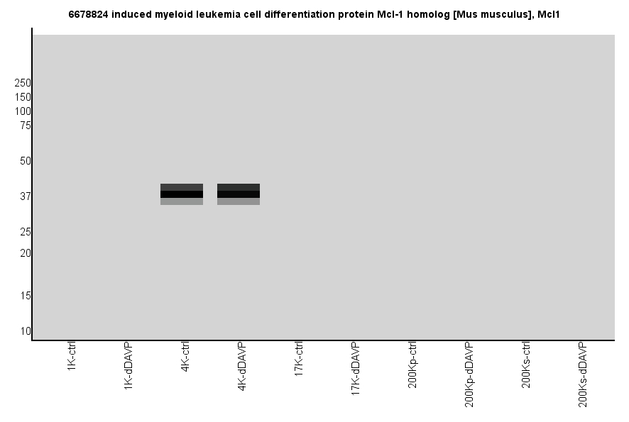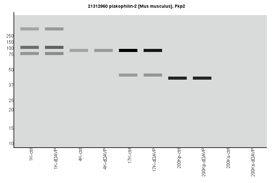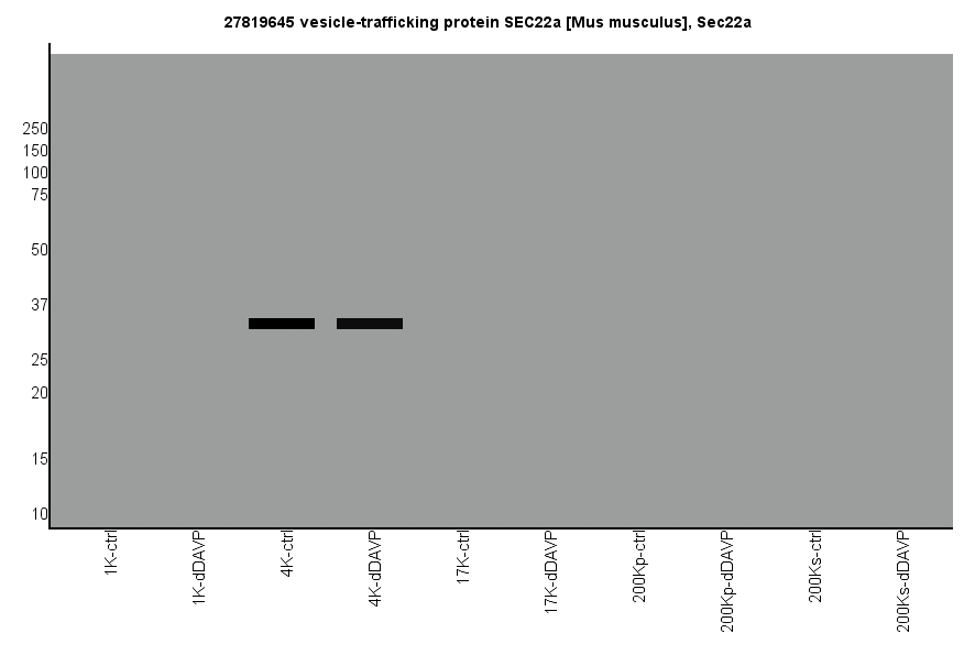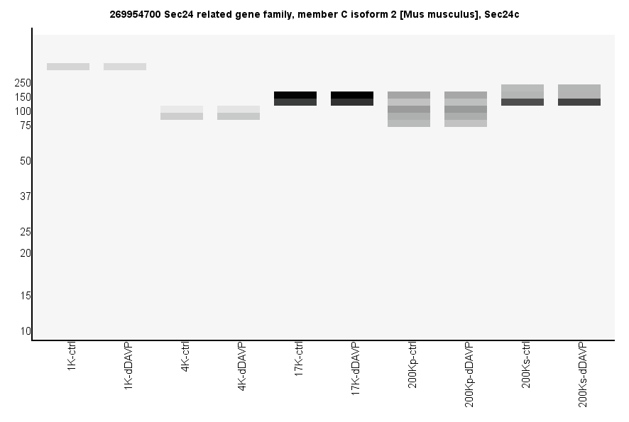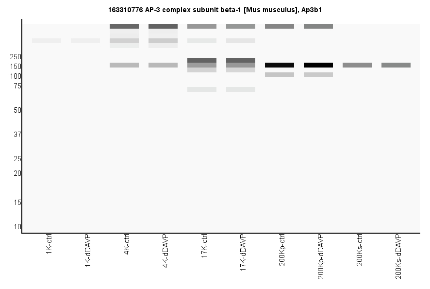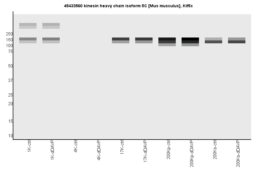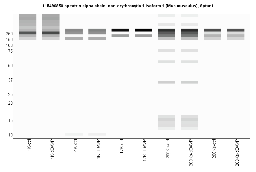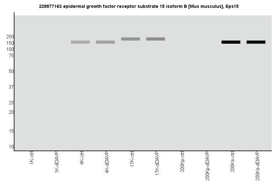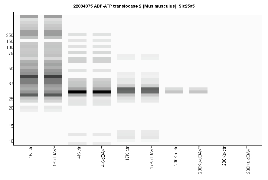 Here, we report large-scale quantification of proteins using LC-MS/MS of subcellular fractions from differential centrifugation in vasopressin- and vehicle-treated mouse mpkCCD cells. Quantification was done by SILAC. Cells treated with the vasopressin analog dDAVP (heavy) or vehicle (light) were mixed 1:1 prior to homogenization and fractionation by differential centrifugation. Fractions were subjected to SDS-PAGE, trypsinization and quantification by LC-MS/MS. Differential centrifugation fractions: 1000 Xg pellet (1K), 4000 Xg pellet (4K), 17,000 Xg pellet (17K), 200,000 Xg pellet (200Kp), and 200,000 Xg supernatant (200Ks). Cells were exposed to vasopressin analog dDAVP at 0.1 nM for 30 minutes. Because each differential centrifugation fraction was resolved by SDS-PAGE and 43 consecutive gel slices were analyzed by MS analysis, the derived data set contains information about the apparent molecular weights of all proteins identified. Such data can be examined individually for each protein by viewing the virtual western blots by mouse over the GI Number at the left. Here, we analyze apparent molecular weights in the entire population of proteins identified compared to the calculated molecular weights obtained from the RefSeq protein records.