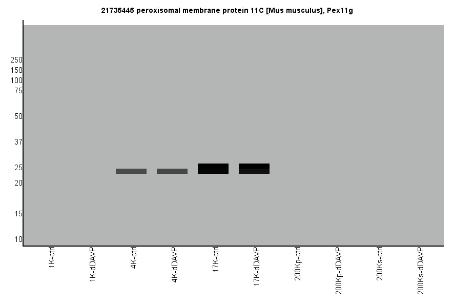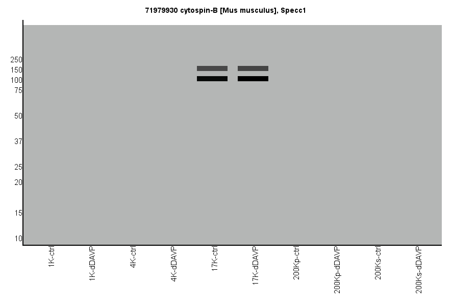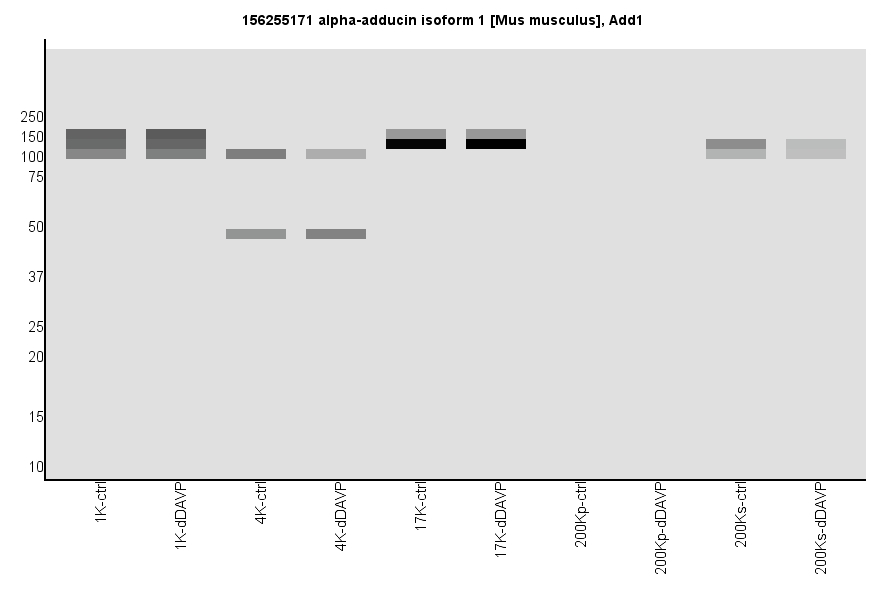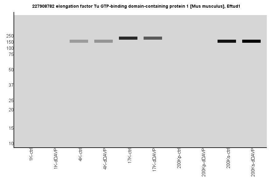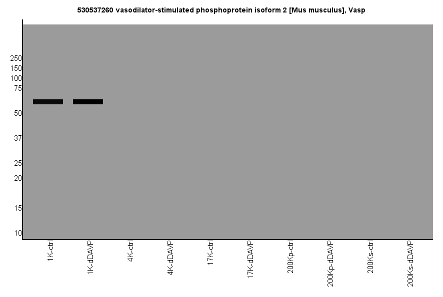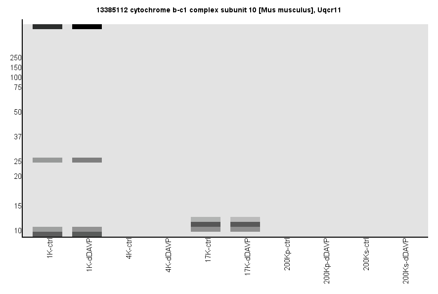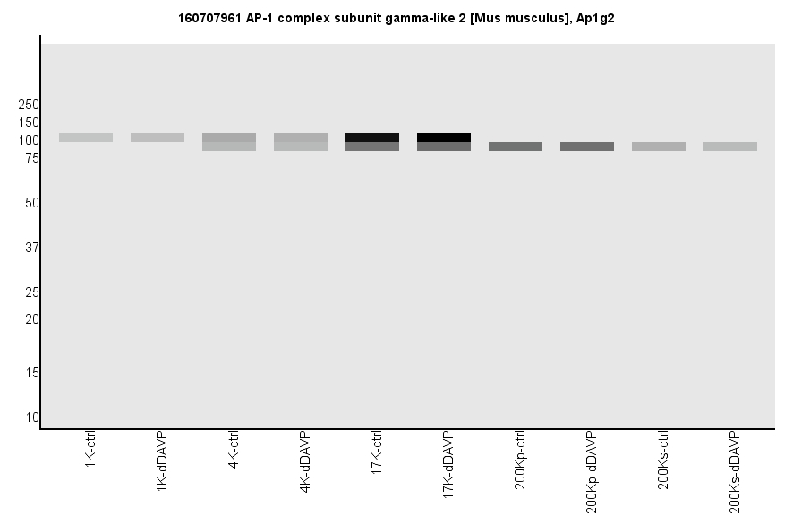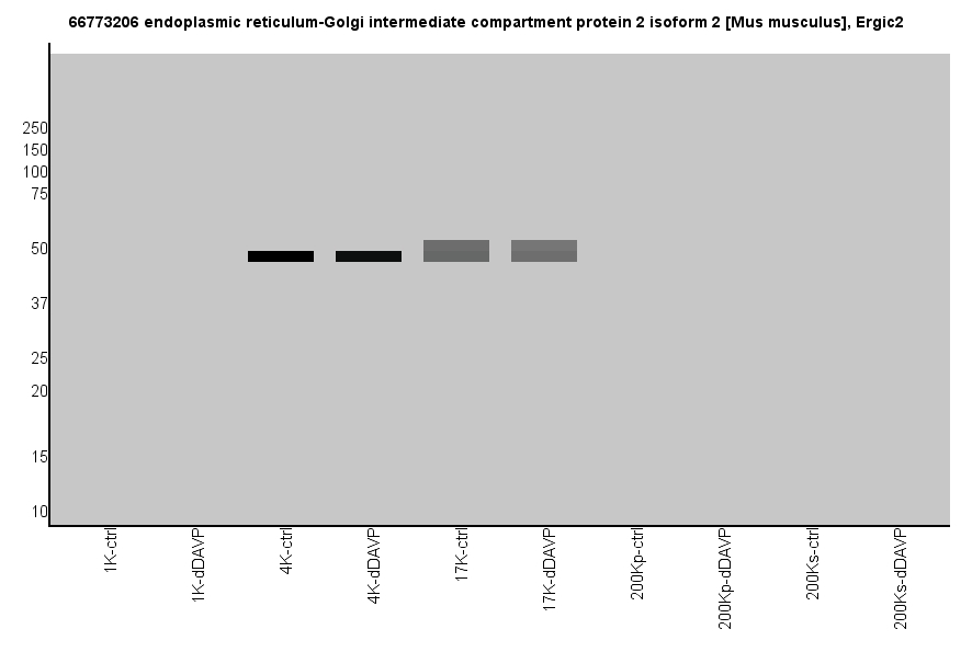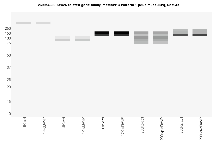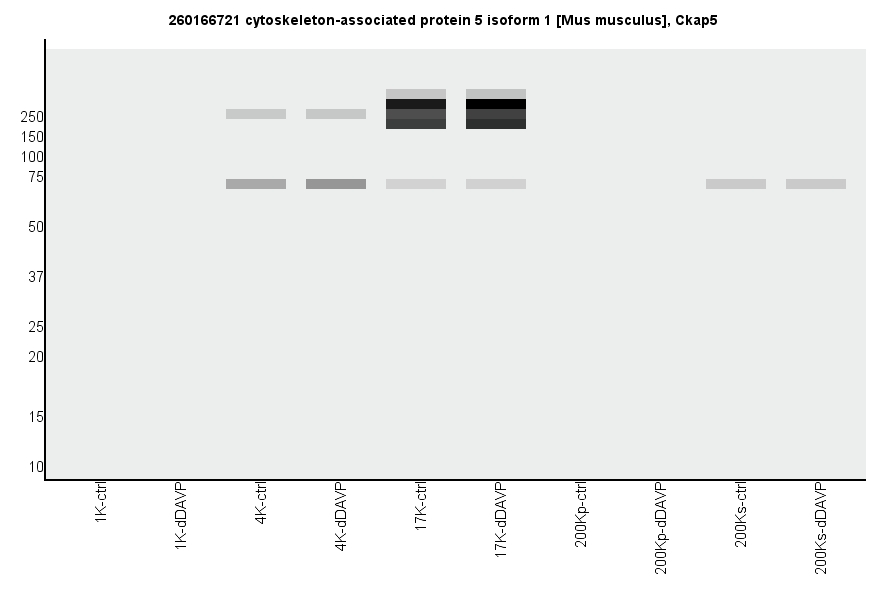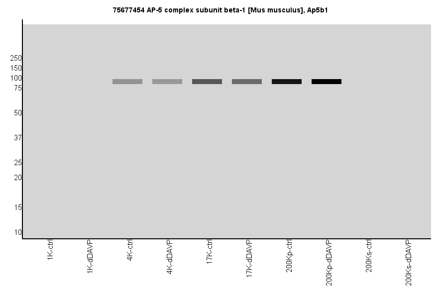 Here, we report large-scale quantification of proteins using LC-MS/MS of subcellular fractions from differential centrifugation in vasopressin- and vehicle-treated mouse mpkCCD cells. Quantification was done by SILAC. Cells treated with the vasopressin analog dDAVP (heavy) or vehicle (light) were mixed 1:1 prior to homogenization and fractionation by differential centrifugation. Fractions were subjected to SDS-PAGE, trypsinization and quantification by LC-MS/MS. Differential centrifugation fractions: 1000 Xg pellet (1K), 4000 Xg pellet (4K), 17,000 Xg pellet (17K), 200,000 Xg pellet (200Kp), and 200,000 Xg supernatant (200Ks). Cells were exposed to vasopressin analog dDAVP at 0.1 nM for 30 minutes. Because each differential centrifugation fraction was resolved by SDS-PAGE and 43 consecutive gel slices were analyzed by MS analysis, the derived data set contains information about the apparent molecular weights of all proteins identified. Such data can be examined individually for each protein by viewing the virtual western blots by mouse over the GI Number at the left. Here, we analyze apparent molecular weights in the entire population of proteins identified compared to the calculated molecular weights obtained from the RefSeq protein records.