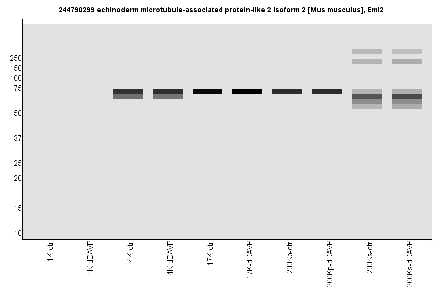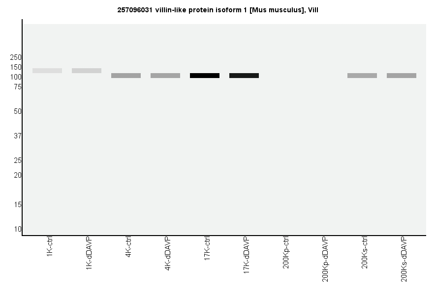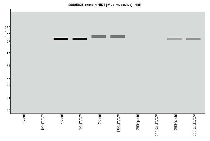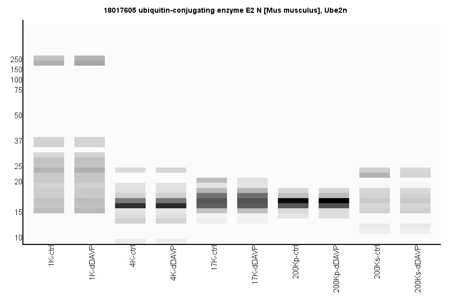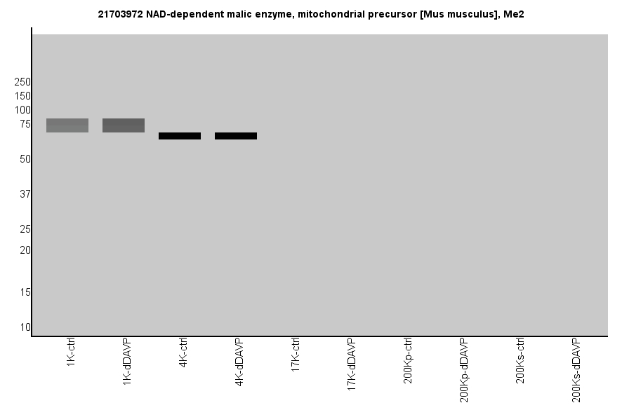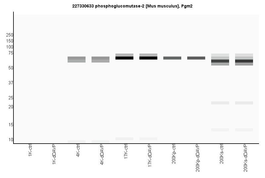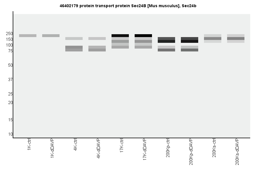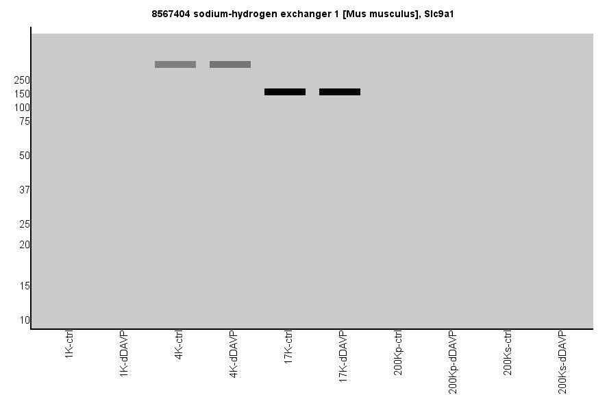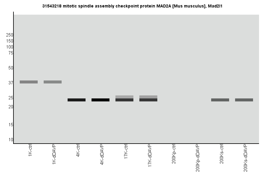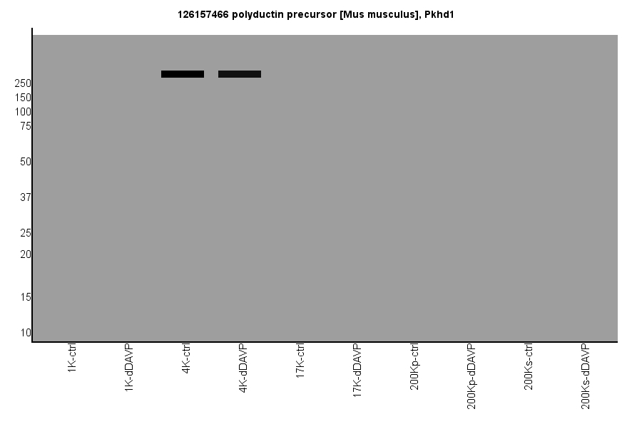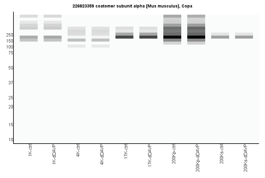 Here, we report large-scale quantification of proteins using LC-MS/MS of subcellular fractions from differential centrifugation in vasopressin- and vehicle-treated mouse mpkCCD cells. Quantification was done by SILAC. Cells treated with the vasopressin analog dDAVP (heavy) or vehicle (light) were mixed 1:1 prior to homogenization and fractionation by differential centrifugation. Fractions were subjected to SDS-PAGE, trypsinization and quantification by LC-MS/MS. Differential centrifugation fractions: 1000 Xg pellet (1K), 4000 Xg pellet (4K), 17,000 Xg pellet (17K), 200,000 Xg pellet (200Kp), and 200,000 Xg supernatant (200Ks). Cells were exposed to vasopressin analog dDAVP at 0.1 nM for 30 minutes. Because each differential centrifugation fraction was resolved by SDS-PAGE and 43 consecutive gel slices were analyzed by MS analysis, the derived data set contains information about the apparent molecular weights of all proteins identified. Such data can be examined individually for each protein by viewing the virtual western blots by mouse over the GI Number at the left. Here, we analyze apparent molecular weights in the entire population of proteins identified compared to the calculated molecular weights obtained from the RefSeq protein records.