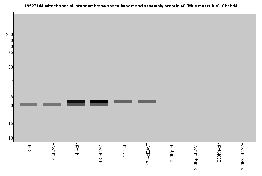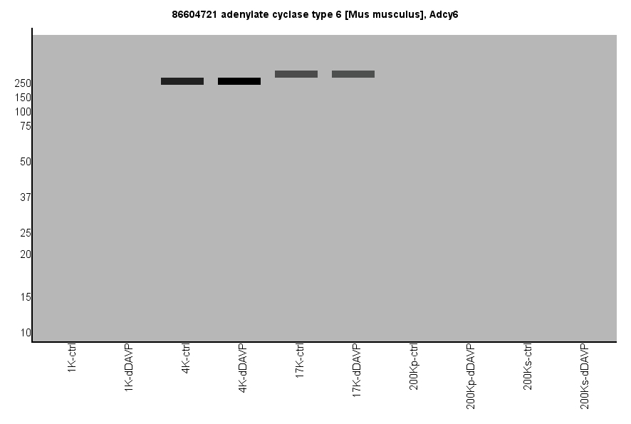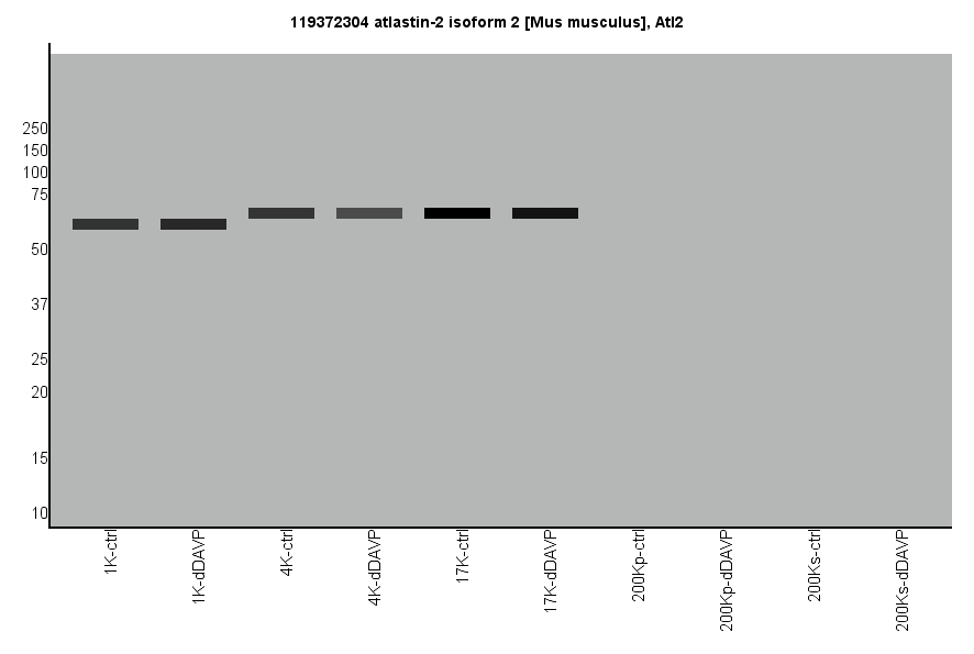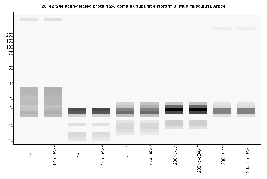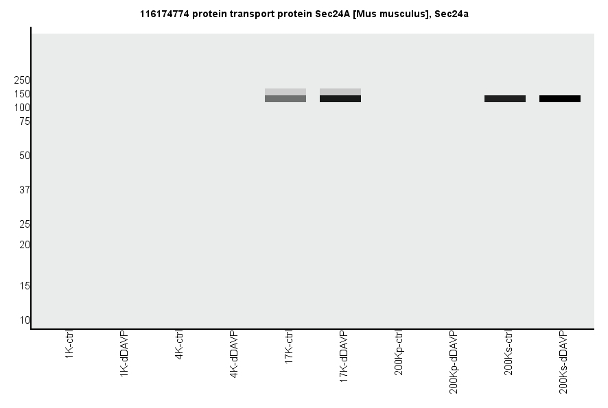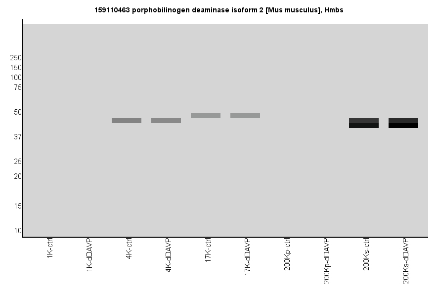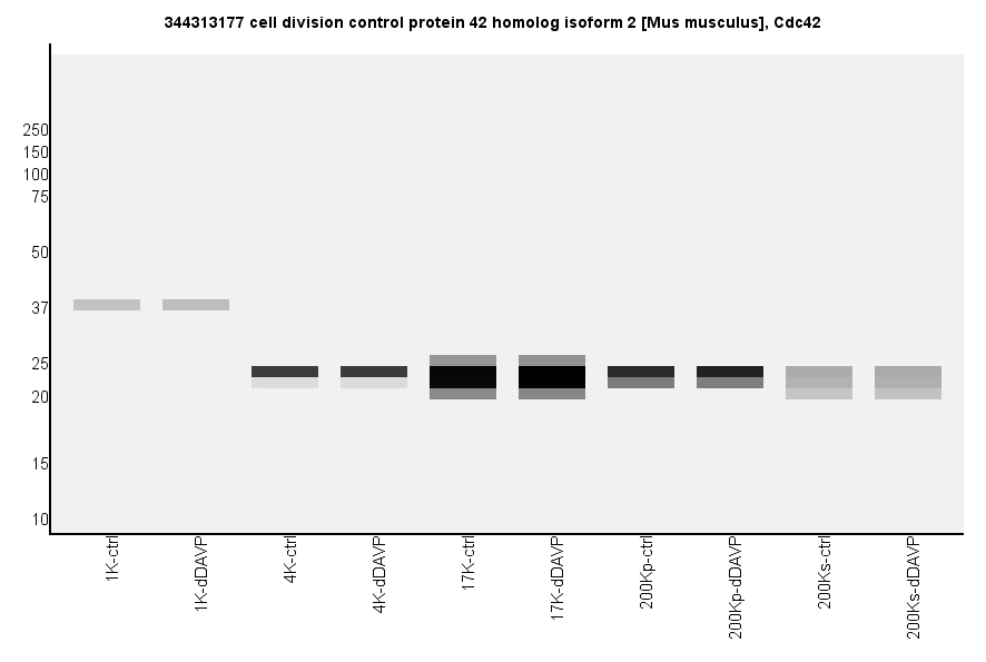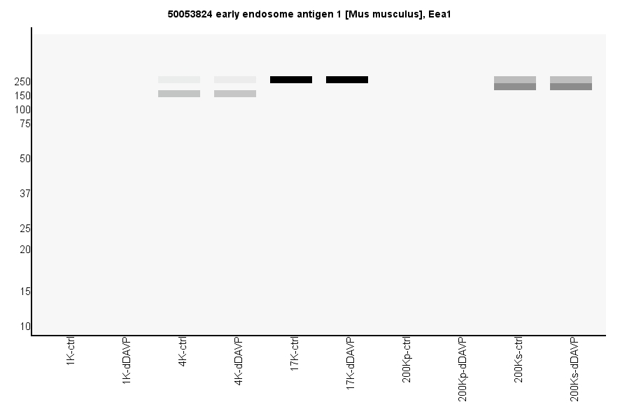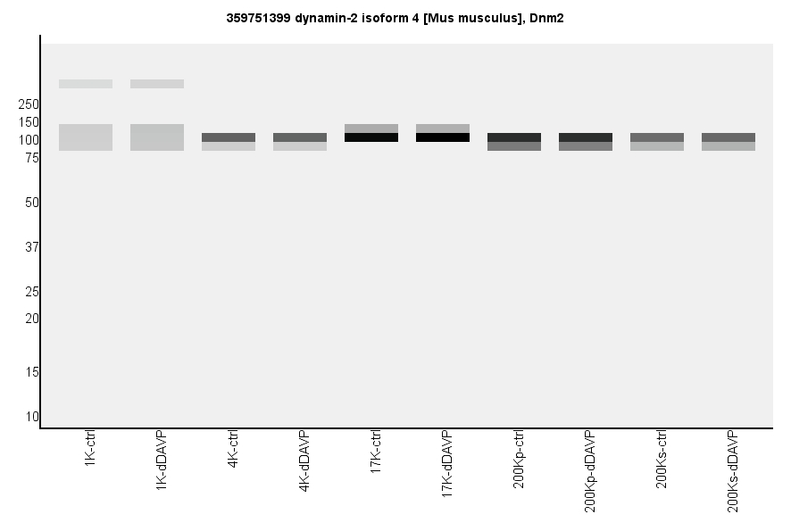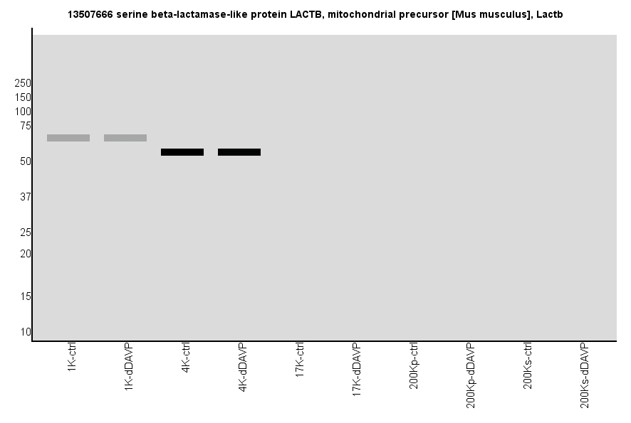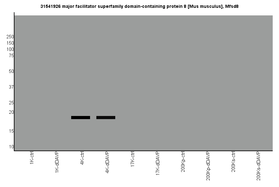 Here, we report large-scale quantification of proteins using LC-MS/MS of subcellular fractions from differential centrifugation in vasopressin- and vehicle-treated mouse mpkCCD cells. Quantification was done by SILAC. Cells treated with the vasopressin analog dDAVP (heavy) or vehicle (light) were mixed 1:1 prior to homogenization and fractionation by differential centrifugation. Fractions were subjected to SDS-PAGE, trypsinization and quantification by LC-MS/MS. Differential centrifugation fractions: 1000 Xg pellet (1K), 4000 Xg pellet (4K), 17,000 Xg pellet (17K), 200,000 Xg pellet (200Kp), and 200,000 Xg supernatant (200Ks). Cells were exposed to vasopressin analog dDAVP at 0.1 nM for 30 minutes. Because each differential centrifugation fraction was resolved by SDS-PAGE and 43 consecutive gel slices were analyzed by MS analysis, the derived data set contains information about the apparent molecular weights of all proteins identified. Such data can be examined individually for each protein by viewing the virtual western blots by mouse over the GI Number at the left. Here, we analyze apparent molecular weights in the entire population of proteins identified compared to the calculated molecular weights obtained from the RefSeq protein records.
