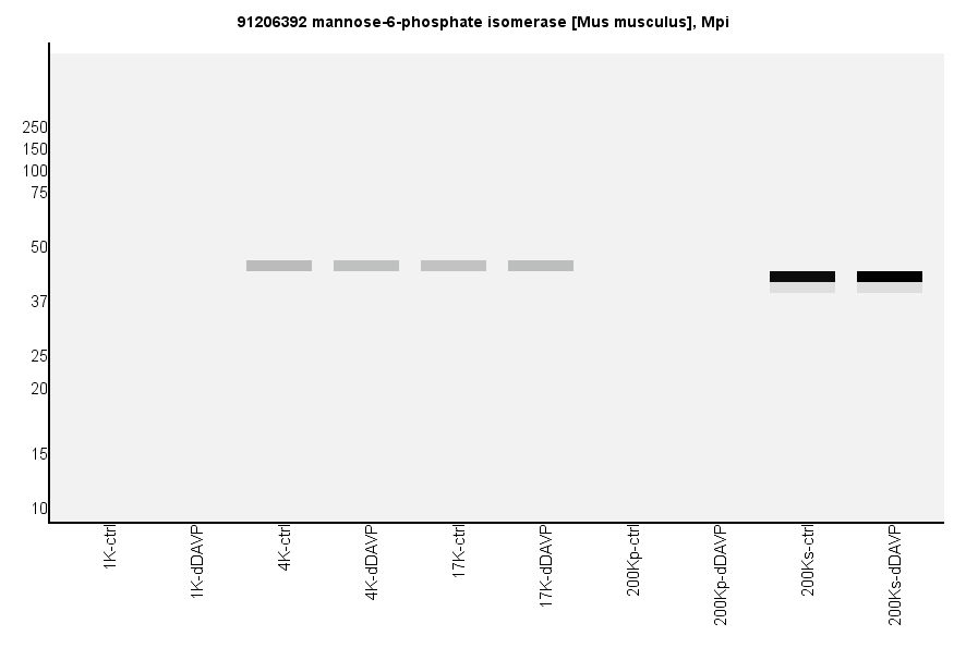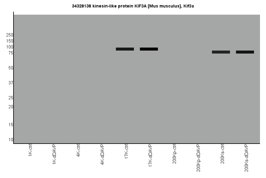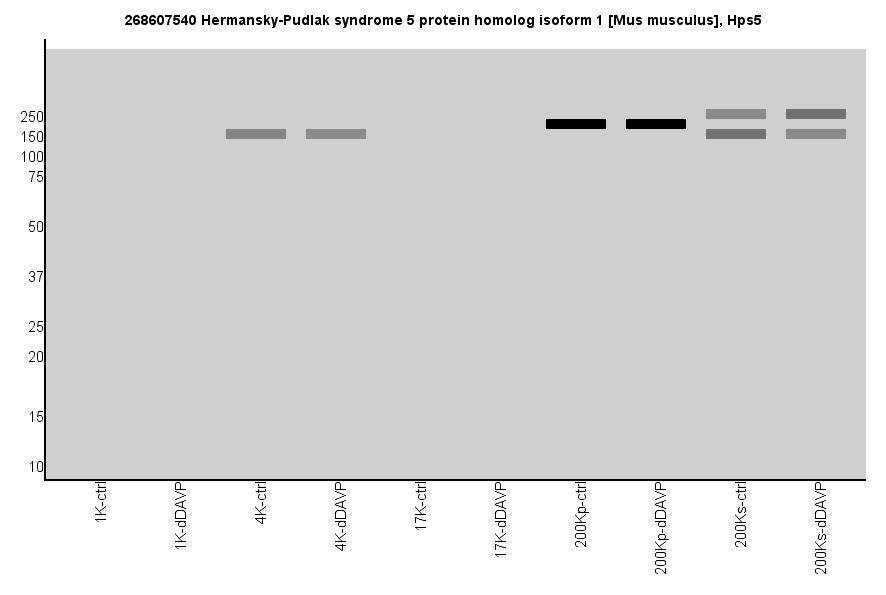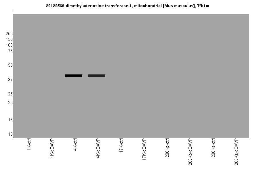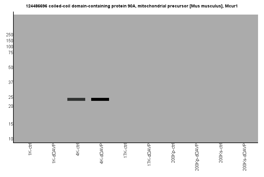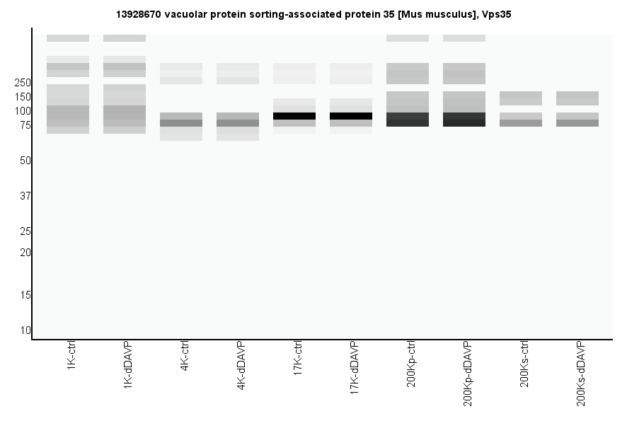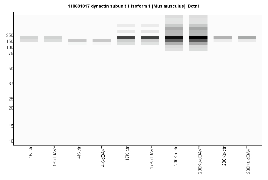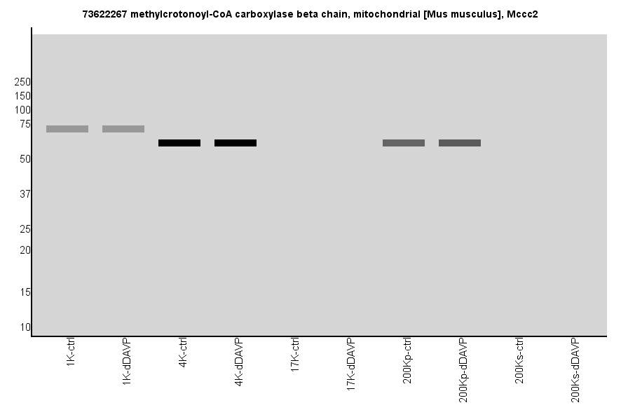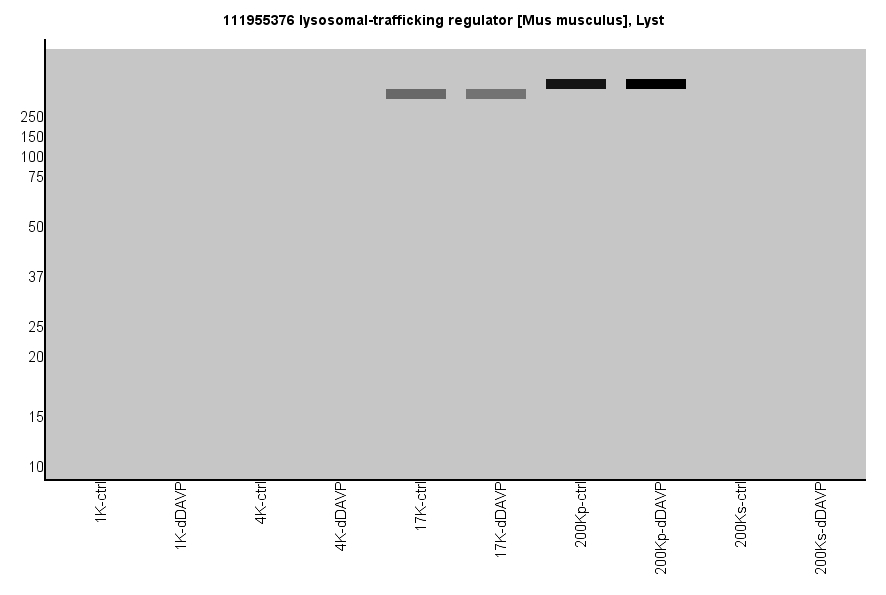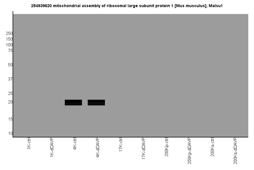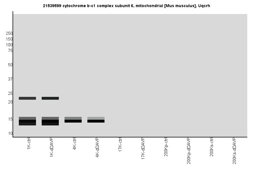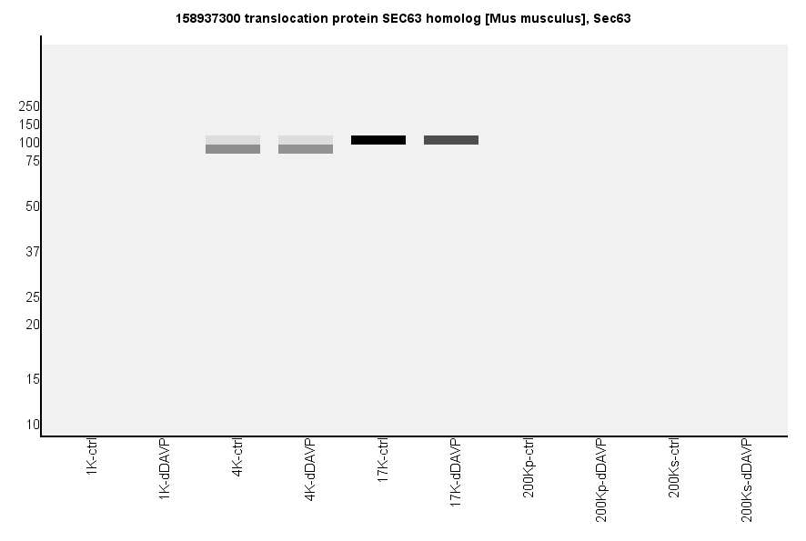 Here, we report large-scale quantification of proteins using LC-MS/MS of subcellular fractions from differential centrifugation in vasopressin- and vehicle-treated mouse mpkCCD cells. Quantification was done by SILAC. Cells treated with the vasopressin analog dDAVP (heavy) or vehicle (light) were mixed 1:1 prior to homogenization and fractionation by differential centrifugation. Fractions were subjected to SDS-PAGE, trypsinization and quantification by LC-MS/MS. Differential centrifugation fractions: 1000 Xg pellet (1K), 4000 Xg pellet (4K), 17,000 Xg pellet (17K), 200,000 Xg pellet (200Kp), and 200,000 Xg supernatant (200Ks). Cells were exposed to vasopressin analog dDAVP at 0.1 nM for 30 minutes. Because each differential centrifugation fraction was resolved by SDS-PAGE and 43 consecutive gel slices were analyzed by MS analysis, the derived data set contains information about the apparent molecular weights of all proteins identified. Such data can be examined individually for each protein by viewing the virtual western blots by mouse over the GI Number at the left. Here, we analyze apparent molecular weights in the entire population of proteins identified compared to the calculated molecular weights obtained from the RefSeq protein records.