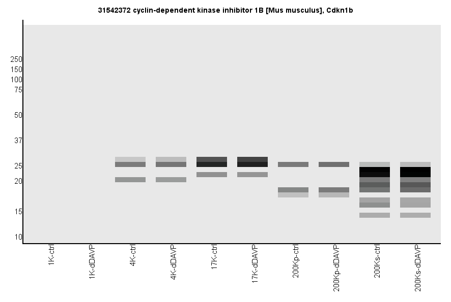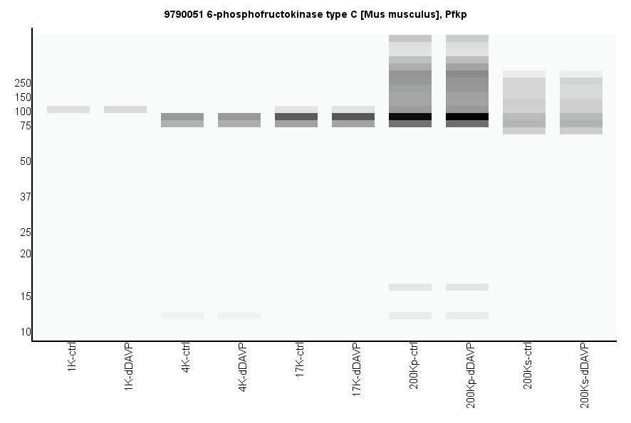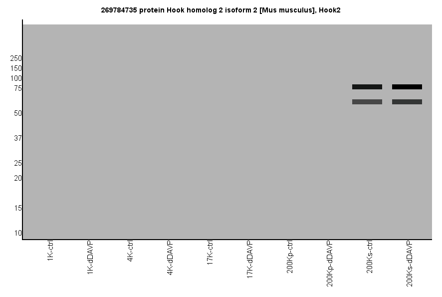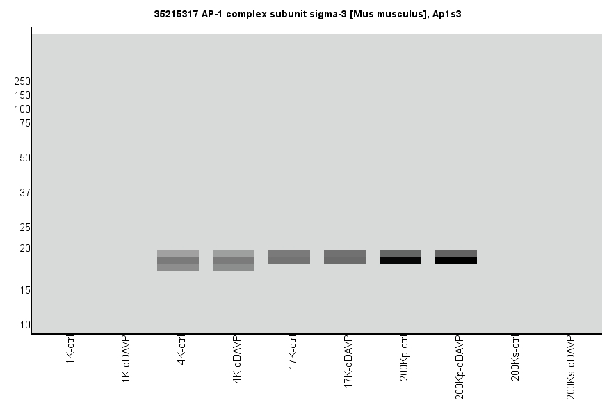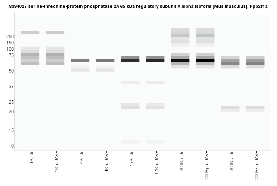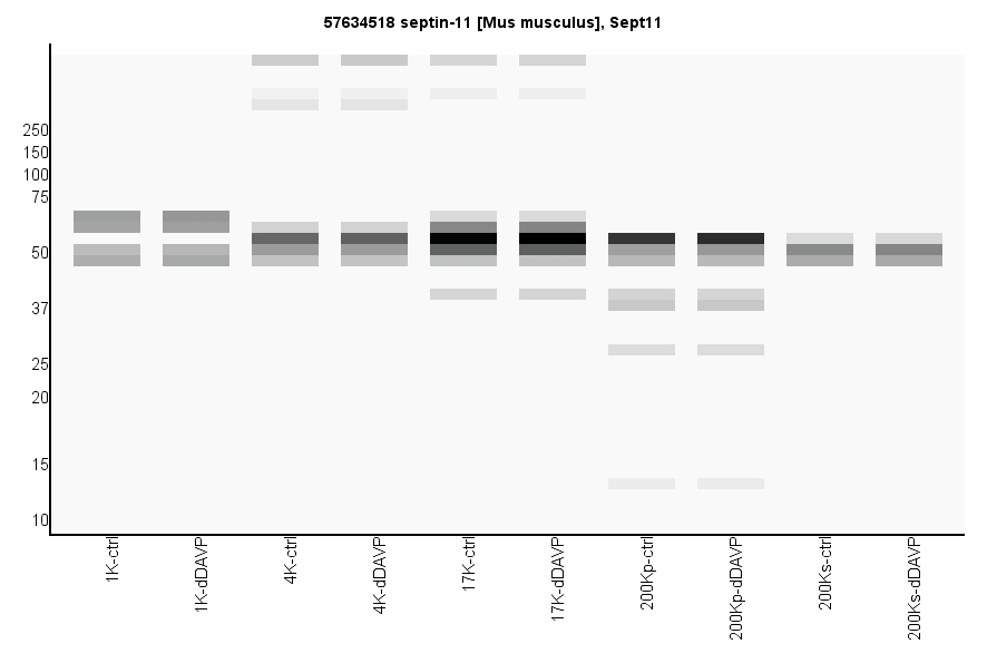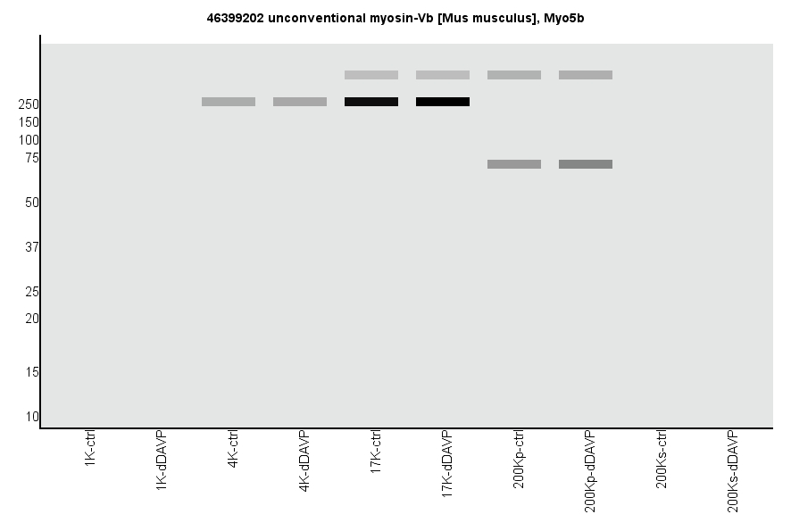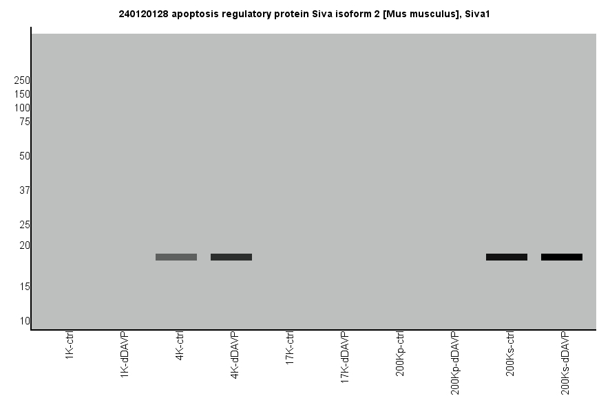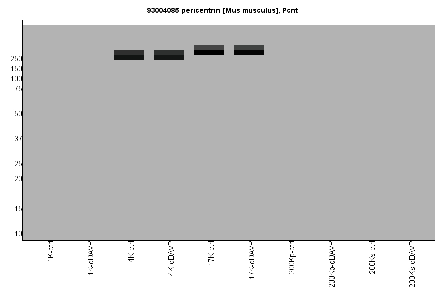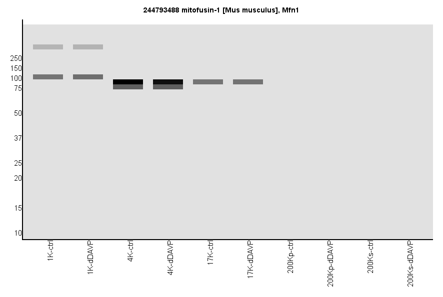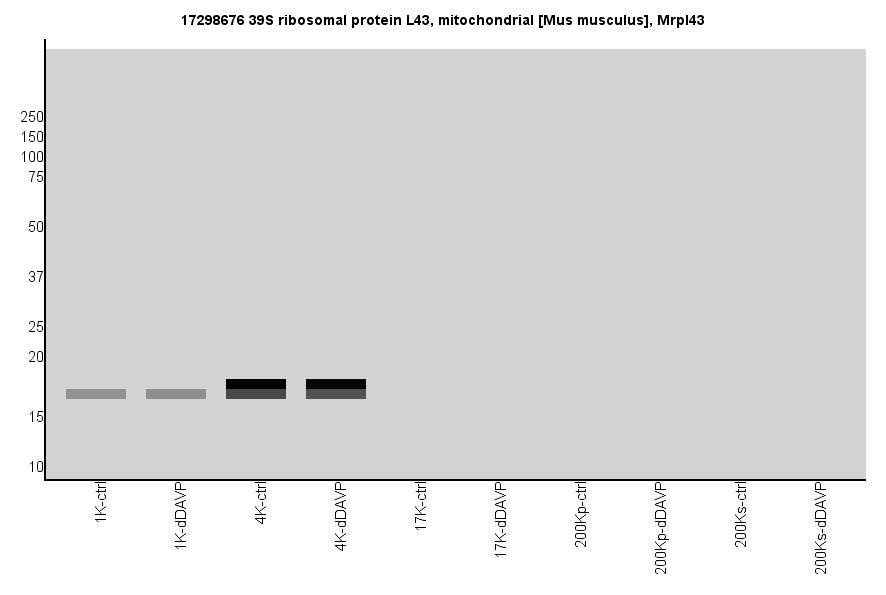 Here, we report large-scale quantification of proteins using LC-MS/MS of subcellular fractions from differential centrifugation in vasopressin- and vehicle-treated mouse mpkCCD cells. Quantification was done by SILAC. Cells treated with the vasopressin analog dDAVP (heavy) or vehicle (light) were mixed 1:1 prior to homogenization and fractionation by differential centrifugation. Fractions were subjected to SDS-PAGE, trypsinization and quantification by LC-MS/MS. Differential centrifugation fractions: 1000 Xg pellet (1K), 4000 Xg pellet (4K), 17,000 Xg pellet (17K), 200,000 Xg pellet (200Kp), and 200,000 Xg supernatant (200Ks). Cells were exposed to vasopressin analog dDAVP at 0.1 nM for 30 minutes. Because each differential centrifugation fraction was resolved by SDS-PAGE and 43 consecutive gel slices were analyzed by MS analysis, the derived data set contains information about the apparent molecular weights of all proteins identified. Such data can be examined individually for each protein by viewing the virtual western blots by mouse over the GI Number at the left. Here, we analyze apparent molecular weights in the entire population of proteins identified compared to the calculated molecular weights obtained from the RefSeq protein records.
