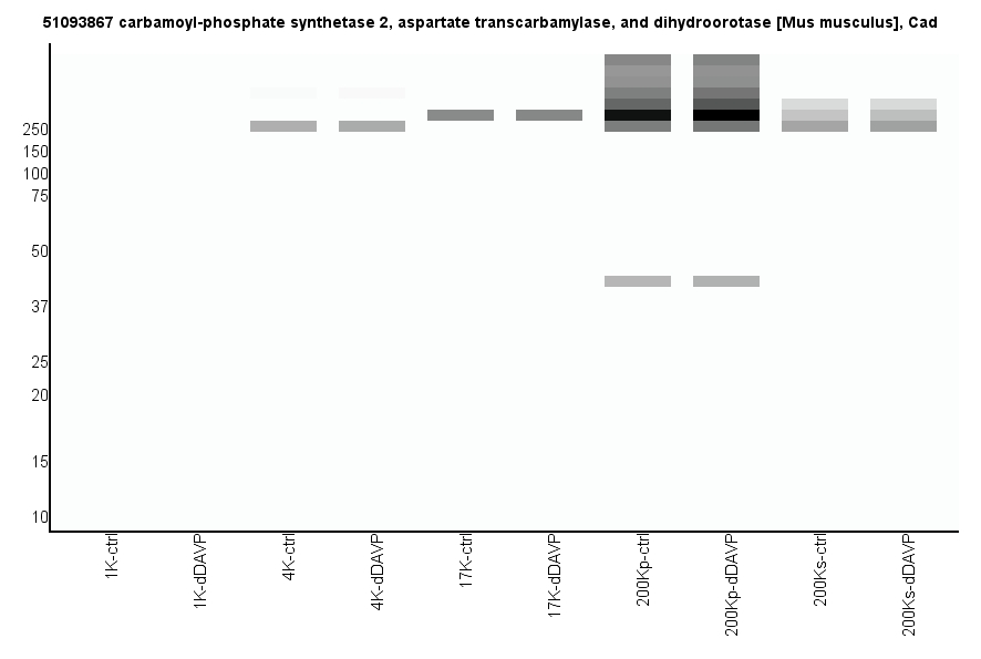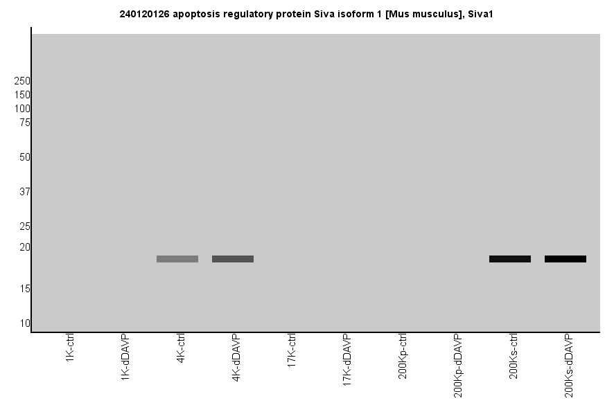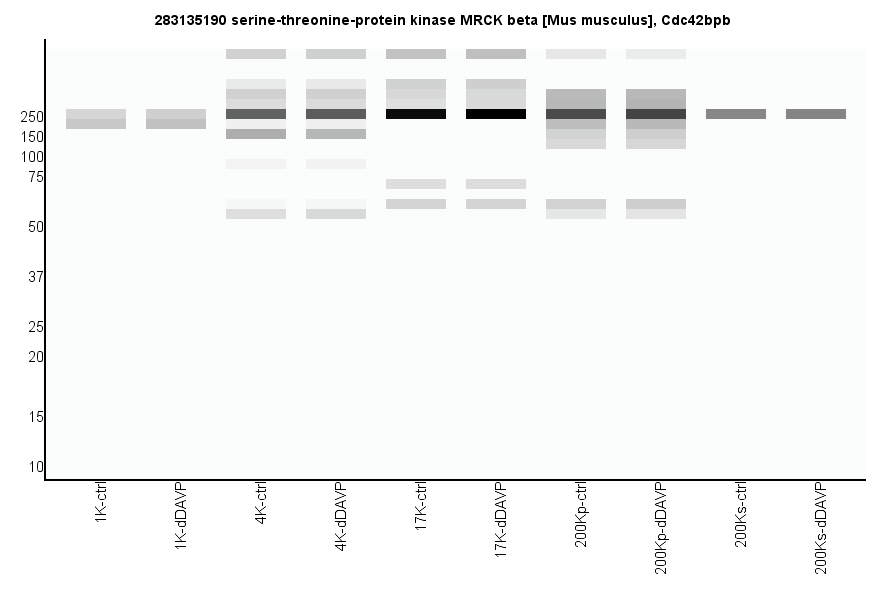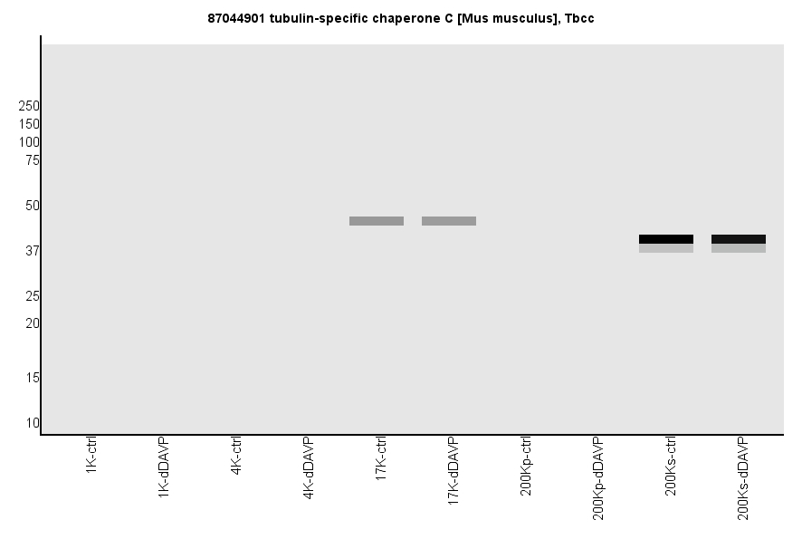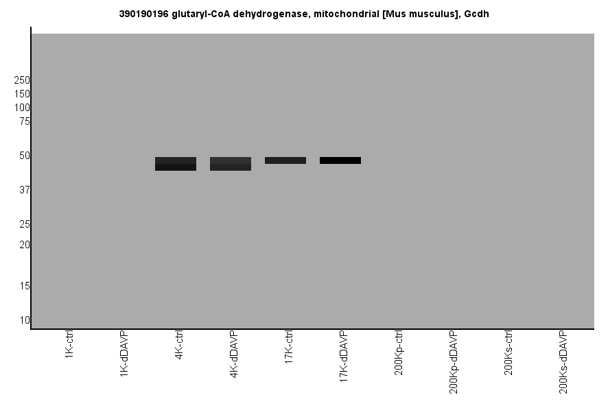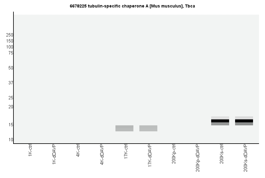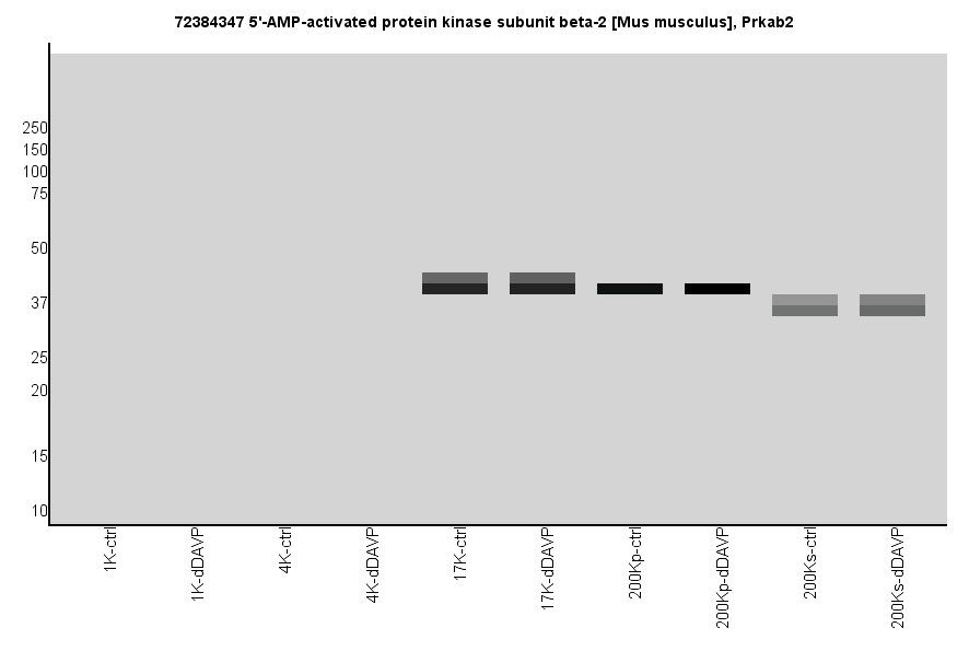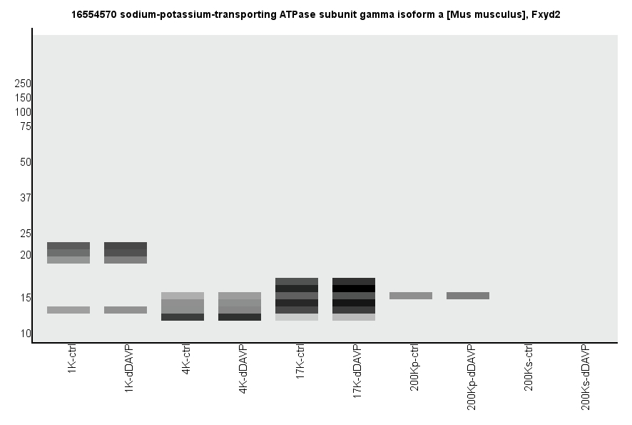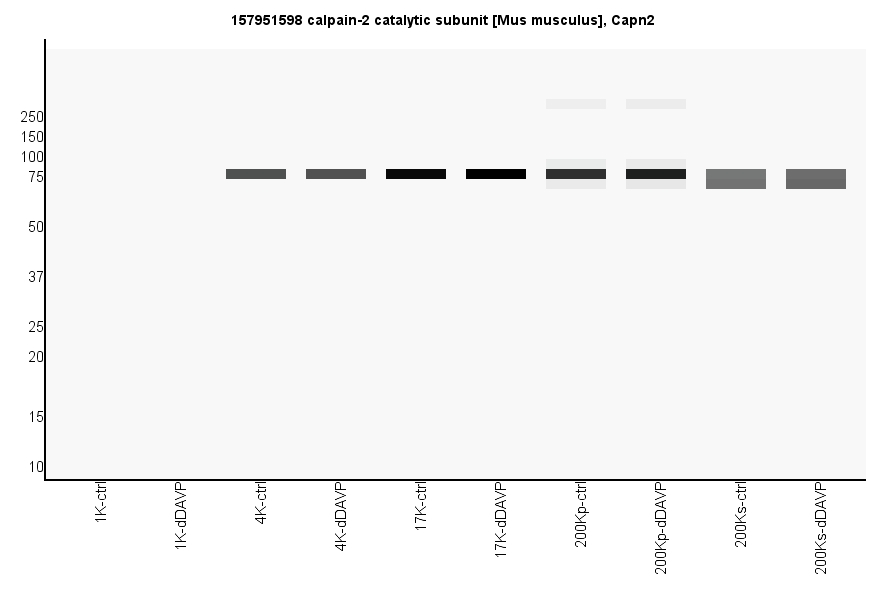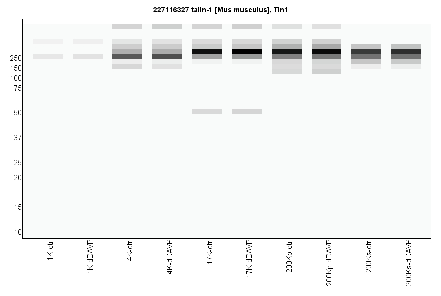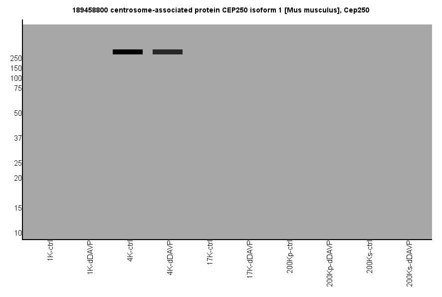 Here, we report large-scale quantification of proteins using LC-MS/MS of subcellular fractions from differential centrifugation in vasopressin- and vehicle-treated mouse mpkCCD cells. Quantification was done by SILAC. Cells treated with the vasopressin analog dDAVP (heavy) or vehicle (light) were mixed 1:1 prior to homogenization and fractionation by differential centrifugation. Fractions were subjected to SDS-PAGE, trypsinization and quantification by LC-MS/MS. Differential centrifugation fractions: 1000 Xg pellet (1K), 4000 Xg pellet (4K), 17,000 Xg pellet (17K), 200,000 Xg pellet (200Kp), and 200,000 Xg supernatant (200Ks). Cells were exposed to vasopressin analog dDAVP at 0.1 nM for 30 minutes. Because each differential centrifugation fraction was resolved by SDS-PAGE and 43 consecutive gel slices were analyzed by MS analysis, the derived data set contains information about the apparent molecular weights of all proteins identified. Such data can be examined individually for each protein by viewing the virtual western blots by mouse over the GI Number at the left. Here, we analyze apparent molecular weights in the entire population of proteins identified compared to the calculated molecular weights obtained from the RefSeq protein records.