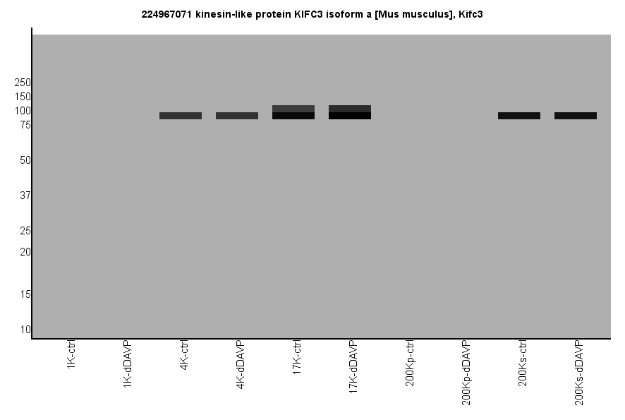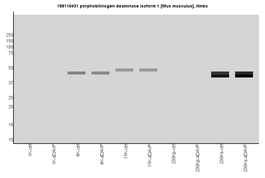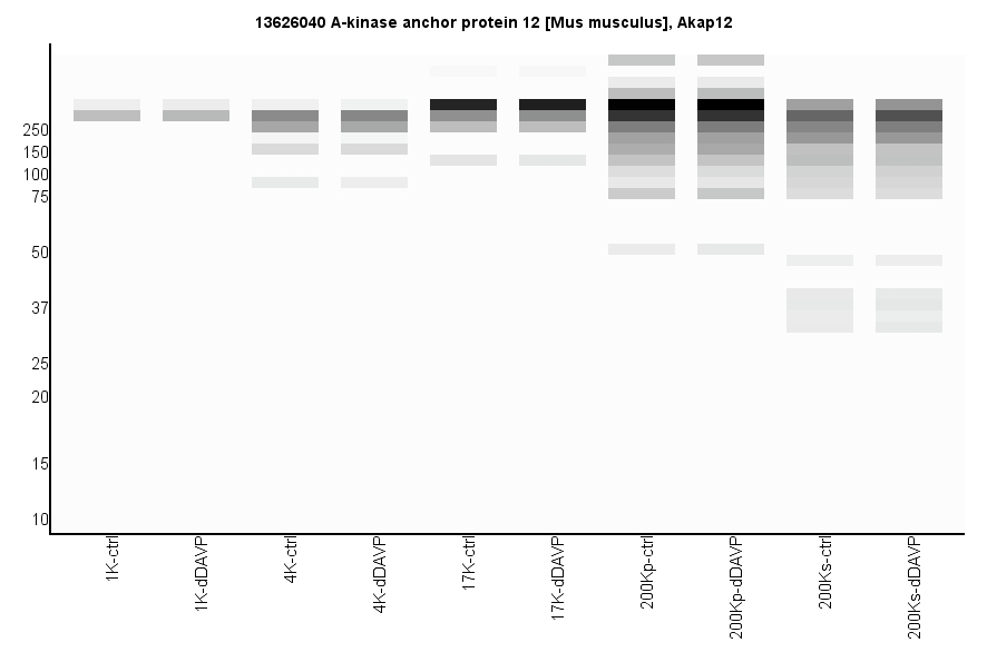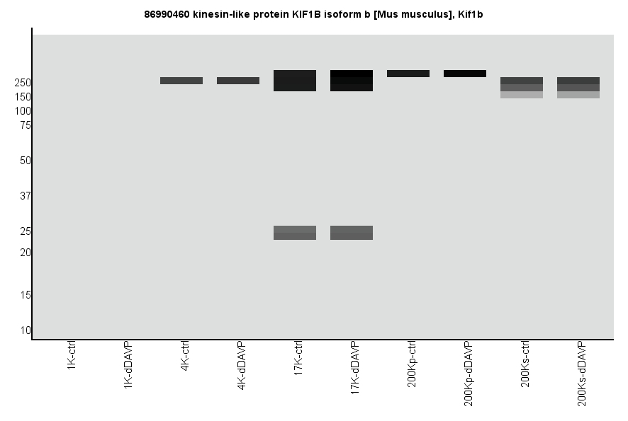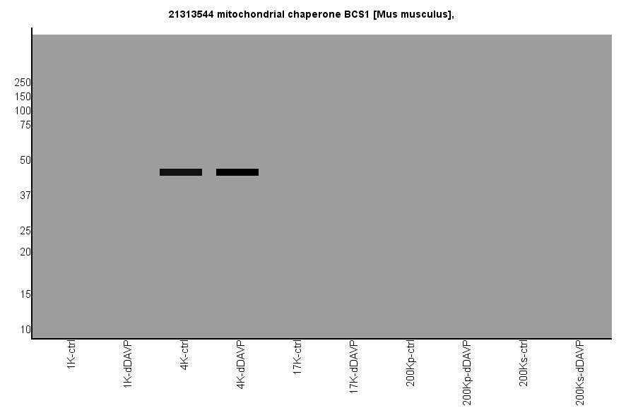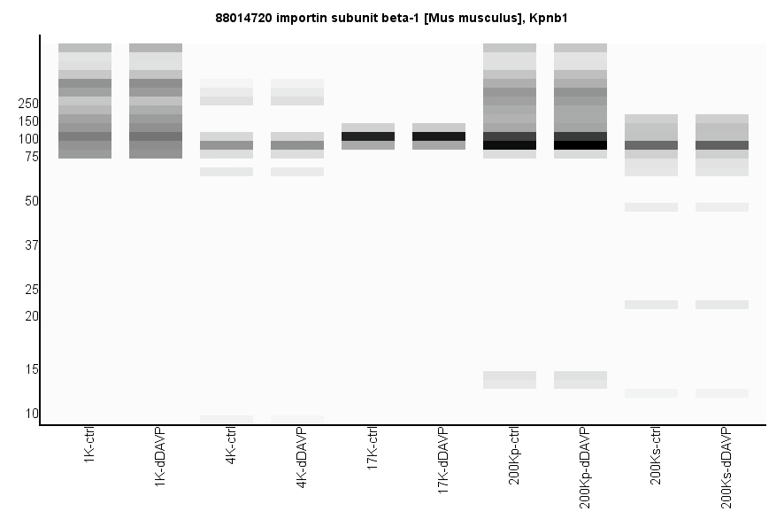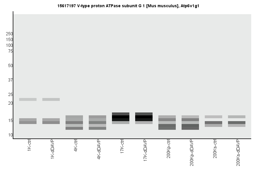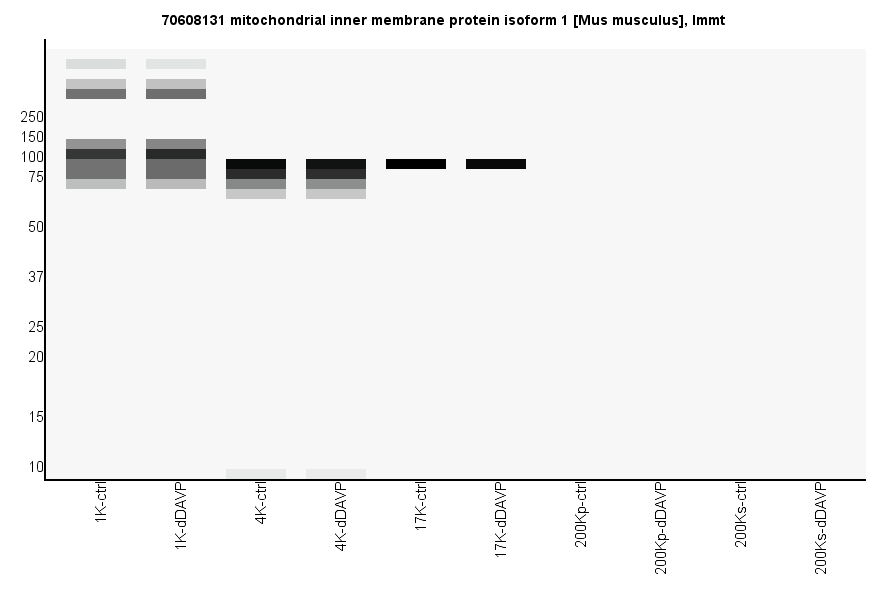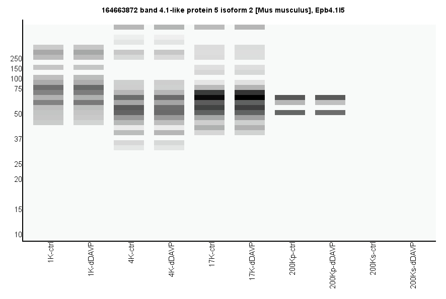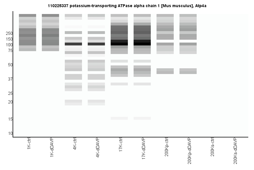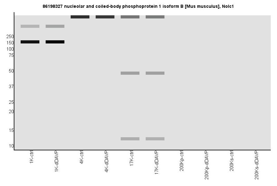 Here, we report large-scale quantification of proteins using LC-MS/MS of subcellular fractions from differential centrifugation in vasopressin- and vehicle-treated mouse mpkCCD cells. Quantification was done by SILAC. Cells treated with the vasopressin analog dDAVP (heavy) or vehicle (light) were mixed 1:1 prior to homogenization and fractionation by differential centrifugation. Fractions were subjected to SDS-PAGE, trypsinization and quantification by LC-MS/MS. Differential centrifugation fractions: 1000 Xg pellet (1K), 4000 Xg pellet (4K), 17,000 Xg pellet (17K), 200,000 Xg pellet (200Kp), and 200,000 Xg supernatant (200Ks). Cells were exposed to vasopressin analog dDAVP at 0.1 nM for 30 minutes. Because each differential centrifugation fraction was resolved by SDS-PAGE and 43 consecutive gel slices were analyzed by MS analysis, the derived data set contains information about the apparent molecular weights of all proteins identified. Such data can be examined individually for each protein by viewing the virtual western blots by mouse over the GI Number at the left. Here, we analyze apparent molecular weights in the entire population of proteins identified compared to the calculated molecular weights obtained from the RefSeq protein records.