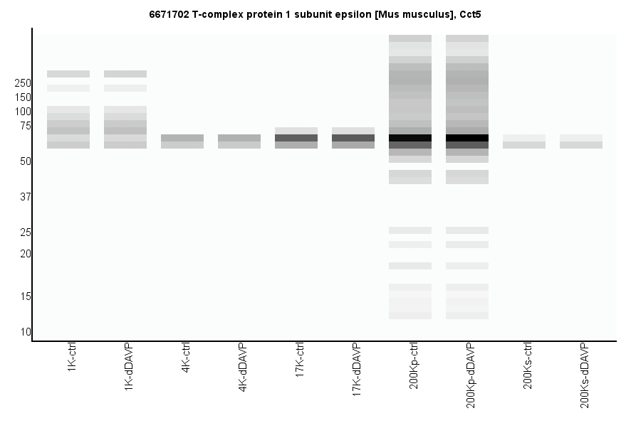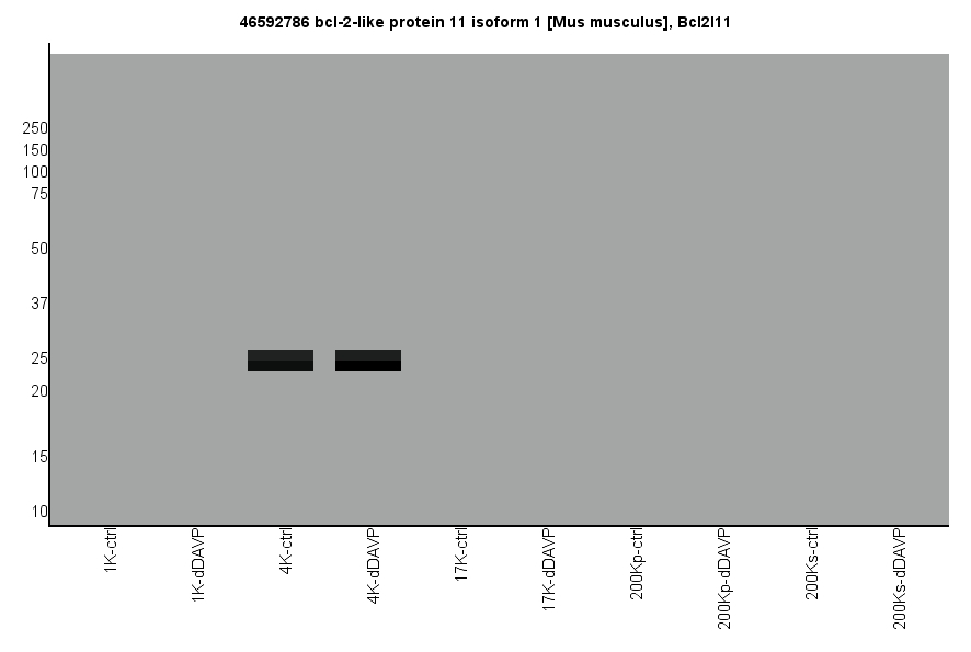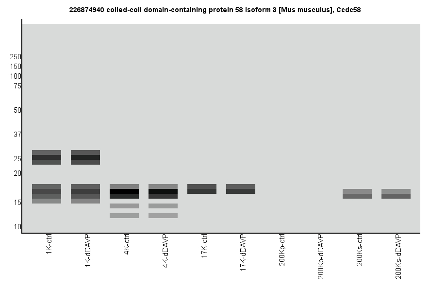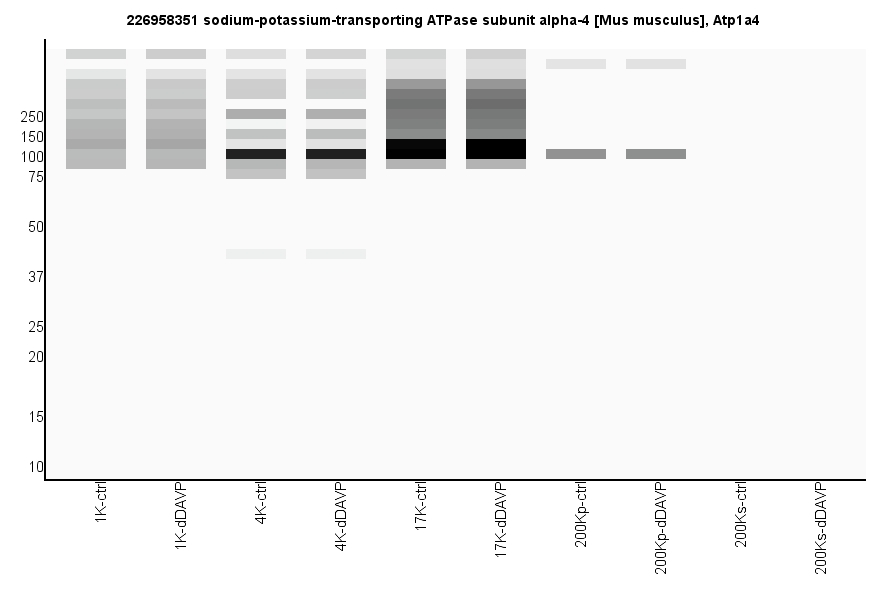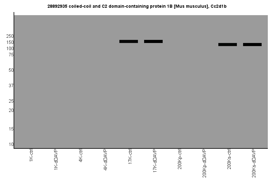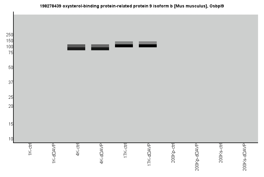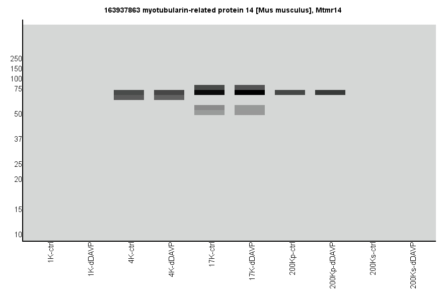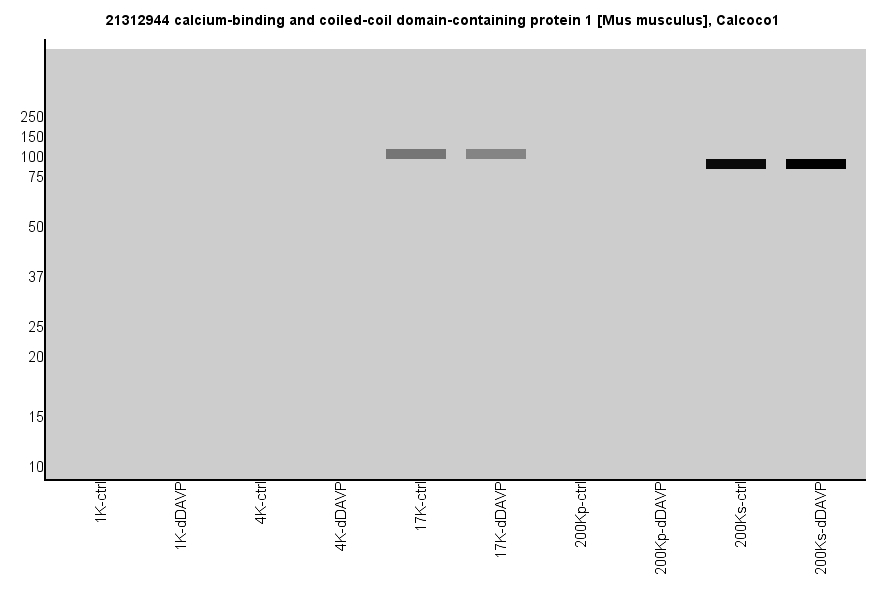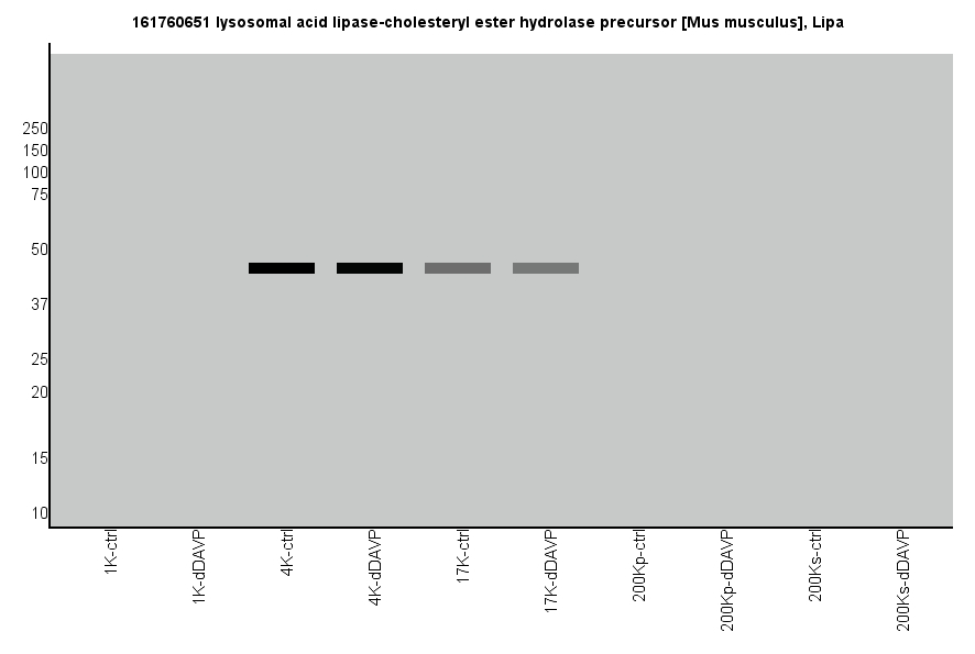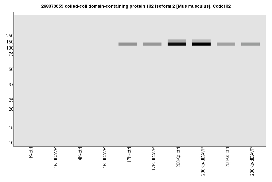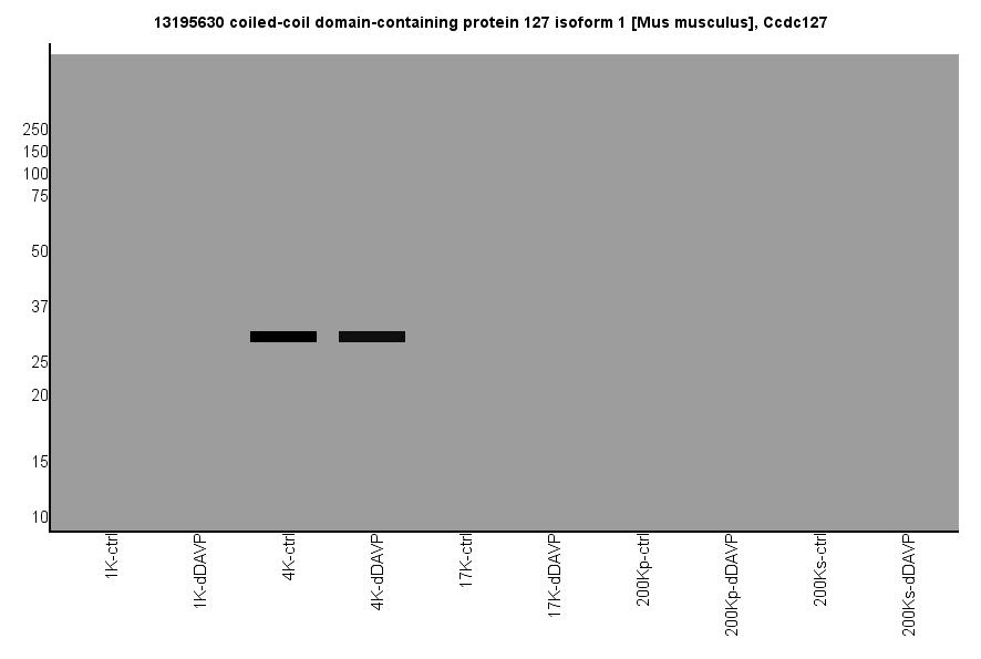 Here, we report large-scale quantification of proteins using LC-MS/MS of subcellular fractions from differential centrifugation in vasopressin- and vehicle-treated mouse mpkCCD cells. Quantification was done by SILAC. Cells treated with the vasopressin analog dDAVP (heavy) or vehicle (light) were mixed 1:1 prior to homogenization and fractionation by differential centrifugation. Fractions were subjected to SDS-PAGE, trypsinization and quantification by LC-MS/MS. Differential centrifugation fractions: 1000 Xg pellet (1K), 4000 Xg pellet (4K), 17,000 Xg pellet (17K), 200,000 Xg pellet (200Kp), and 200,000 Xg supernatant (200Ks). Cells were exposed to vasopressin analog dDAVP at 0.1 nM for 30 minutes. Because each differential centrifugation fraction was resolved by SDS-PAGE and 43 consecutive gel slices were analyzed by MS analysis, the derived data set contains information about the apparent molecular weights of all proteins identified. Such data can be examined individually for each protein by viewing the virtual western blots by mouse over the GI Number at the left. Here, we analyze apparent molecular weights in the entire population of proteins identified compared to the calculated molecular weights obtained from the RefSeq protein records.