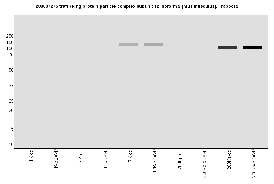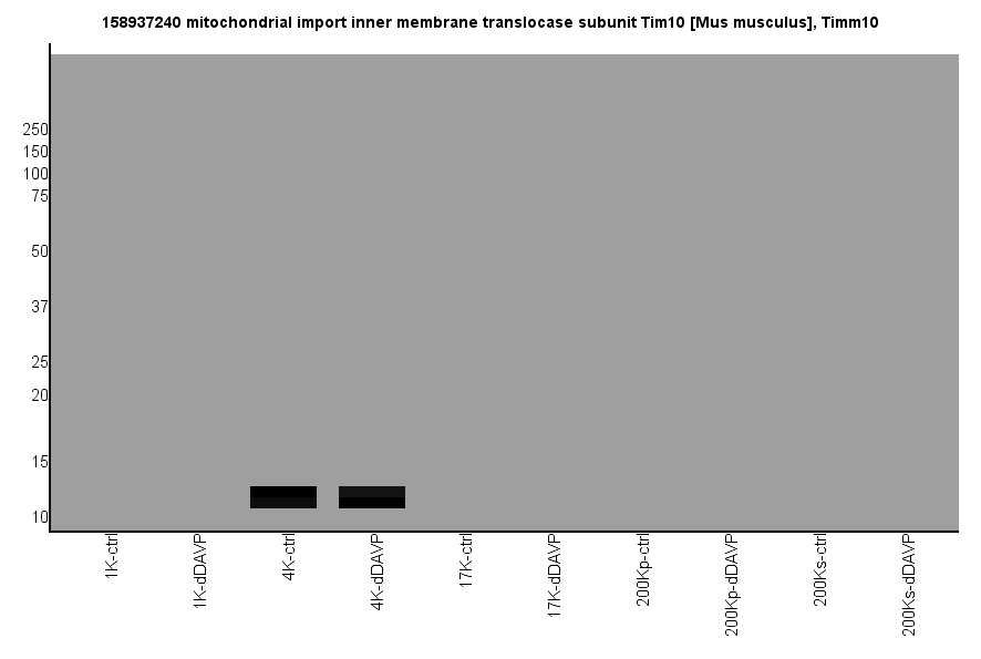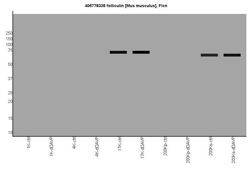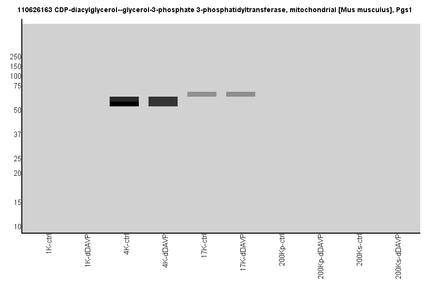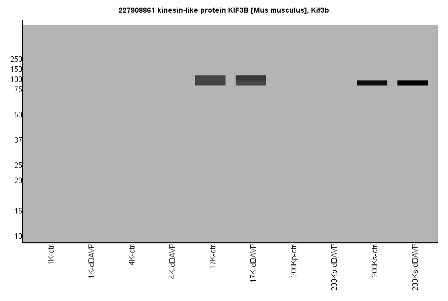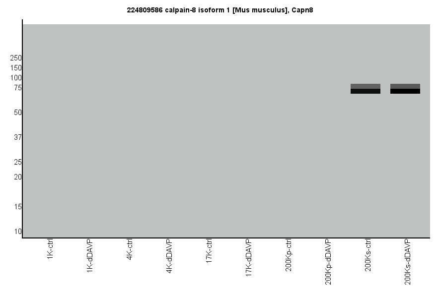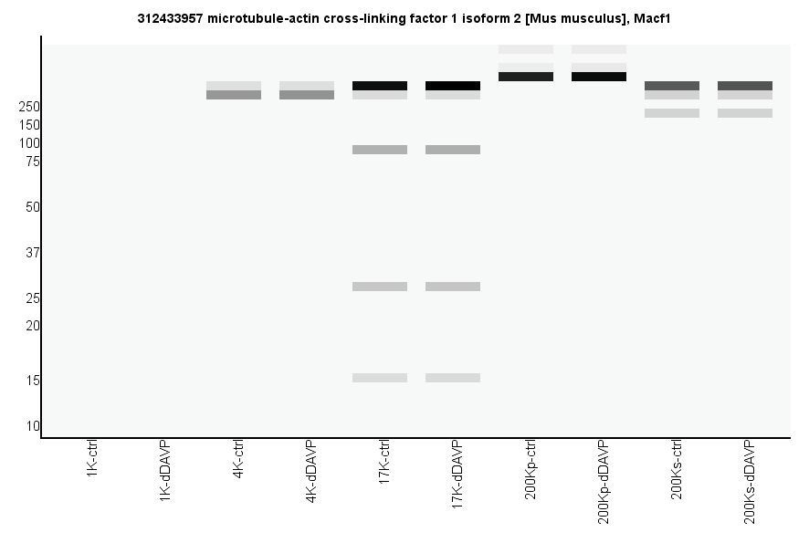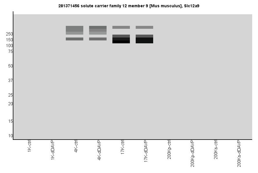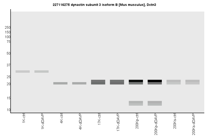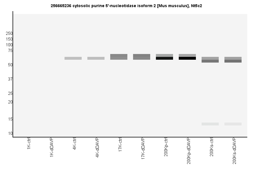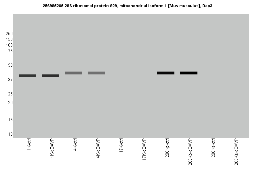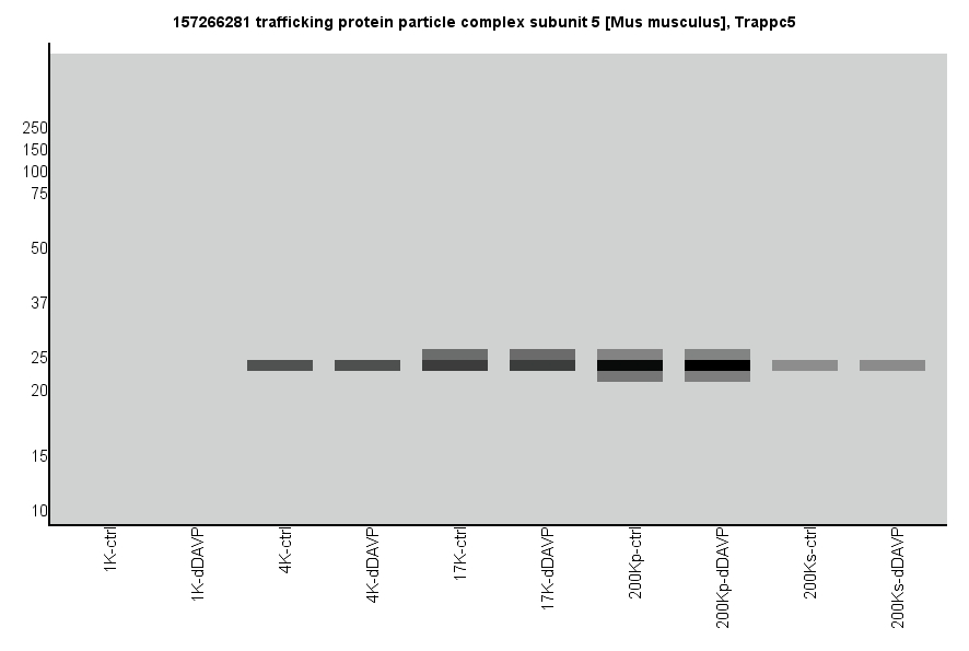 Here, we report large-scale quantification of proteins using LC-MS/MS of subcellular fractions from differential centrifugation in vasopressin- and vehicle-treated mouse mpkCCD cells. Quantification was done by SILAC. Cells treated with the vasopressin analog dDAVP (heavy) or vehicle (light) were mixed 1:1 prior to homogenization and fractionation by differential centrifugation. Fractions were subjected to SDS-PAGE, trypsinization and quantification by LC-MS/MS. Differential centrifugation fractions: 1000 Xg pellet (1K), 4000 Xg pellet (4K), 17,000 Xg pellet (17K), 200,000 Xg pellet (200Kp), and 200,000 Xg supernatant (200Ks). Cells were exposed to vasopressin analog dDAVP at 0.1 nM for 30 minutes. Because each differential centrifugation fraction was resolved by SDS-PAGE and 43 consecutive gel slices were analyzed by MS analysis, the derived data set contains information about the apparent molecular weights of all proteins identified. Such data can be examined individually for each protein by viewing the virtual western blots by mouse over the GI Number at the left. Here, we analyze apparent molecular weights in the entire population of proteins identified compared to the calculated molecular weights obtained from the RefSeq protein records.