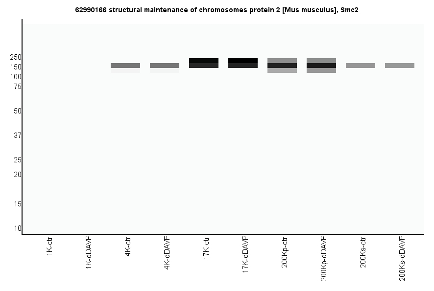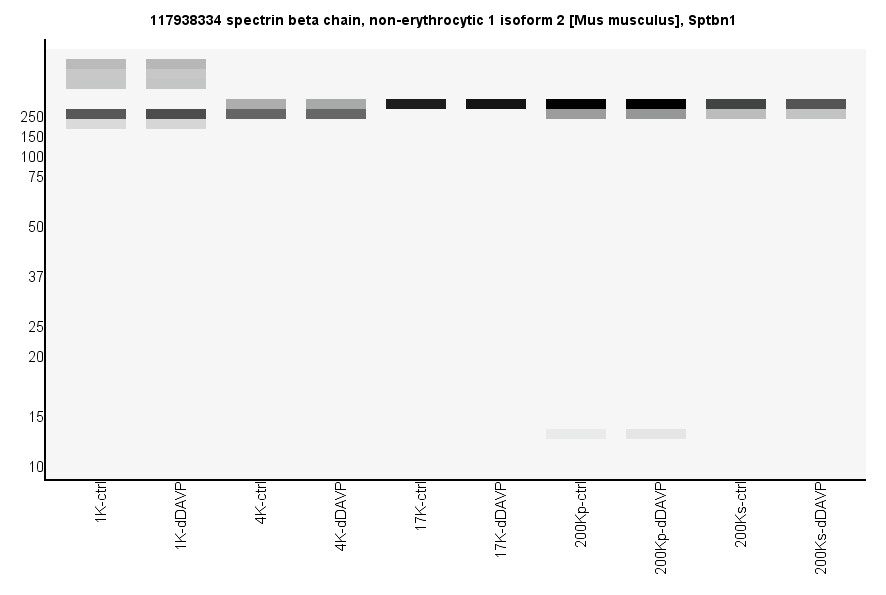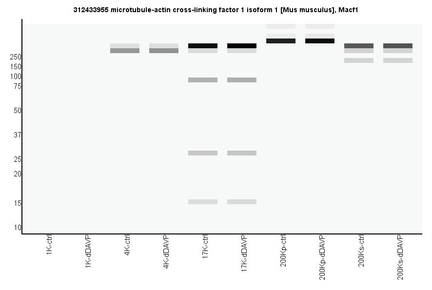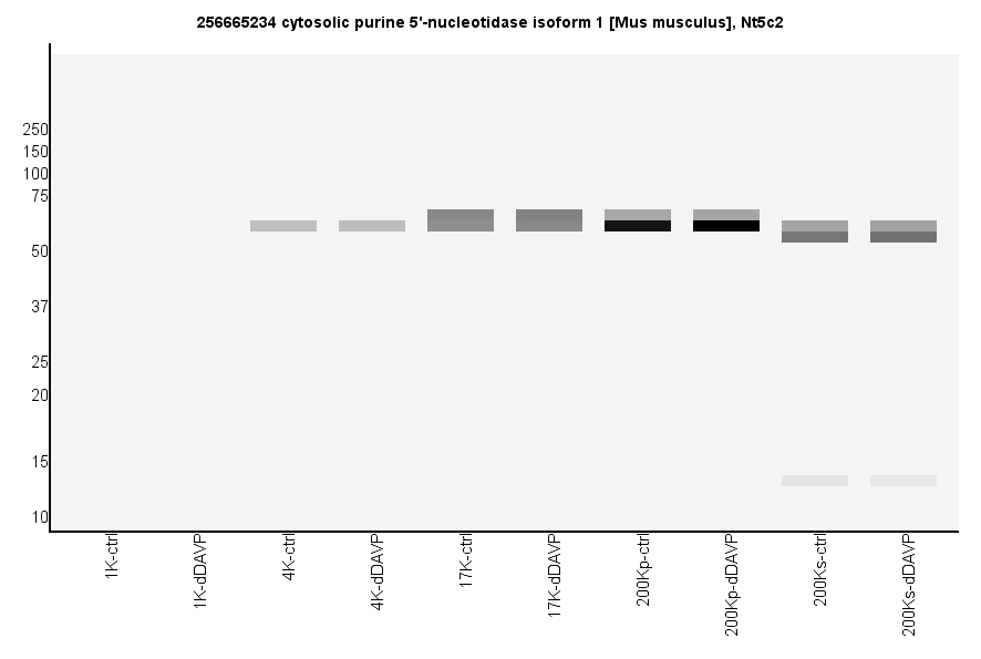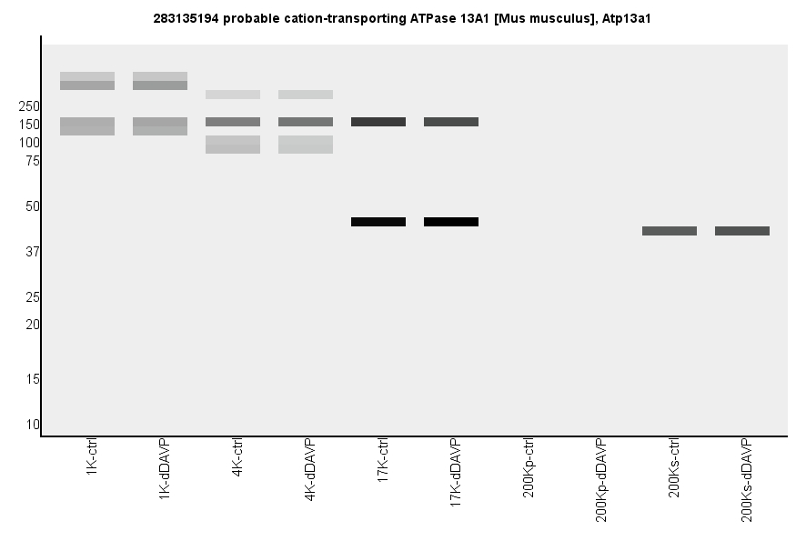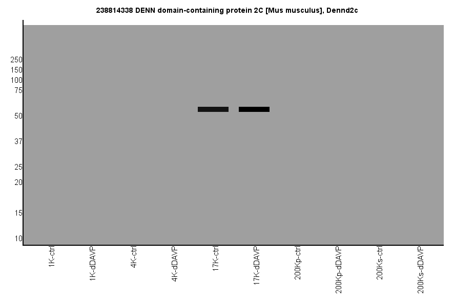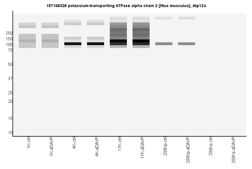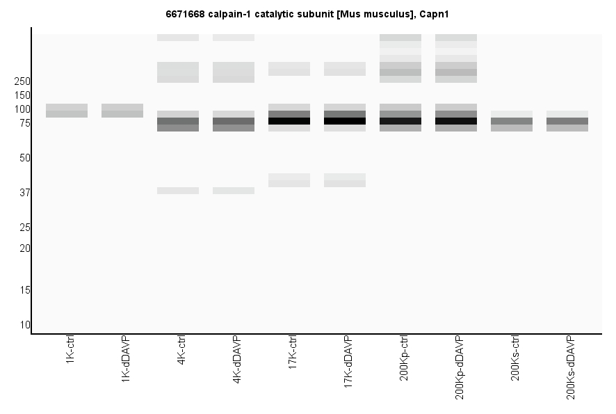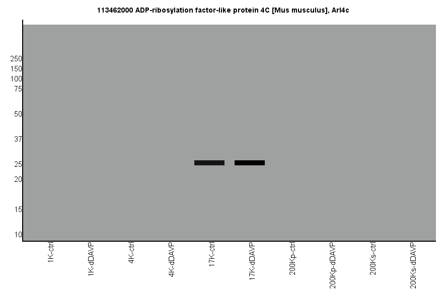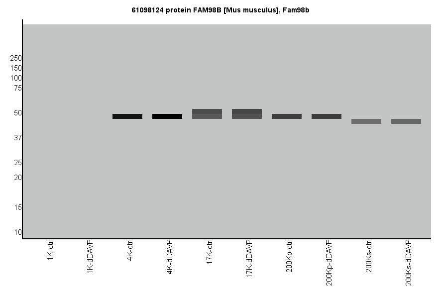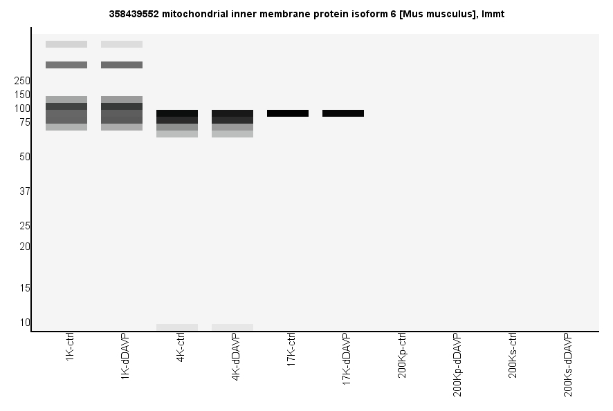 Here, we report large-scale quantification of proteins using LC-MS/MS of subcellular fractions from differential centrifugation in vasopressin- and vehicle-treated mouse mpkCCD cells. Quantification was done by SILAC. Cells treated with the vasopressin analog dDAVP (heavy) or vehicle (light) were mixed 1:1 prior to homogenization and fractionation by differential centrifugation. Fractions were subjected to SDS-PAGE, trypsinization and quantification by LC-MS/MS. Differential centrifugation fractions: 1000 Xg pellet (1K), 4000 Xg pellet (4K), 17,000 Xg pellet (17K), 200,000 Xg pellet (200Kp), and 200,000 Xg supernatant (200Ks). Cells were exposed to vasopressin analog dDAVP at 0.1 nM for 30 minutes. Because each differential centrifugation fraction was resolved by SDS-PAGE and 43 consecutive gel slices were analyzed by MS analysis, the derived data set contains information about the apparent molecular weights of all proteins identified. Such data can be examined individually for each protein by viewing the virtual western blots by mouse over the GI Number at the left. Here, we analyze apparent molecular weights in the entire population of proteins identified compared to the calculated molecular weights obtained from the RefSeq protein records.