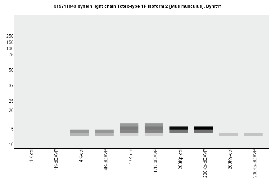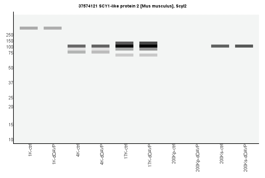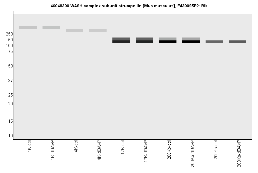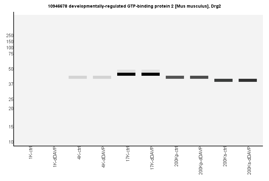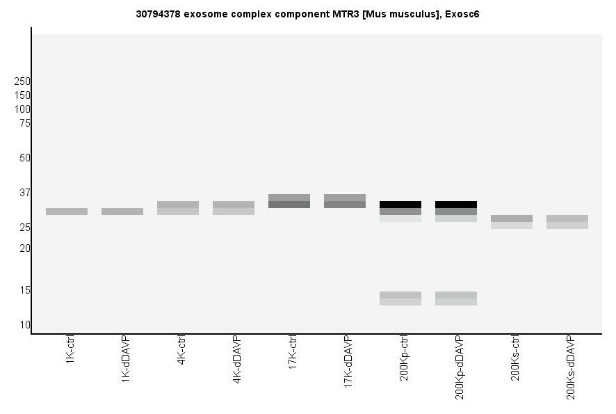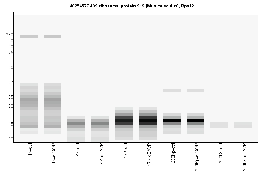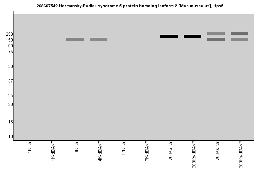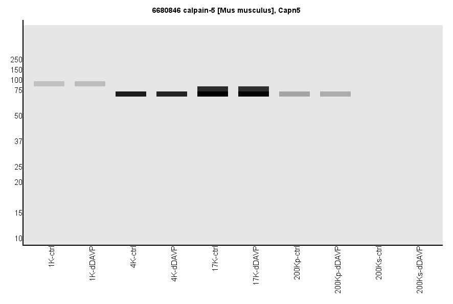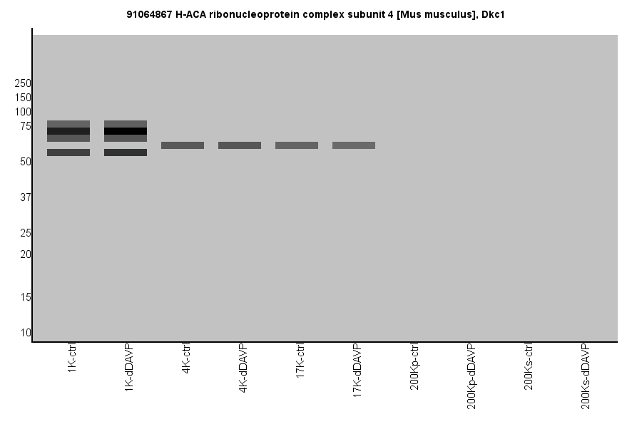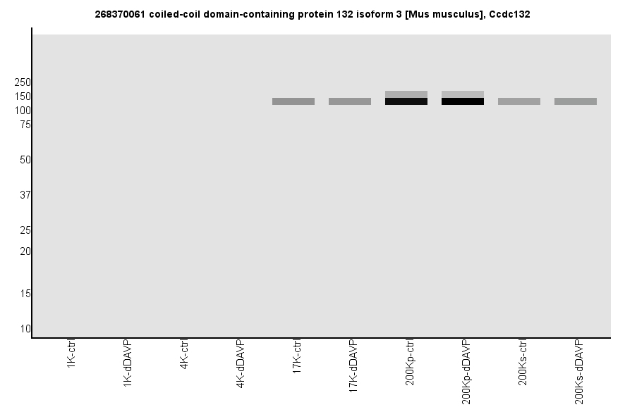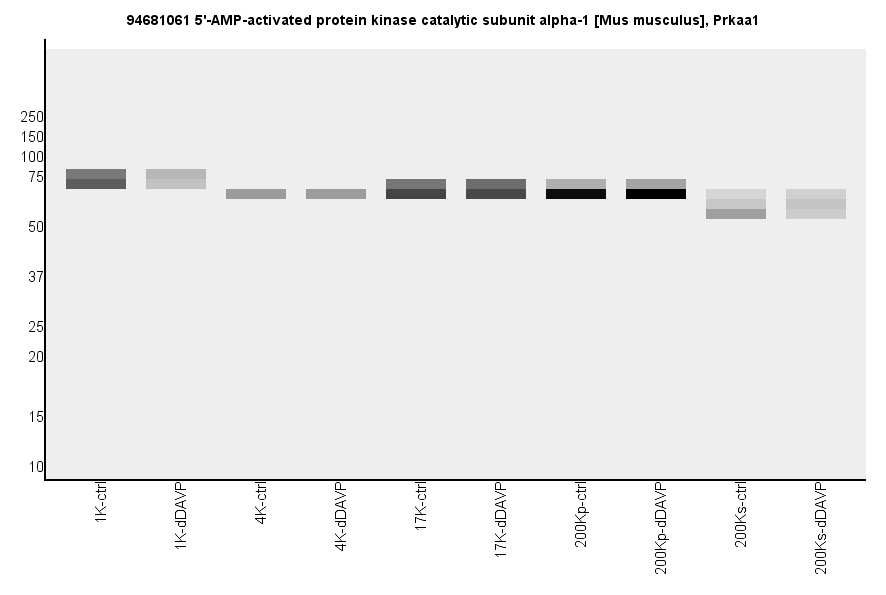 Here, we report large-scale quantification of proteins using LC-MS/MS of subcellular fractions from differential centrifugation in vasopressin- and vehicle-treated mouse mpkCCD cells. Quantification was done by SILAC. Cells treated with the vasopressin analog dDAVP (heavy) or vehicle (light) were mixed 1:1 prior to homogenization and fractionation by differential centrifugation. Fractions were subjected to SDS-PAGE, trypsinization and quantification by LC-MS/MS. Differential centrifugation fractions: 1000 Xg pellet (1K), 4000 Xg pellet (4K), 17,000 Xg pellet (17K), 200,000 Xg pellet (200Kp), and 200,000 Xg supernatant (200Ks). Cells were exposed to vasopressin analog dDAVP at 0.1 nM for 30 minutes. Because each differential centrifugation fraction was resolved by SDS-PAGE and 43 consecutive gel slices were analyzed by MS analysis, the derived data set contains information about the apparent molecular weights of all proteins identified. Such data can be examined individually for each protein by viewing the virtual western blots by mouse over the GI Number at the left. Here, we analyze apparent molecular weights in the entire population of proteins identified compared to the calculated molecular weights obtained from the RefSeq protein records.