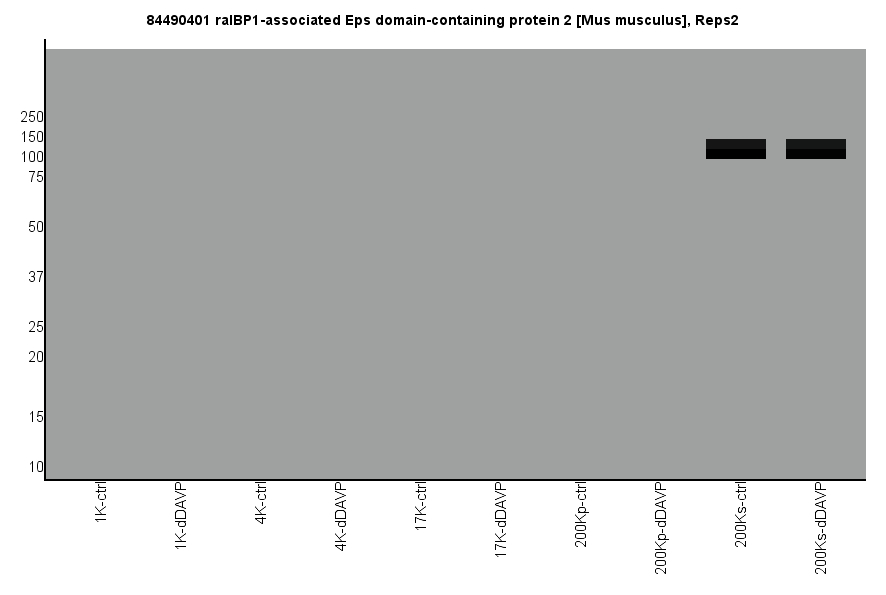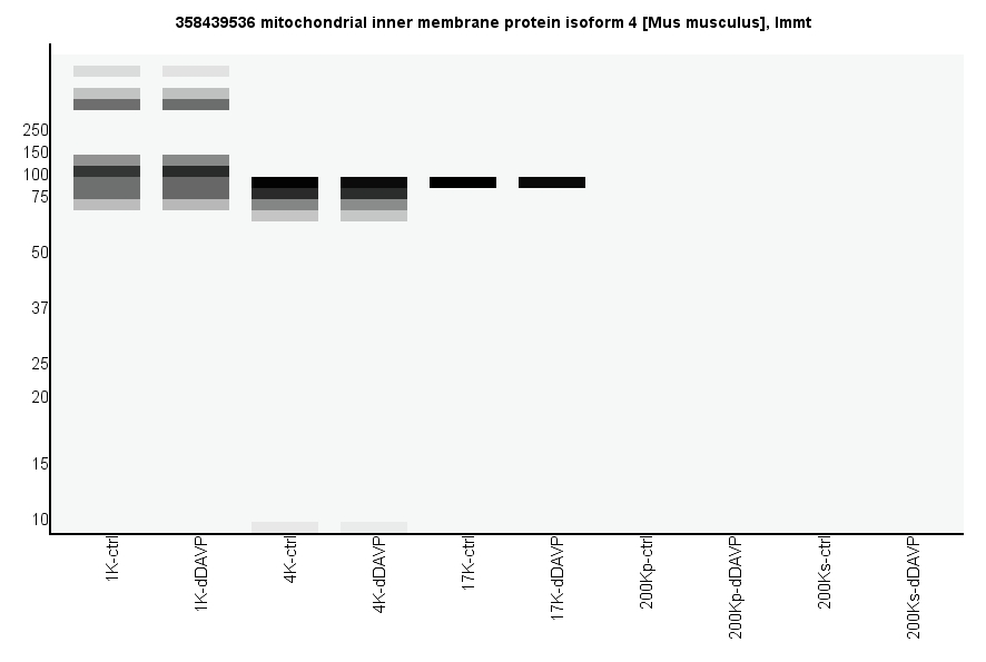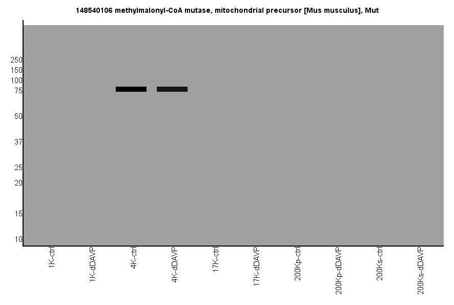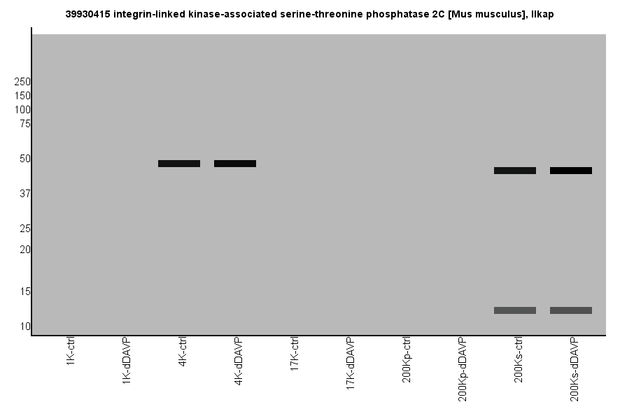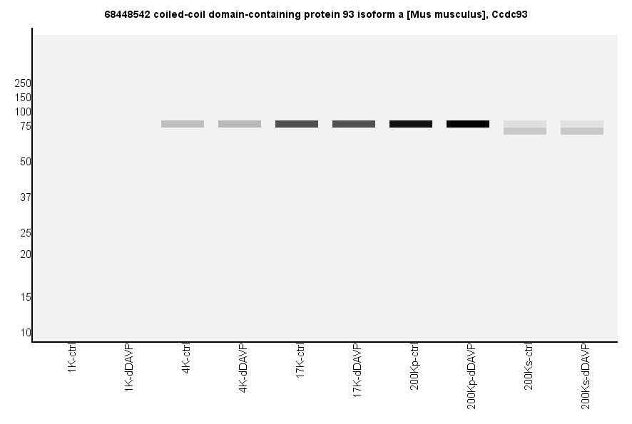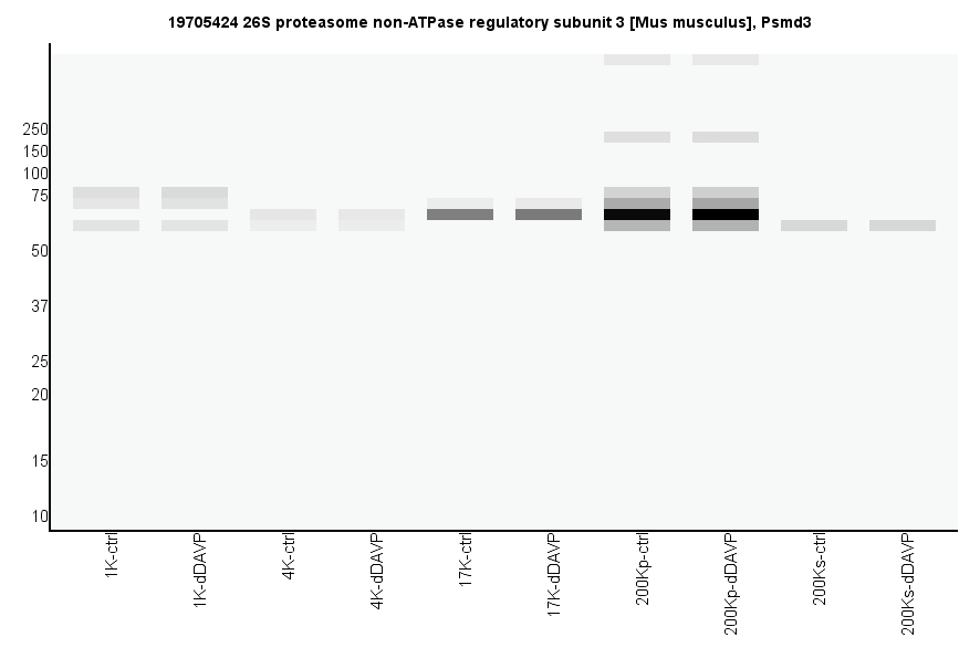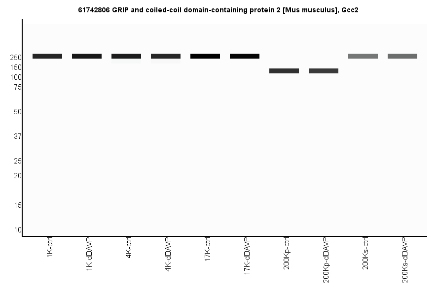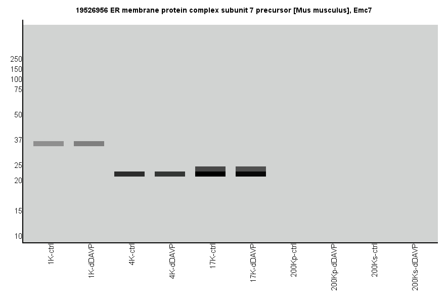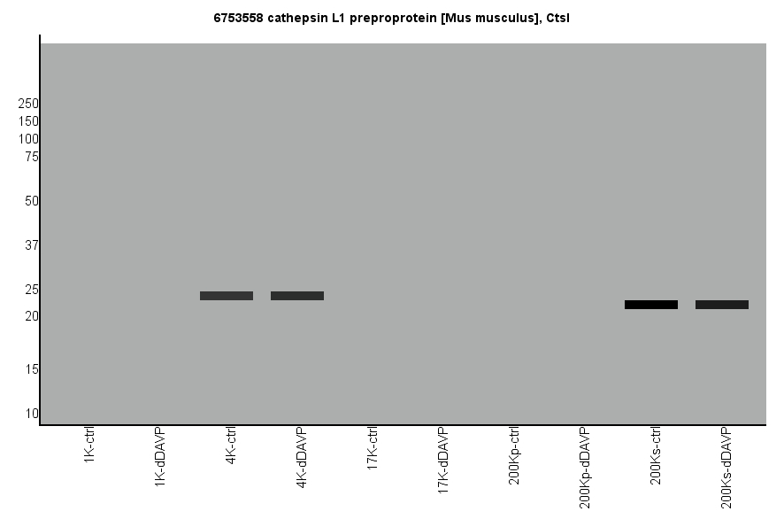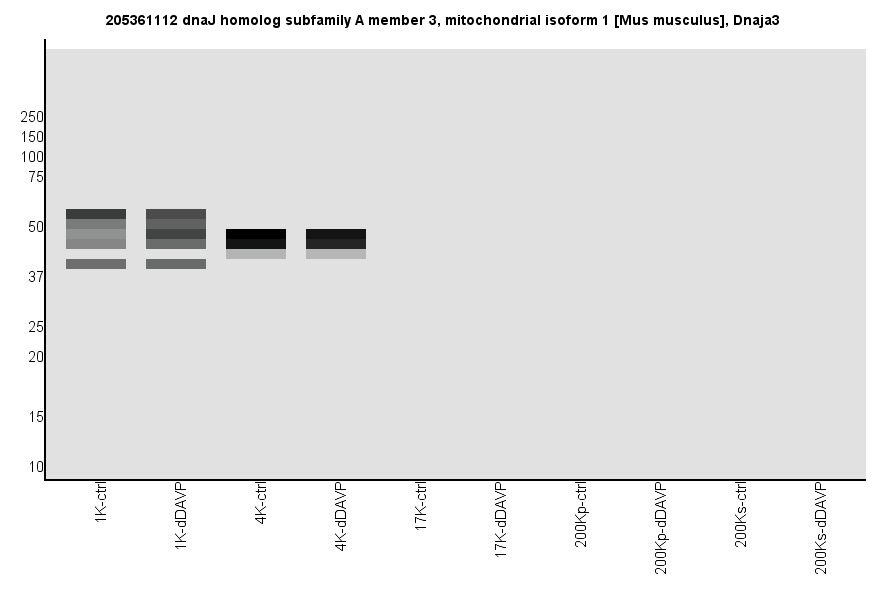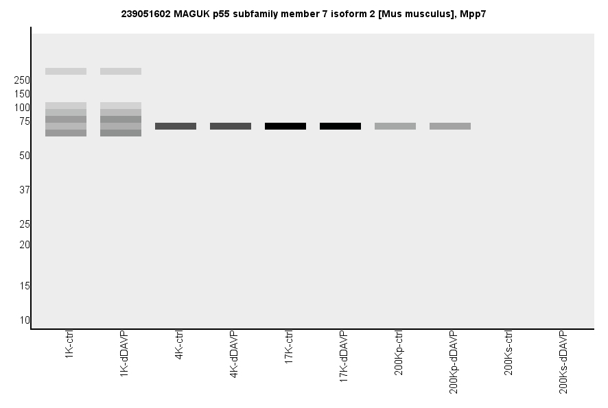 Here, we report large-scale quantification of proteins using LC-MS/MS of subcellular fractions from differential centrifugation in vasopressin- and vehicle-treated mouse mpkCCD cells. Quantification was done by SILAC. Cells treated with the vasopressin analog dDAVP (heavy) or vehicle (light) were mixed 1:1 prior to homogenization and fractionation by differential centrifugation. Fractions were subjected to SDS-PAGE, trypsinization and quantification by LC-MS/MS. Differential centrifugation fractions: 1000 Xg pellet (1K), 4000 Xg pellet (4K), 17,000 Xg pellet (17K), 200,000 Xg pellet (200Kp), and 200,000 Xg supernatant (200Ks). Cells were exposed to vasopressin analog dDAVP at 0.1 nM for 30 minutes. Because each differential centrifugation fraction was resolved by SDS-PAGE and 43 consecutive gel slices were analyzed by MS analysis, the derived data set contains information about the apparent molecular weights of all proteins identified. Such data can be examined individually for each protein by viewing the virtual western blots by mouse over the GI Number at the left. Here, we analyze apparent molecular weights in the entire population of proteins identified compared to the calculated molecular weights obtained from the RefSeq protein records.