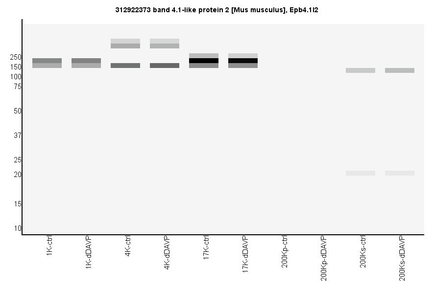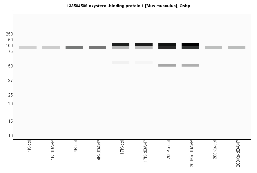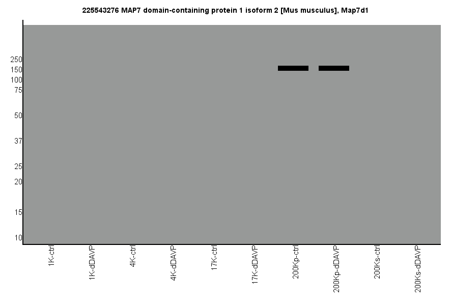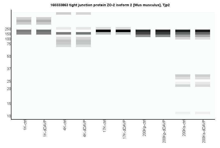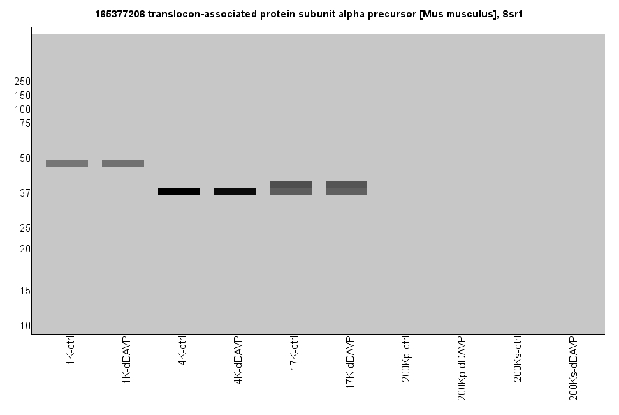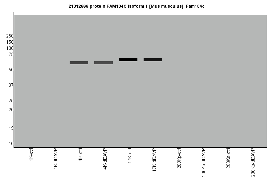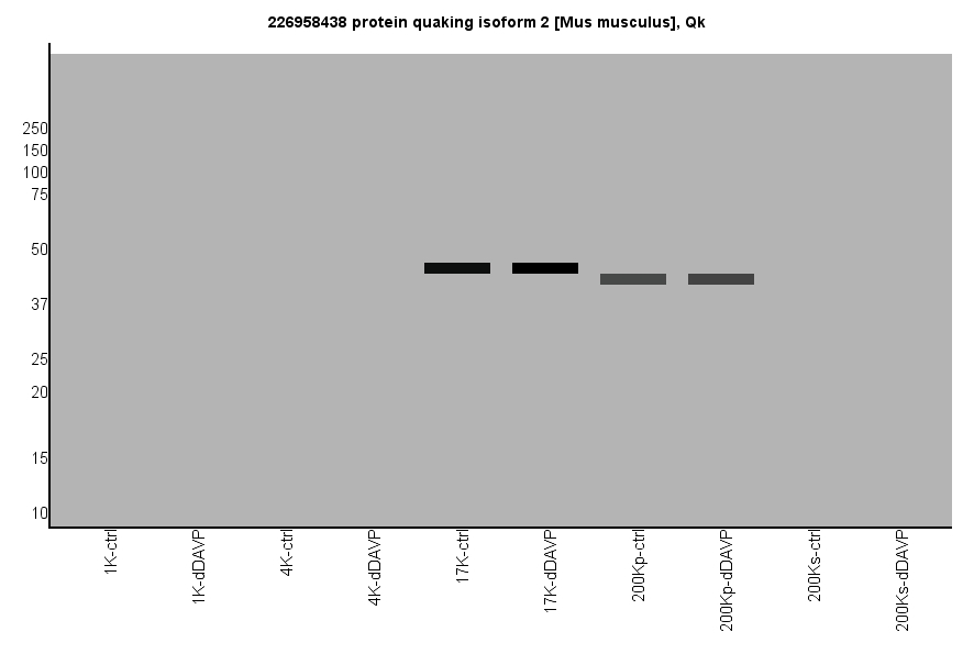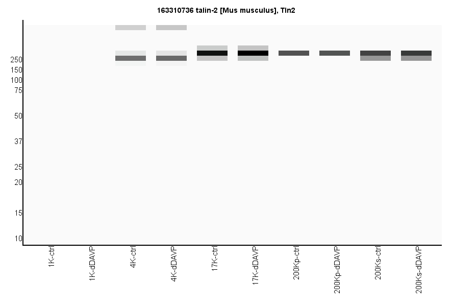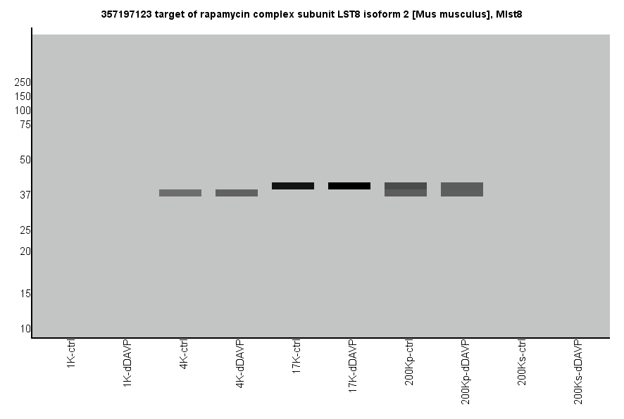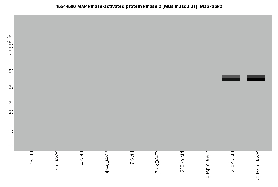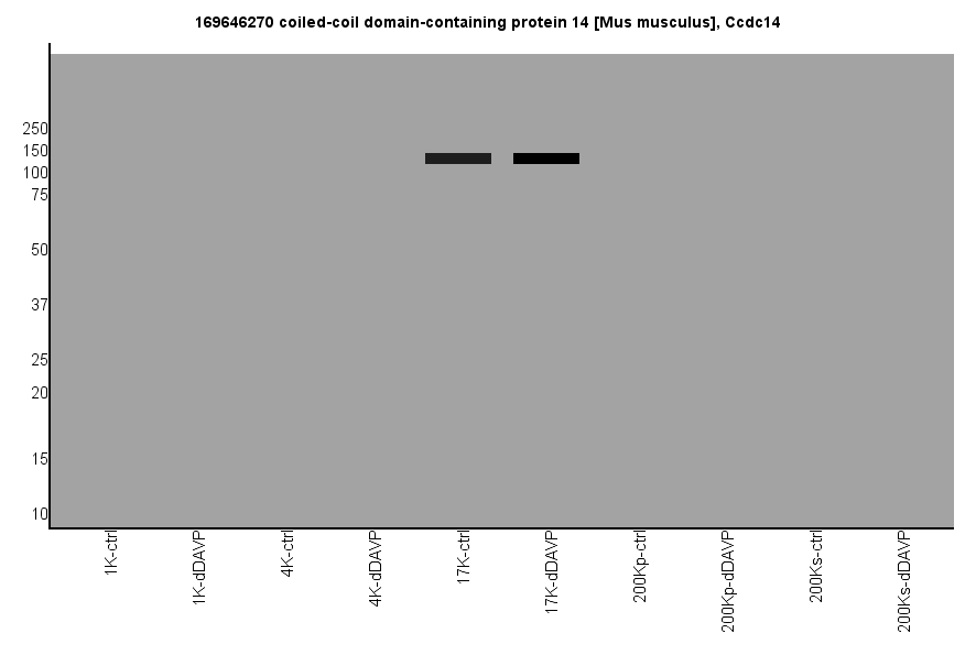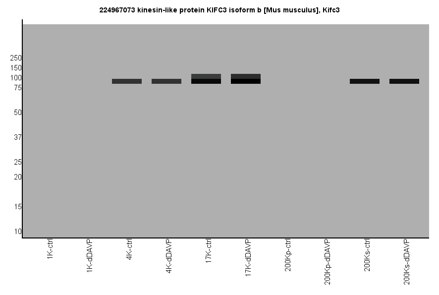 Here, we report large-scale quantification of proteins using LC-MS/MS of subcellular fractions from differential centrifugation in vasopressin- and vehicle-treated mouse mpkCCD cells. Quantification was done by SILAC. Cells treated with the vasopressin analog dDAVP (heavy) or vehicle (light) were mixed 1:1 prior to homogenization and fractionation by differential centrifugation. Fractions were subjected to SDS-PAGE, trypsinization and quantification by LC-MS/MS. Differential centrifugation fractions: 1000 Xg pellet (1K), 4000 Xg pellet (4K), 17,000 Xg pellet (17K), 200,000 Xg pellet (200Kp), and 200,000 Xg supernatant (200Ks). Cells were exposed to vasopressin analog dDAVP at 0.1 nM for 30 minutes. Because each differential centrifugation fraction was resolved by SDS-PAGE and 43 consecutive gel slices were analyzed by MS analysis, the derived data set contains information about the apparent molecular weights of all proteins identified. Such data can be examined individually for each protein by viewing the virtual western blots by mouse over the GI Number at the left. Here, we analyze apparent molecular weights in the entire population of proteins identified compared to the calculated molecular weights obtained from the RefSeq protein records.
