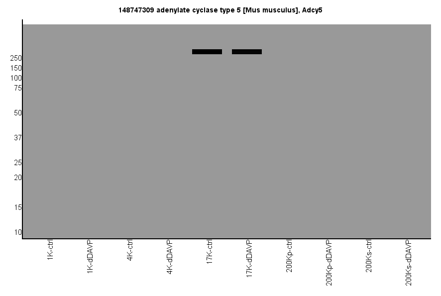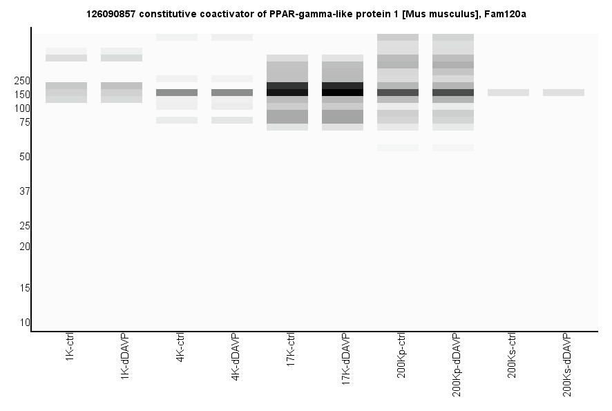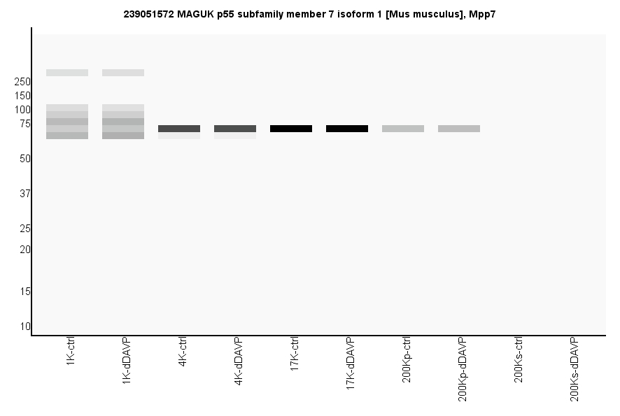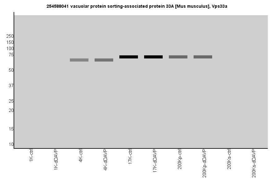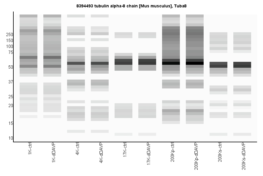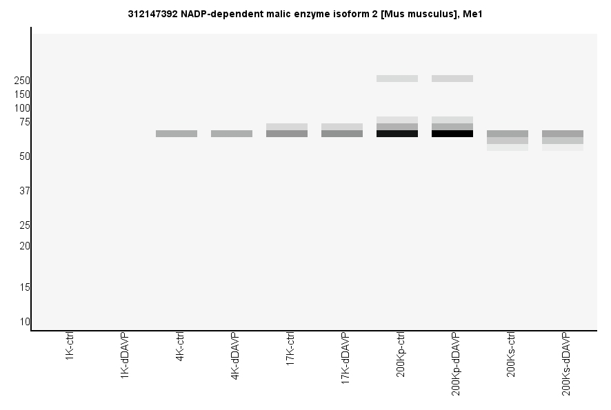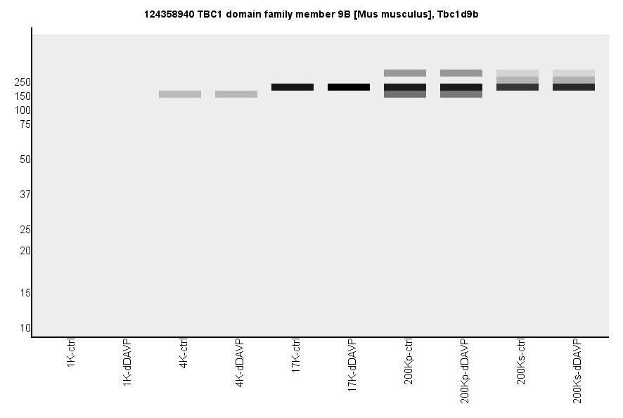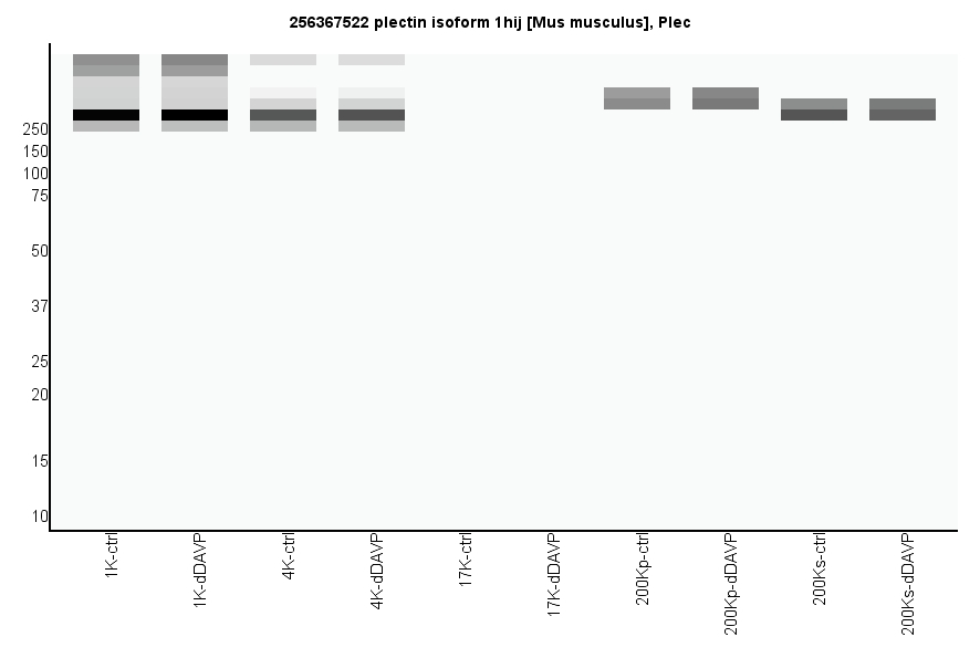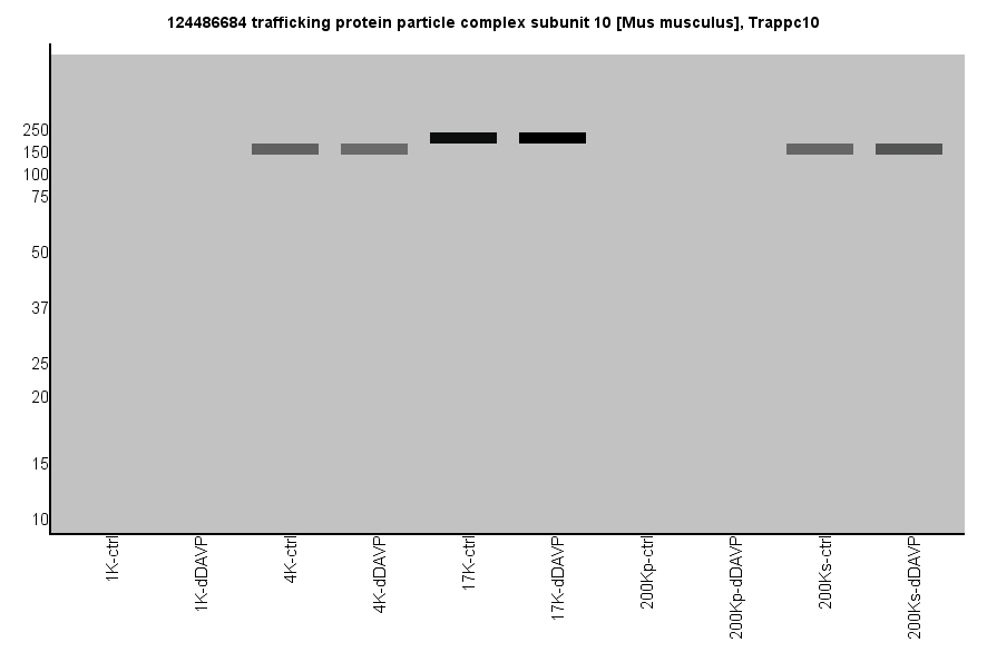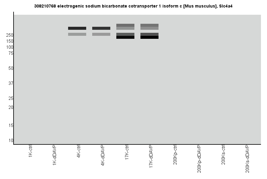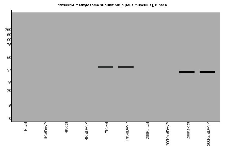 Here, we report large-scale quantification of proteins using LC-MS/MS of subcellular fractions from differential centrifugation in vasopressin- and vehicle-treated mouse mpkCCD cells. Quantification was done by SILAC. Cells treated with the vasopressin analog dDAVP (heavy) or vehicle (light) were mixed 1:1 prior to homogenization and fractionation by differential centrifugation. Fractions were subjected to SDS-PAGE, trypsinization and quantification by LC-MS/MS. Differential centrifugation fractions: 1000 Xg pellet (1K), 4000 Xg pellet (4K), 17,000 Xg pellet (17K), 200,000 Xg pellet (200Kp), and 200,000 Xg supernatant (200Ks). Cells were exposed to vasopressin analog dDAVP at 0.1 nM for 30 minutes. Because each differential centrifugation fraction was resolved by SDS-PAGE and 43 consecutive gel slices were analyzed by MS analysis, the derived data set contains information about the apparent molecular weights of all proteins identified. Such data can be examined individually for each protein by viewing the virtual western blots by mouse over the GI Number at the left. Here, we analyze apparent molecular weights in the entire population of proteins identified compared to the calculated molecular weights obtained from the RefSeq protein records.