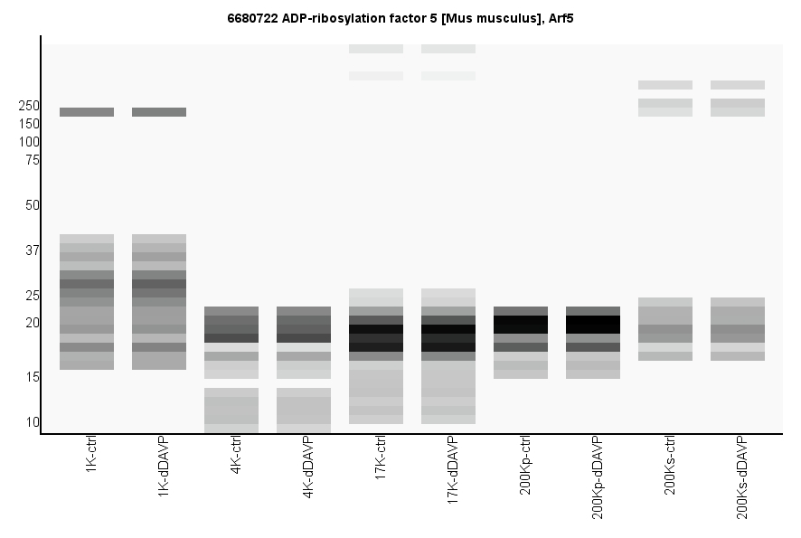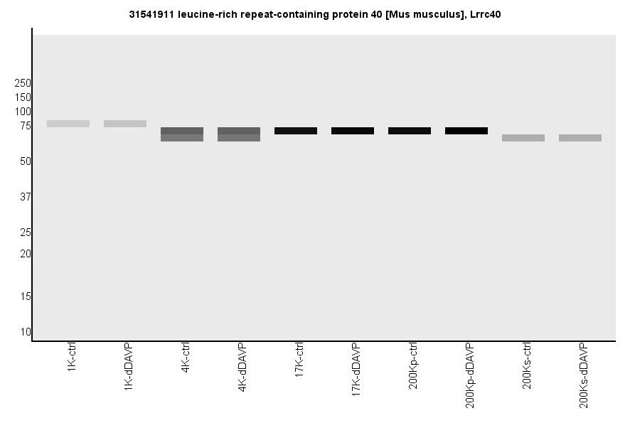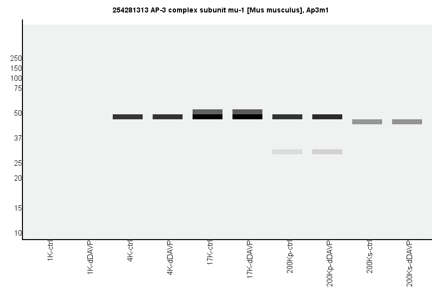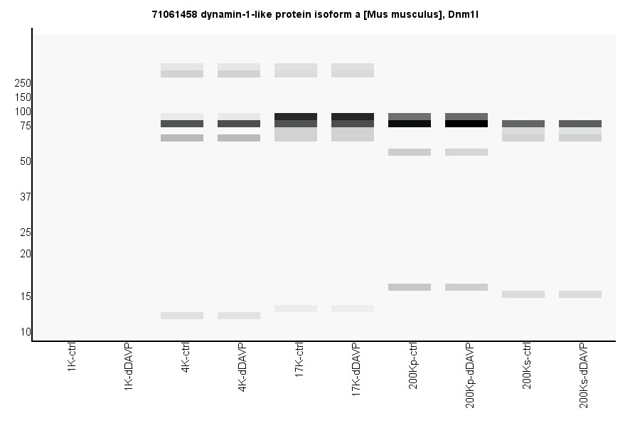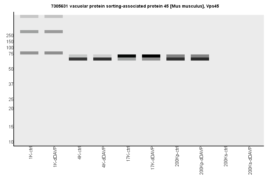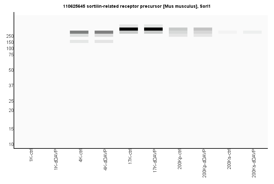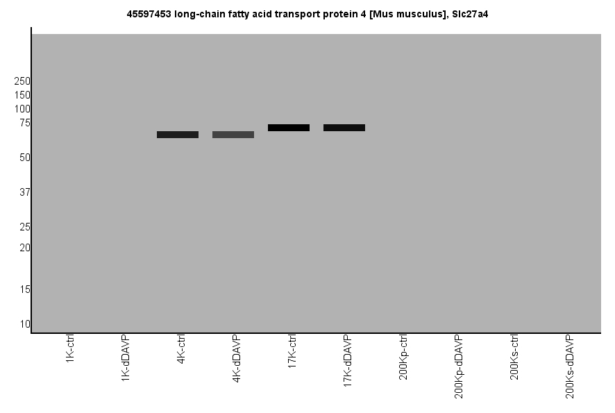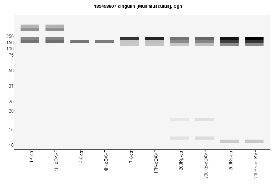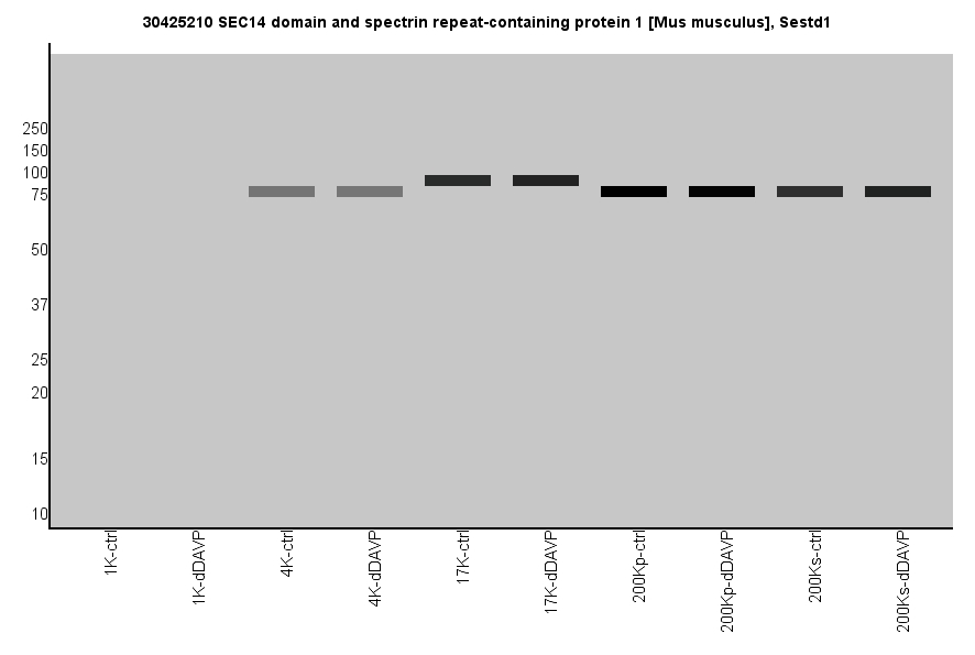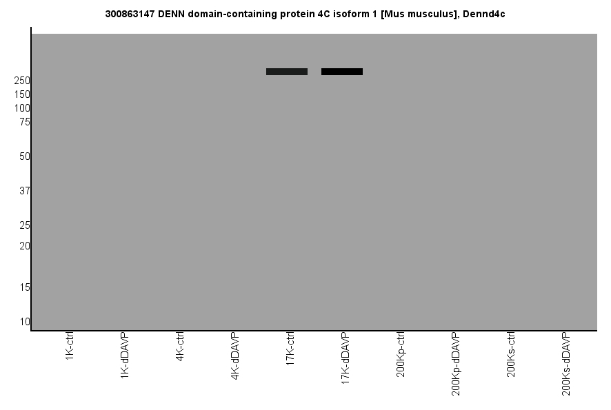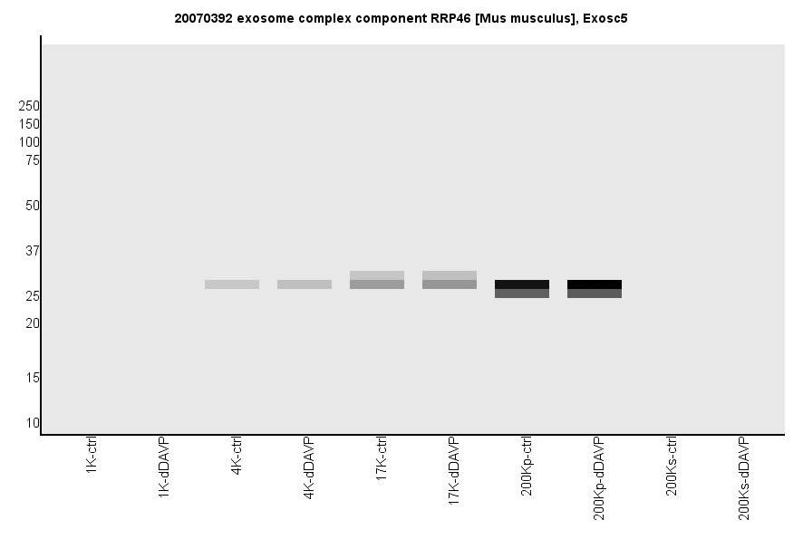 Here, we report large-scale quantification of proteins using LC-MS/MS of subcellular fractions from differential centrifugation in vasopressin- and vehicle-treated mouse mpkCCD cells. Quantification was done by SILAC. Cells treated with the vasopressin analog dDAVP (heavy) or vehicle (light) were mixed 1:1 prior to homogenization and fractionation by differential centrifugation. Fractions were subjected to SDS-PAGE, trypsinization and quantification by LC-MS/MS. Differential centrifugation fractions: 1000 Xg pellet (1K), 4000 Xg pellet (4K), 17,000 Xg pellet (17K), 200,000 Xg pellet (200Kp), and 200,000 Xg supernatant (200Ks). Cells were exposed to vasopressin analog dDAVP at 0.1 nM for 30 minutes. Because each differential centrifugation fraction was resolved by SDS-PAGE and 43 consecutive gel slices were analyzed by MS analysis, the derived data set contains information about the apparent molecular weights of all proteins identified. Such data can be examined individually for each protein by viewing the virtual western blots by mouse over the GI Number at the left. Here, we analyze apparent molecular weights in the entire population of proteins identified compared to the calculated molecular weights obtained from the RefSeq protein records.