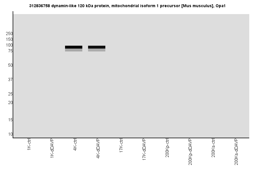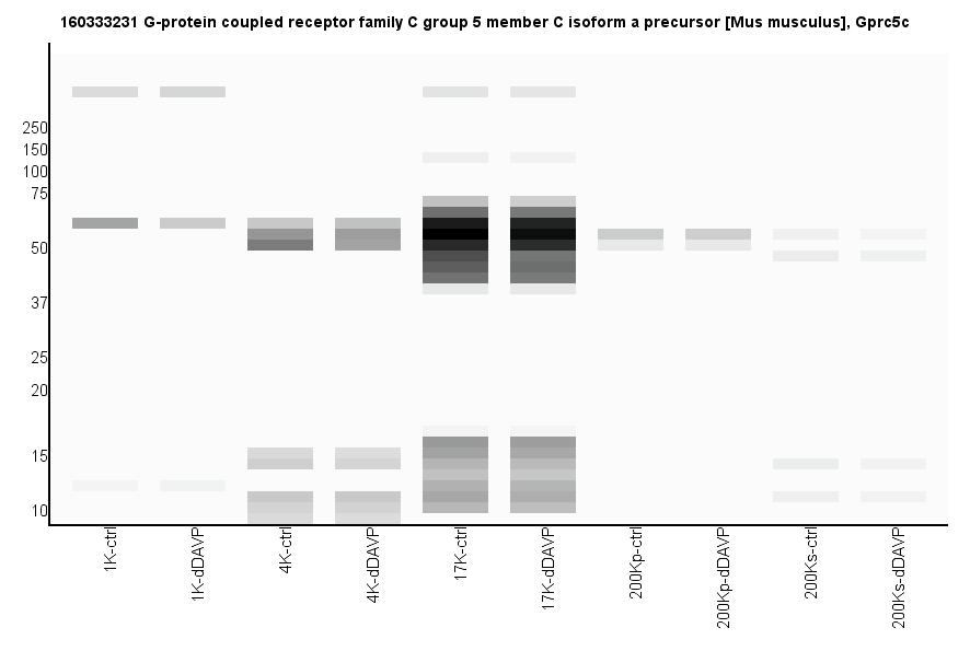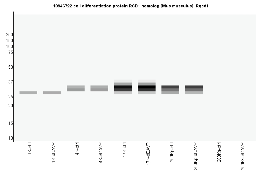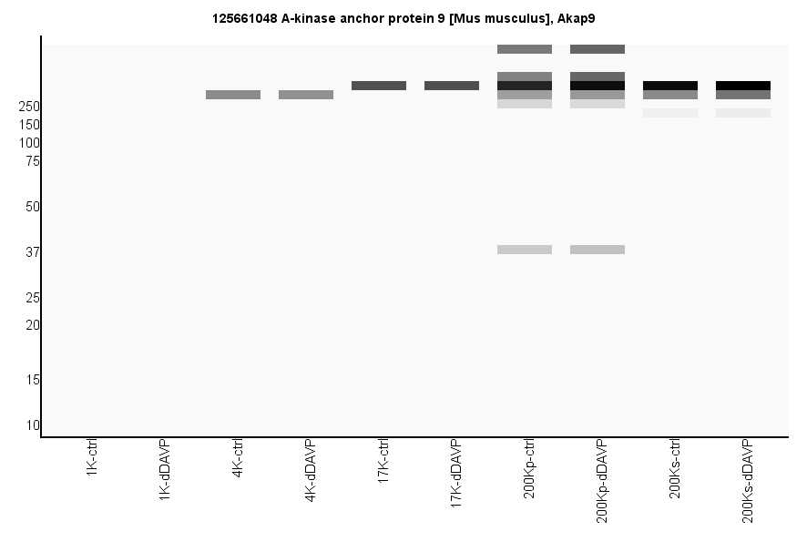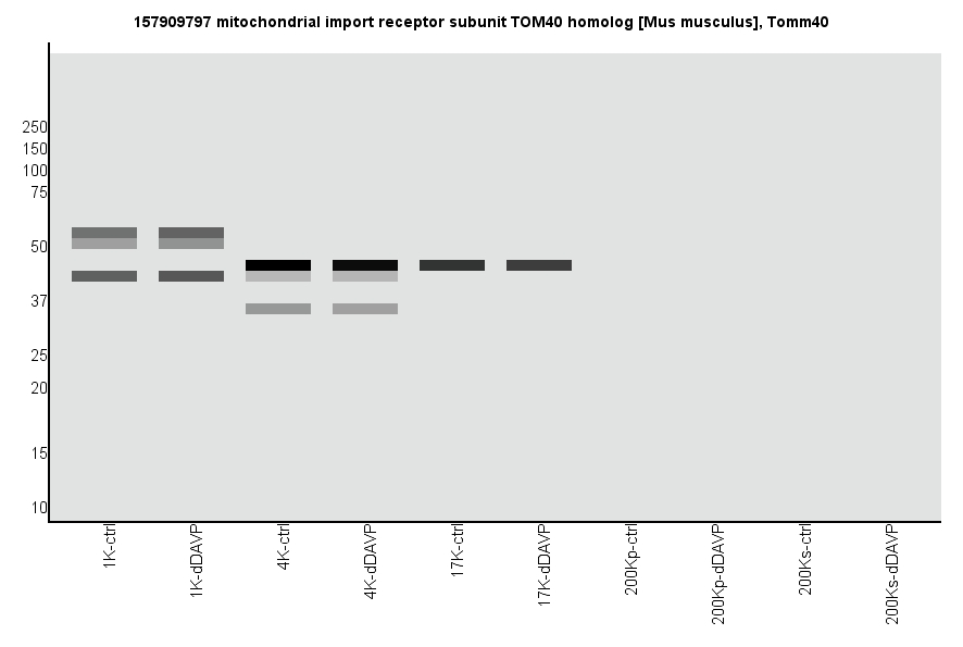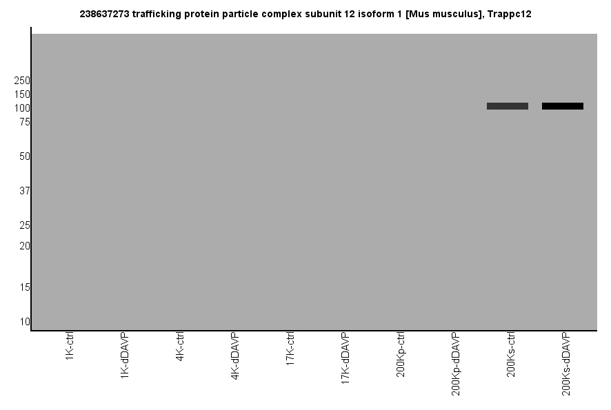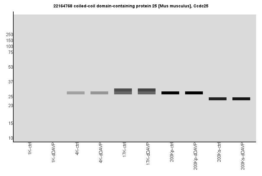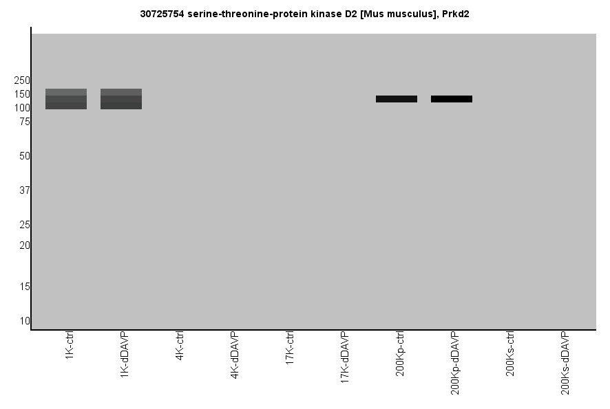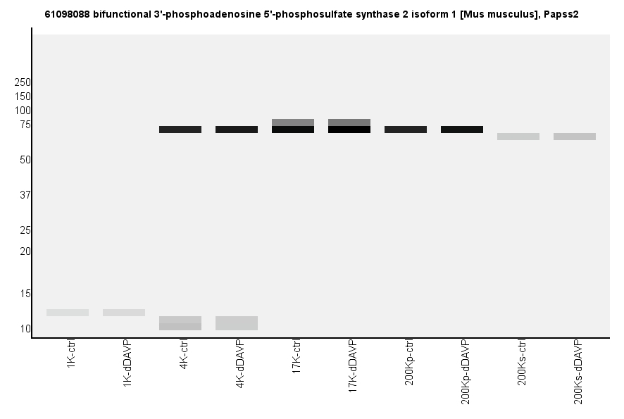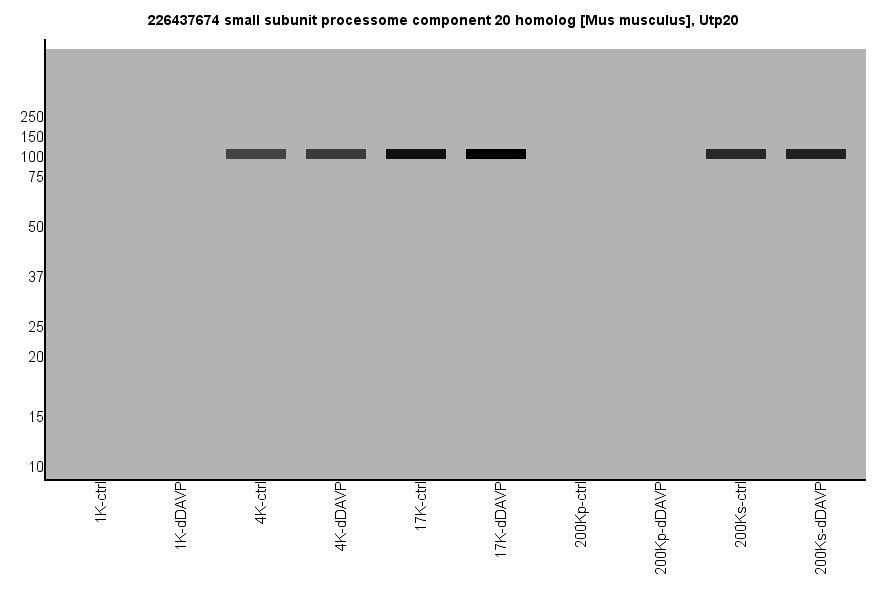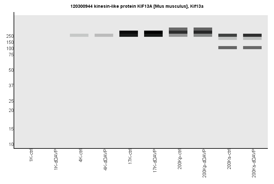 Here, we report large-scale quantification of proteins using LC-MS/MS of subcellular fractions from differential centrifugation in vasopressin- and vehicle-treated mouse mpkCCD cells. Quantification was done by SILAC. Cells treated with the vasopressin analog dDAVP (heavy) or vehicle (light) were mixed 1:1 prior to homogenization and fractionation by differential centrifugation. Fractions were subjected to SDS-PAGE, trypsinization and quantification by LC-MS/MS. Differential centrifugation fractions: 1000 Xg pellet (1K), 4000 Xg pellet (4K), 17,000 Xg pellet (17K), 200,000 Xg pellet (200Kp), and 200,000 Xg supernatant (200Ks). Cells were exposed to vasopressin analog dDAVP at 0.1 nM for 30 minutes. Because each differential centrifugation fraction was resolved by SDS-PAGE and 43 consecutive gel slices were analyzed by MS analysis, the derived data set contains information about the apparent molecular weights of all proteins identified. Such data can be examined individually for each protein by viewing the virtual western blots by mouse over the GI Number at the left. Here, we analyze apparent molecular weights in the entire population of proteins identified compared to the calculated molecular weights obtained from the RefSeq protein records.