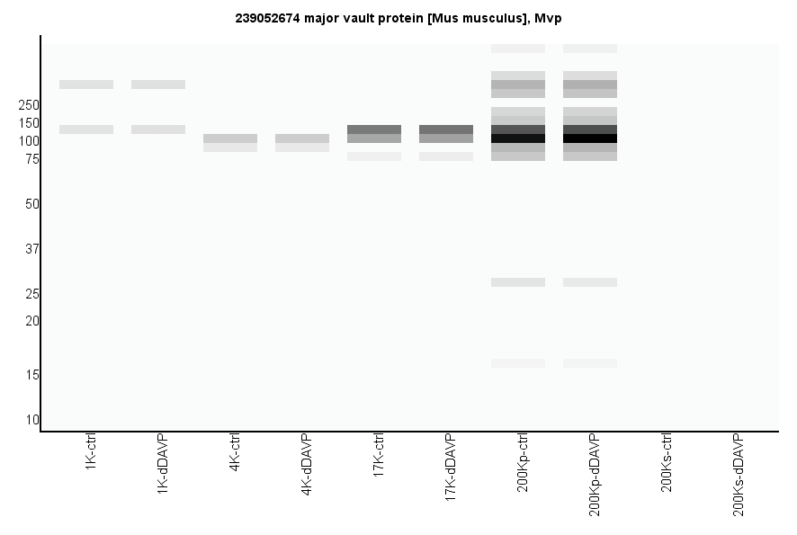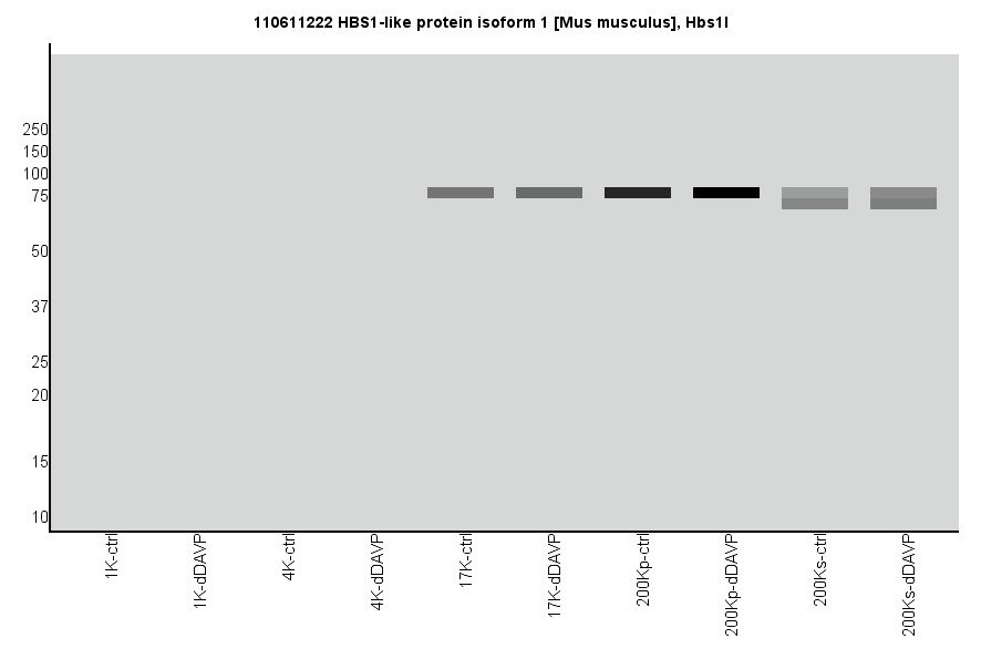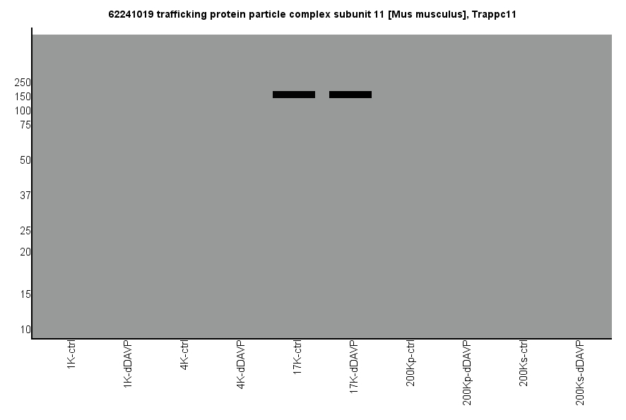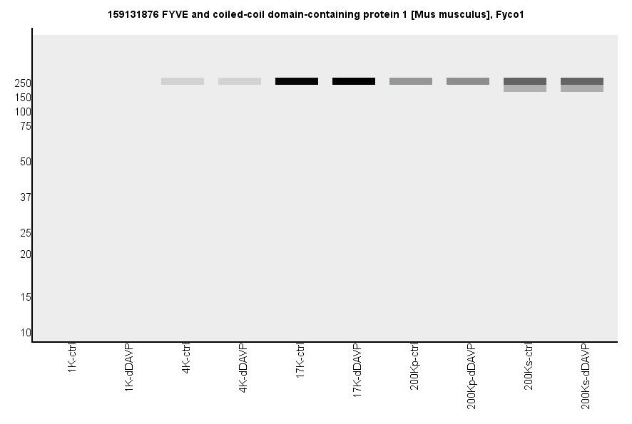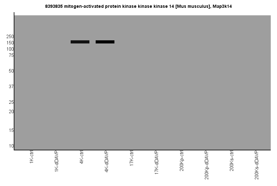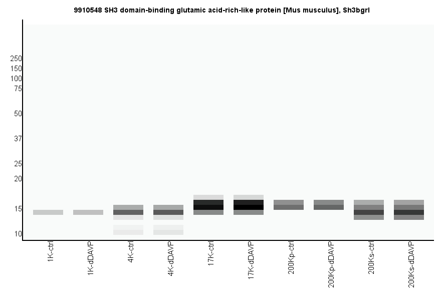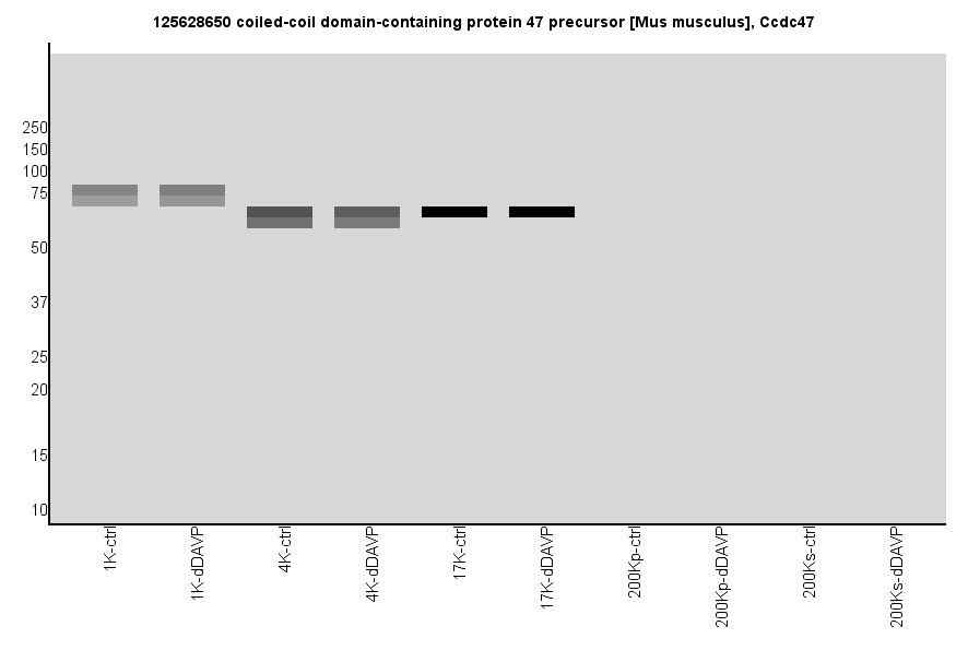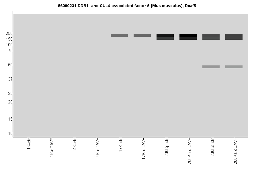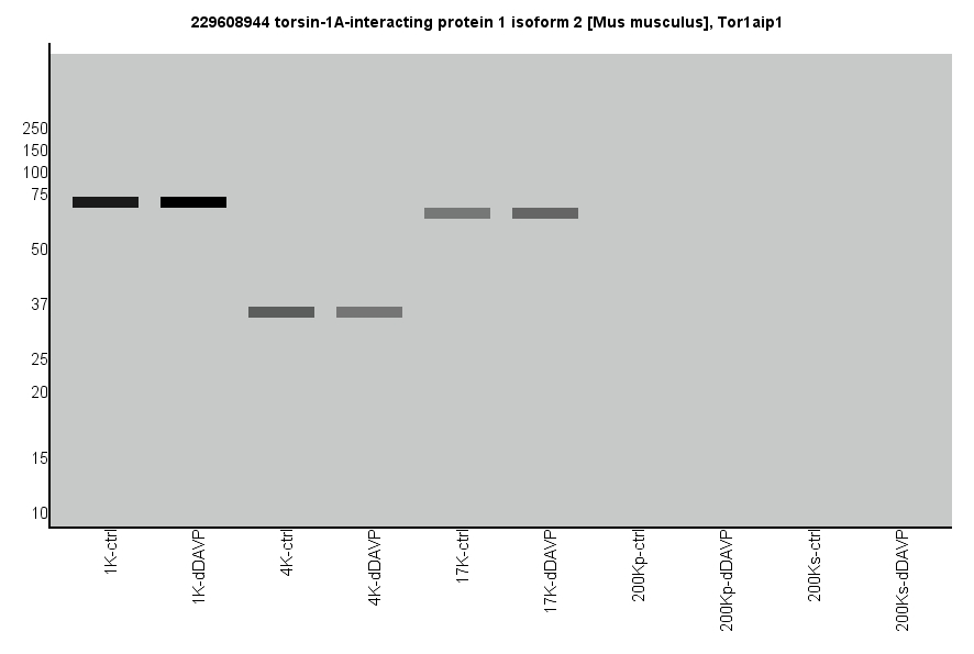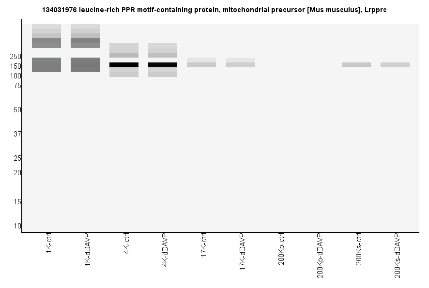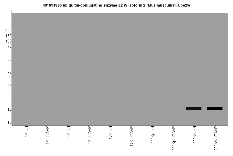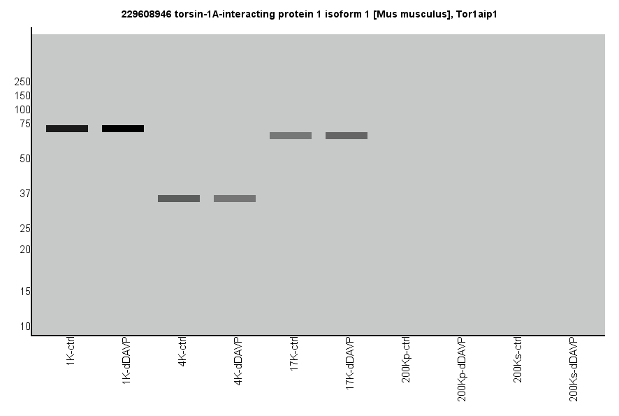 Here, we report large-scale quantification of proteins using LC-MS/MS of subcellular fractions from differential centrifugation in vasopressin- and vehicle-treated mouse mpkCCD cells. Quantification was done by SILAC. Cells treated with the vasopressin analog dDAVP (heavy) or vehicle (light) were mixed 1:1 prior to homogenization and fractionation by differential centrifugation. Fractions were subjected to SDS-PAGE, trypsinization and quantification by LC-MS/MS. Differential centrifugation fractions: 1000 Xg pellet (1K), 4000 Xg pellet (4K), 17,000 Xg pellet (17K), 200,000 Xg pellet (200Kp), and 200,000 Xg supernatant (200Ks). Cells were exposed to vasopressin analog dDAVP at 0.1 nM for 30 minutes. Because each differential centrifugation fraction was resolved by SDS-PAGE and 43 consecutive gel slices were analyzed by MS analysis, the derived data set contains information about the apparent molecular weights of all proteins identified. Such data can be examined individually for each protein by viewing the virtual western blots by mouse over the GI Number at the left. Here, we analyze apparent molecular weights in the entire population of proteins identified compared to the calculated molecular weights obtained from the RefSeq protein records.