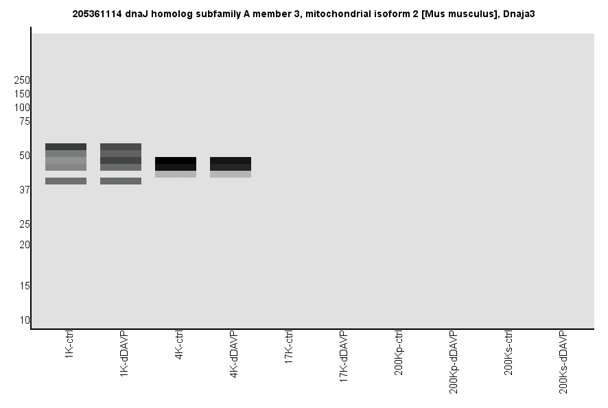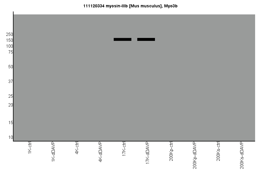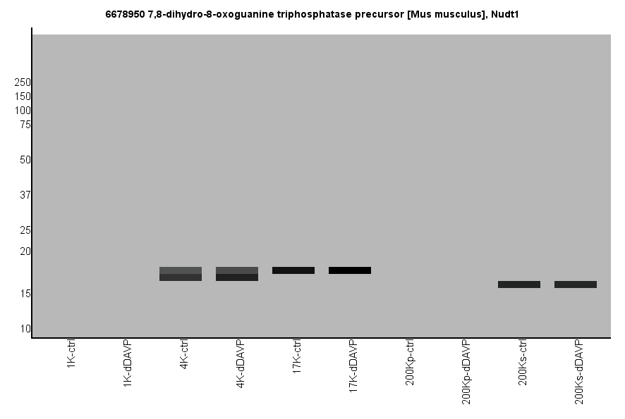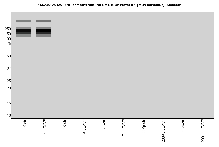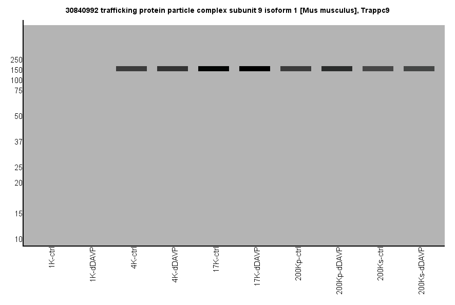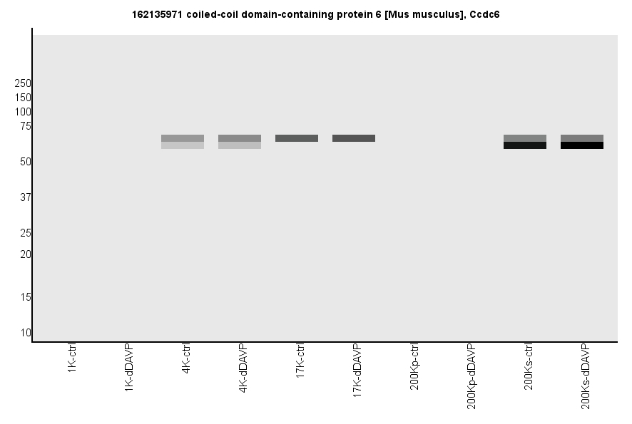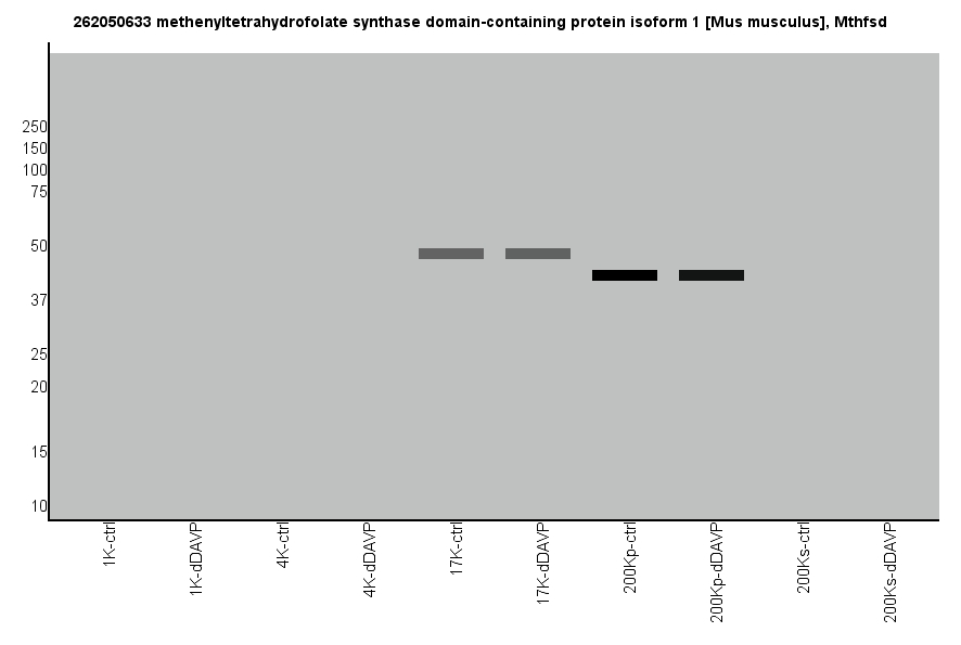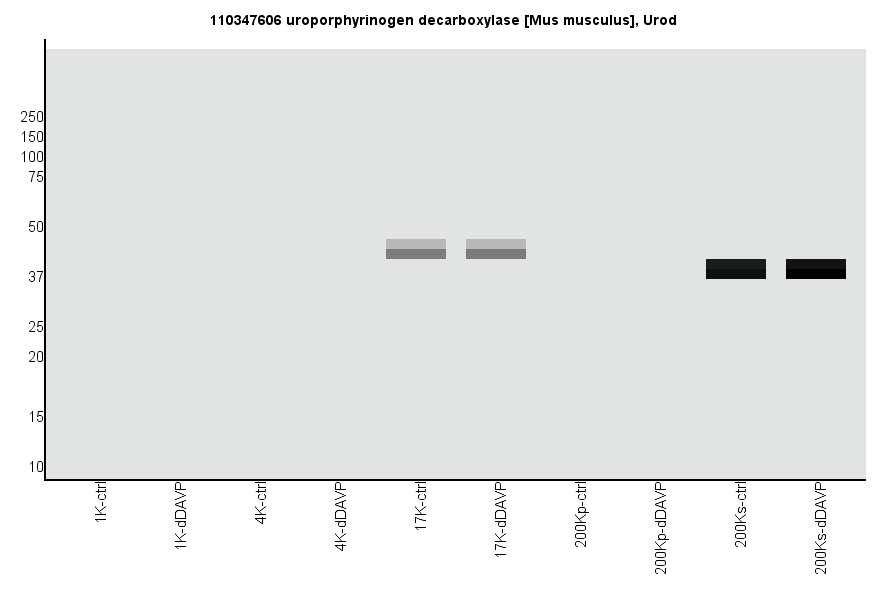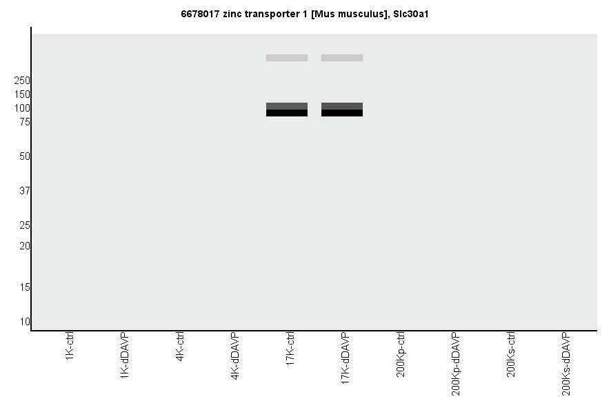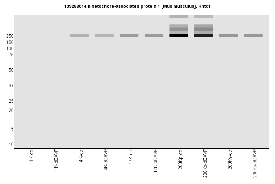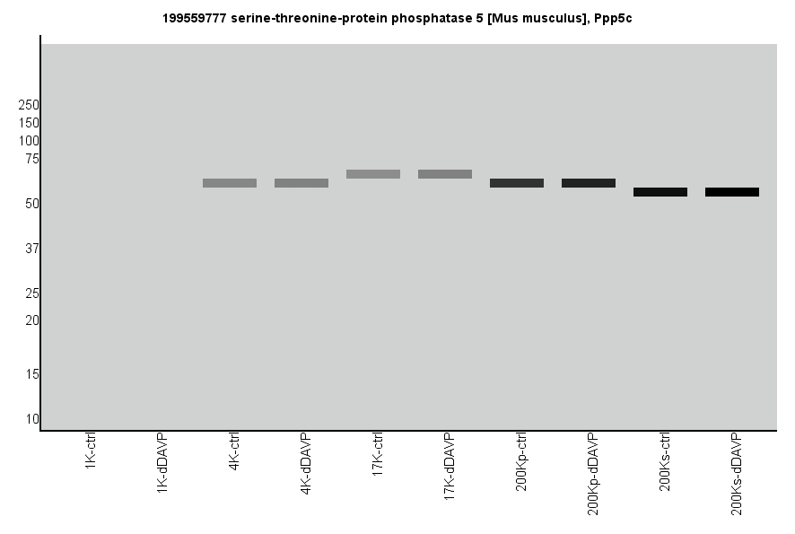 Here, we report large-scale quantification of proteins using LC-MS/MS of subcellular fractions from differential centrifugation in vasopressin- and vehicle-treated mouse mpkCCD cells. Quantification was done by SILAC. Cells treated with the vasopressin analog dDAVP (heavy) or vehicle (light) were mixed 1:1 prior to homogenization and fractionation by differential centrifugation. Fractions were subjected to SDS-PAGE, trypsinization and quantification by LC-MS/MS. Differential centrifugation fractions: 1000 Xg pellet (1K), 4000 Xg pellet (4K), 17,000 Xg pellet (17K), 200,000 Xg pellet (200Kp), and 200,000 Xg supernatant (200Ks). Cells were exposed to vasopressin analog dDAVP at 0.1 nM for 30 minutes. Because each differential centrifugation fraction was resolved by SDS-PAGE and 43 consecutive gel slices were analyzed by MS analysis, the derived data set contains information about the apparent molecular weights of all proteins identified. Such data can be examined individually for each protein by viewing the virtual western blots by mouse over the GI Number at the left. Here, we analyze apparent molecular weights in the entire population of proteins identified compared to the calculated molecular weights obtained from the RefSeq protein records.