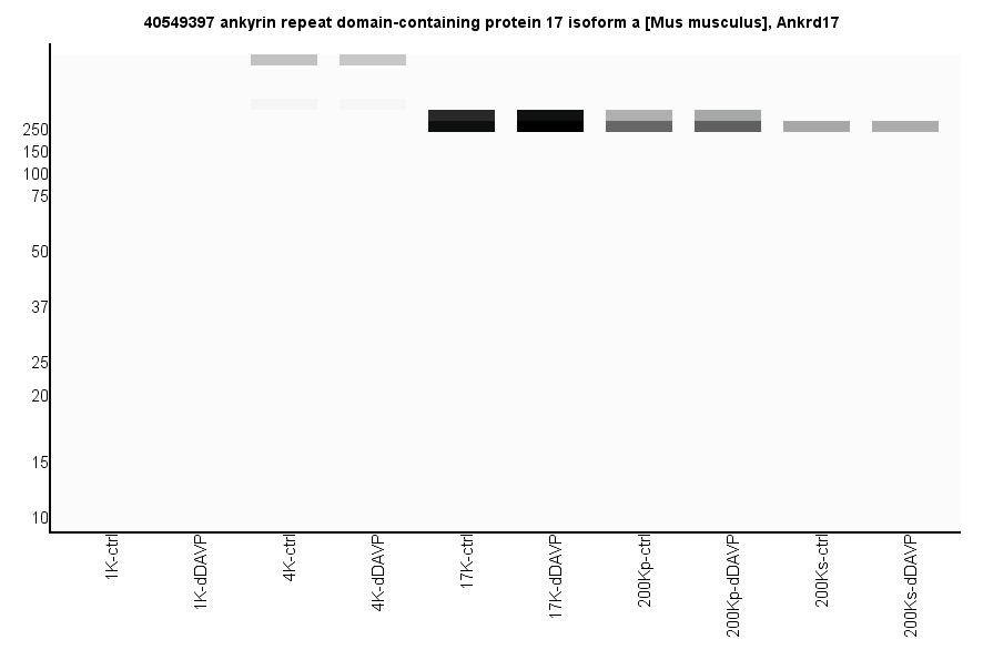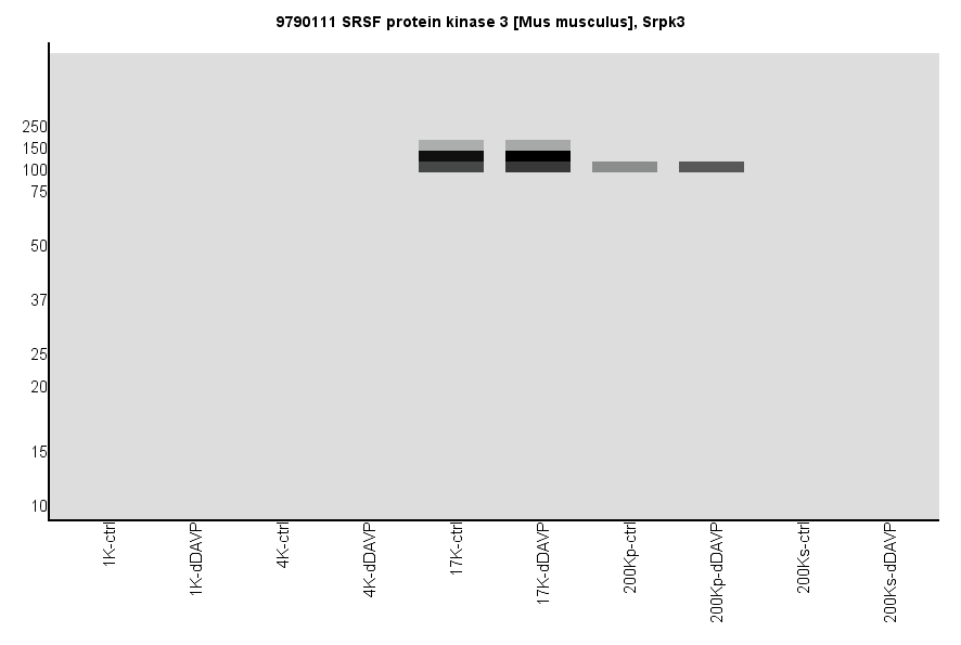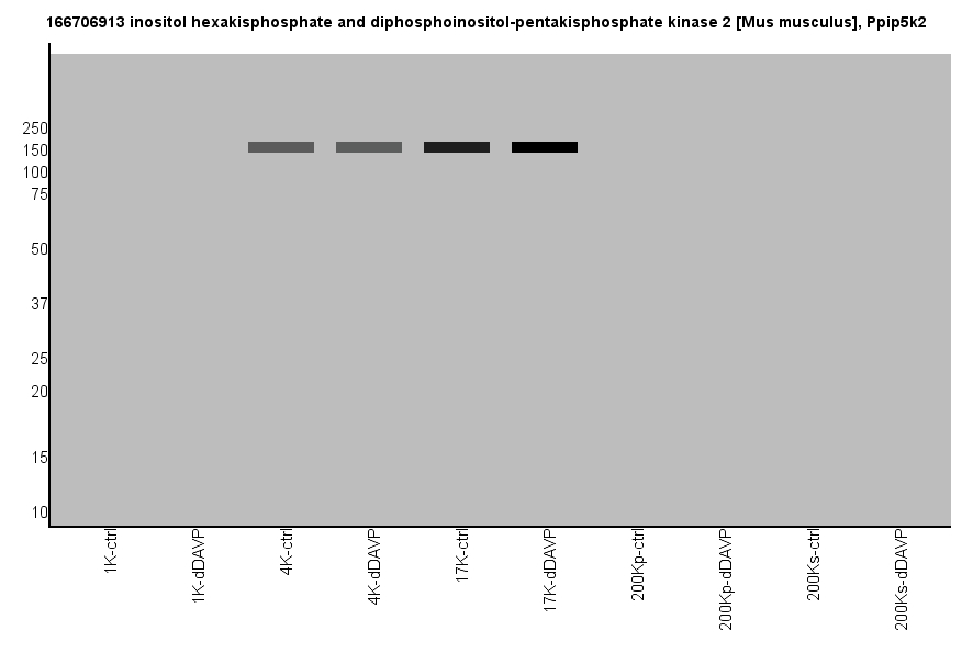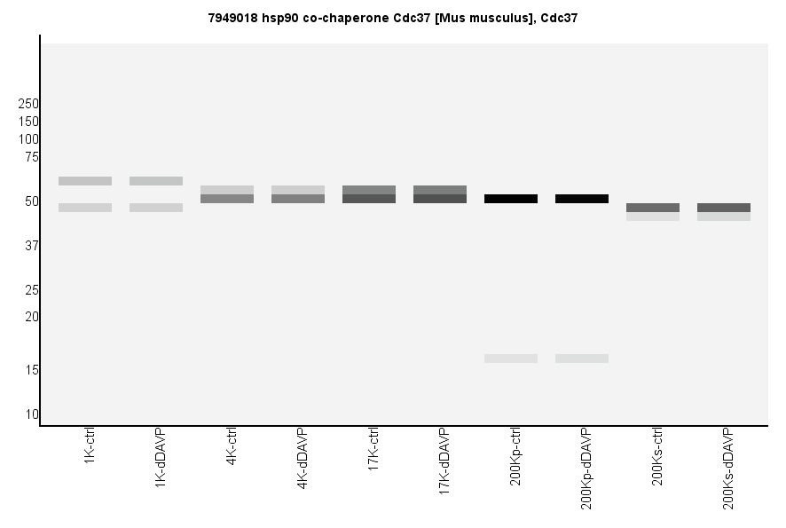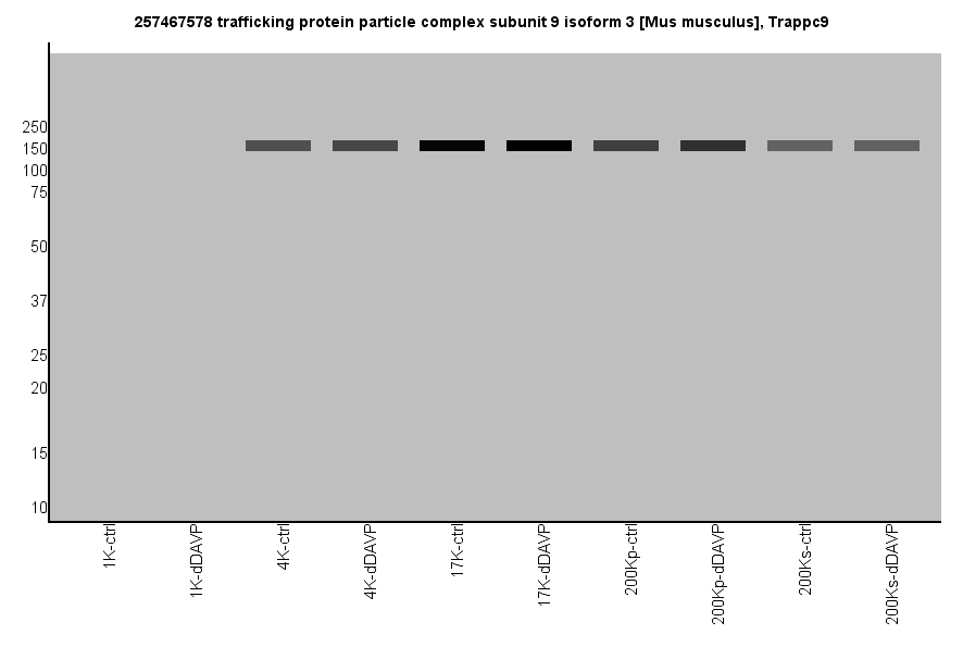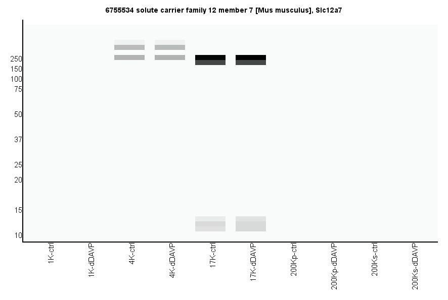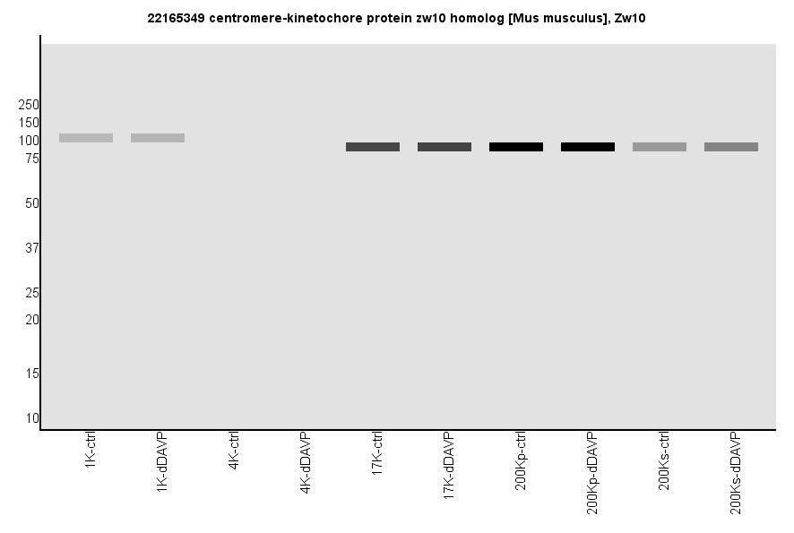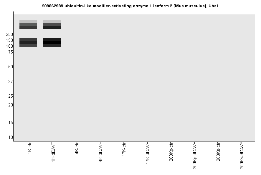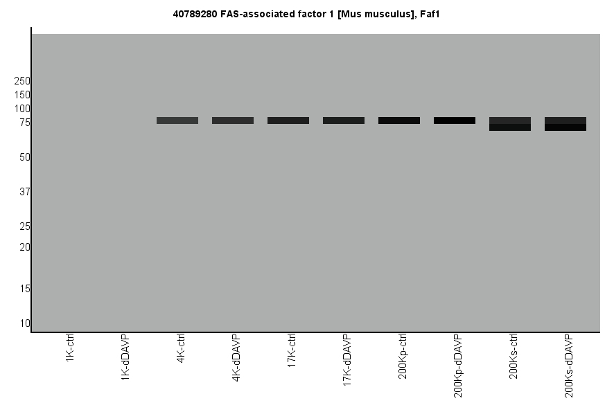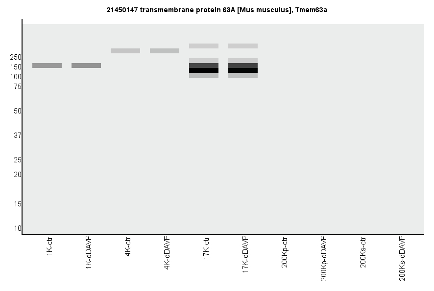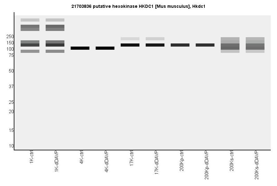 Here, we report large-scale quantification of proteins using LC-MS/MS of subcellular fractions from differential centrifugation in vasopressin- and vehicle-treated mouse mpkCCD cells. Quantification was done by SILAC. Cells treated with the vasopressin analog dDAVP (heavy) or vehicle (light) were mixed 1:1 prior to homogenization and fractionation by differential centrifugation. Fractions were subjected to SDS-PAGE, trypsinization and quantification by LC-MS/MS. Differential centrifugation fractions: 1000 Xg pellet (1K), 4000 Xg pellet (4K), 17,000 Xg pellet (17K), 200,000 Xg pellet (200Kp), and 200,000 Xg supernatant (200Ks). Cells were exposed to vasopressin analog dDAVP at 0.1 nM for 30 minutes. Because each differential centrifugation fraction was resolved by SDS-PAGE and 43 consecutive gel slices were analyzed by MS analysis, the derived data set contains information about the apparent molecular weights of all proteins identified. Such data can be examined individually for each protein by viewing the virtual western blots by mouse over the GI Number at the left. Here, we analyze apparent molecular weights in the entire population of proteins identified compared to the calculated molecular weights obtained from the RefSeq protein records.