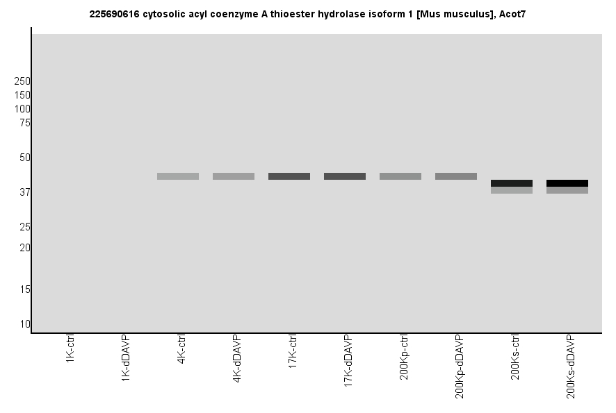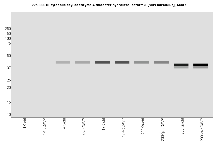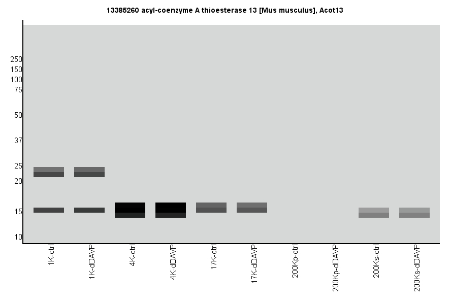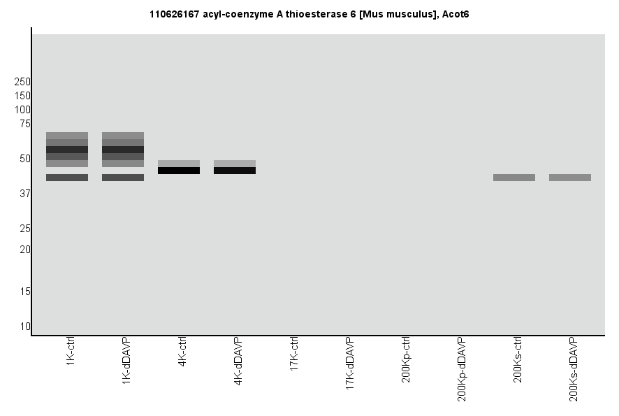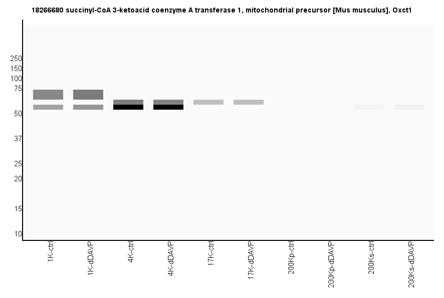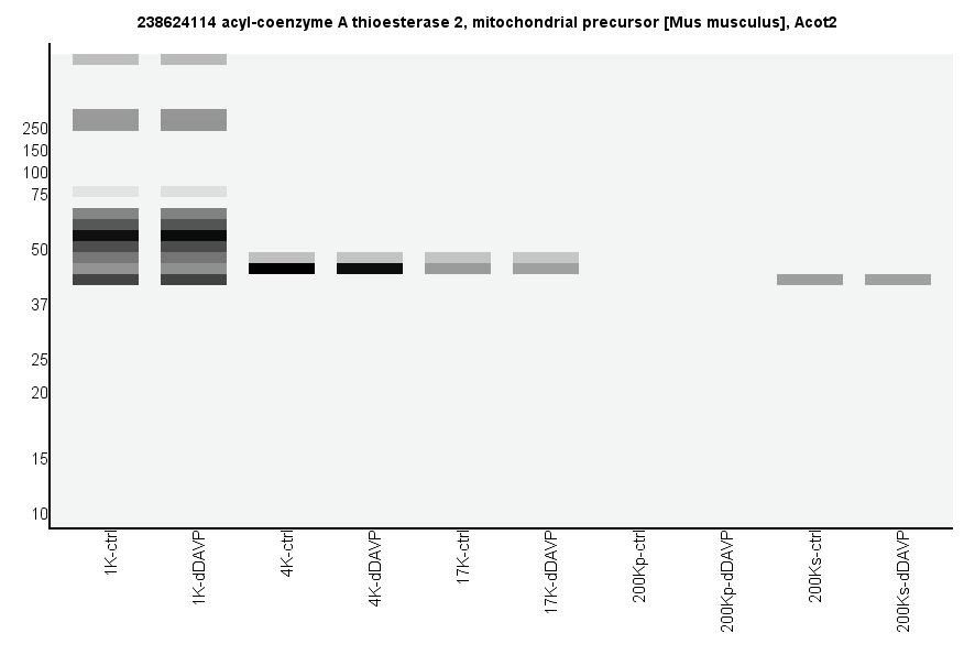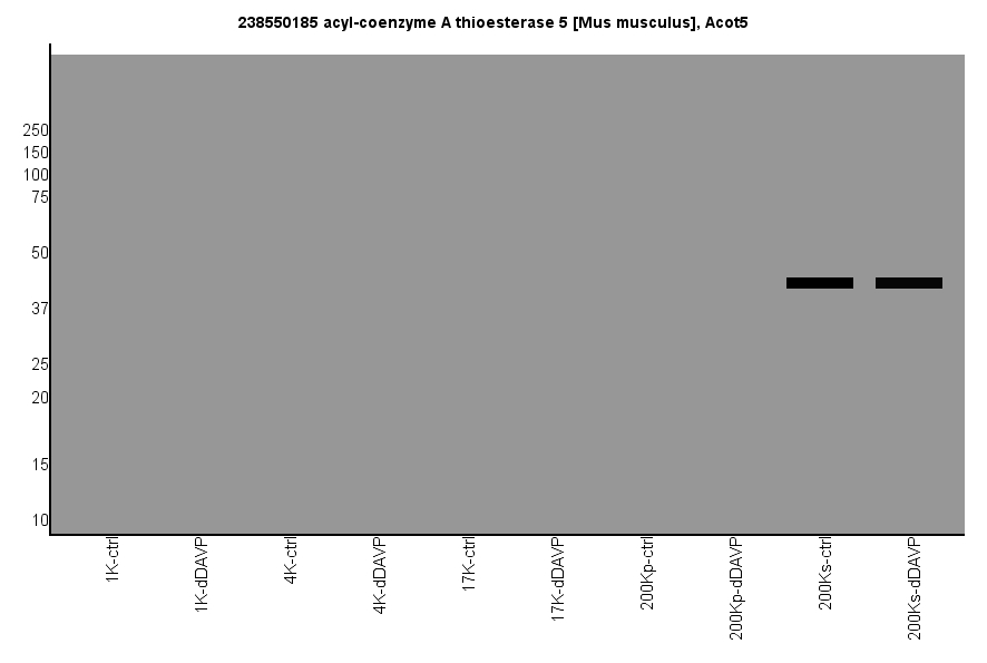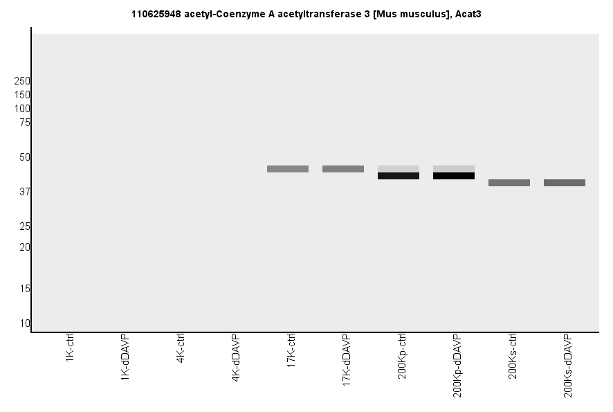 | 21450129 | Acat1 | 41414 | 0.91 | 0.91 | 0.99 | 0.99 | 0.99 | 0.99 | 0.99 | 0.99 | 0.91 | 0.91 | acetyl-CoA acetyltransferase, mitochondrial precursor | |||||||