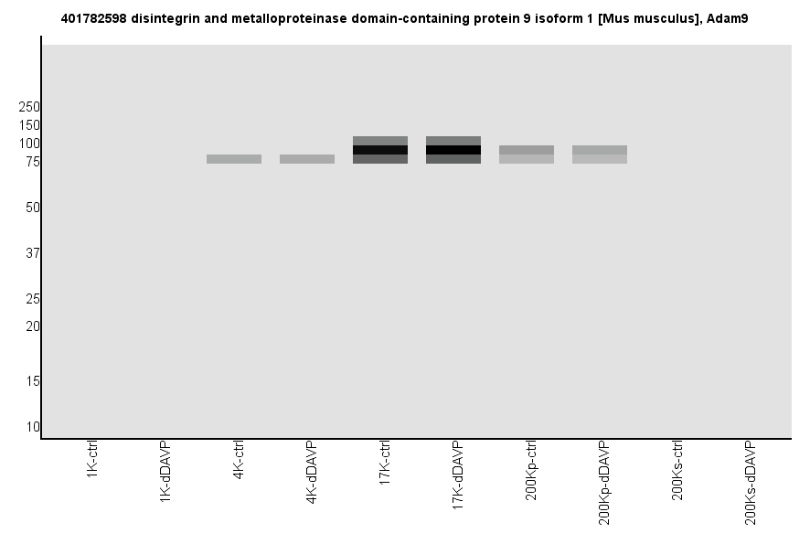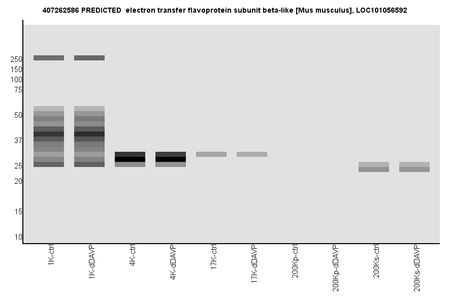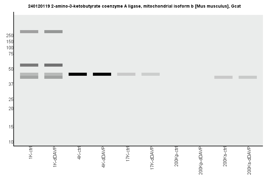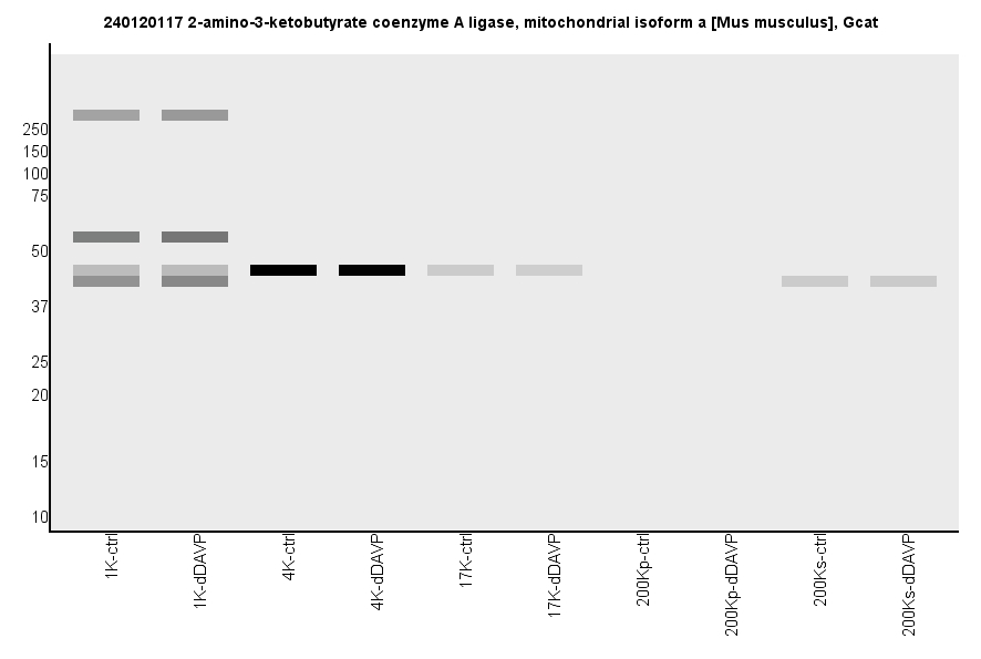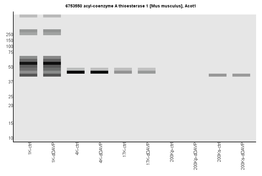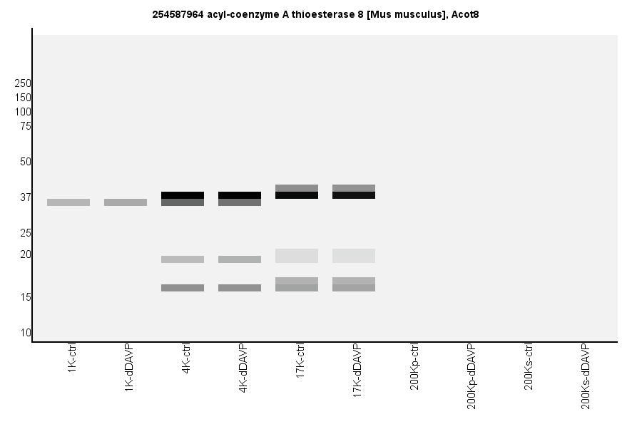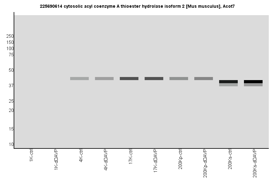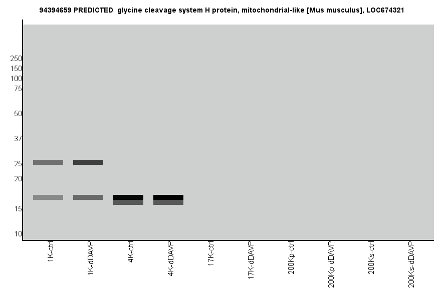 | 21450129 | Acat1 | 41414 | 0.91 | 0.91 | 0.99 | 0.99 | 0.99 | 0.99 | 0.99 | 0.99 | 0.91 | 0.91 | acetyl-CoA acetyltransferase, mitochondrial precursor | |||||||
