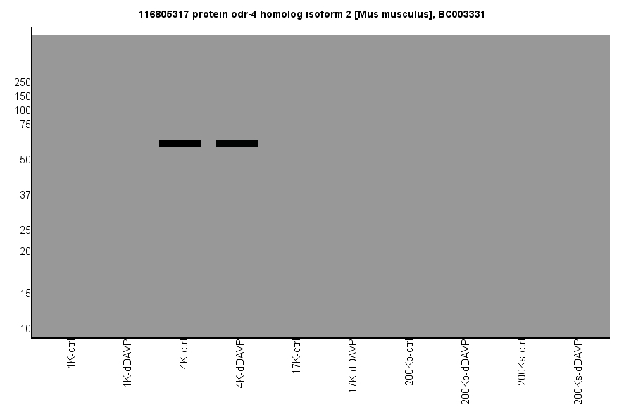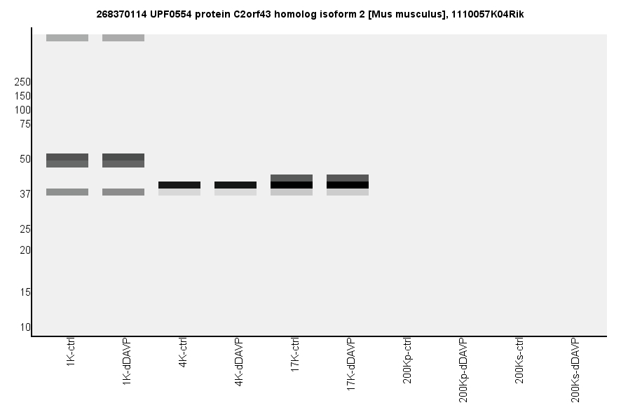 | 268370116 | 1110057K04Rik | 30719 | 1.56 | 1.56 | 1.11 | 1.11 | 1.11 | 1.11 | UPF0554 protein C2orf43 homolog isoform 3 | |||||||||||
