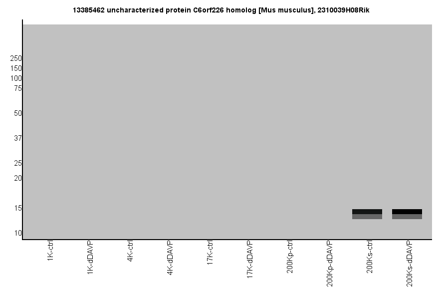 | 13385462 | 2310039H08Rik | 11882 | 1.16 | 1.16 | uncharacterized protein C6orf226 homolog | |||||||||||||||