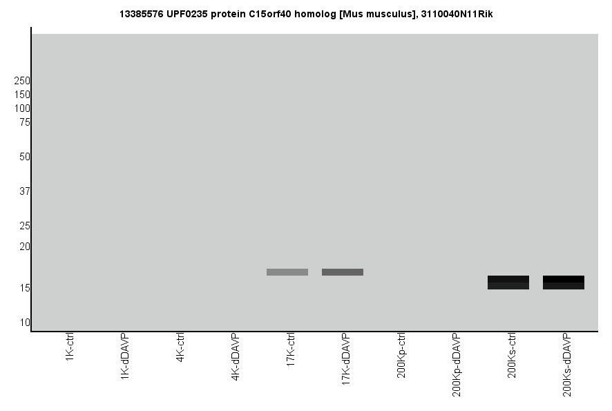 | 13385576 | 3110040N11Rik | 13058 | 1.23 | 1.23 | 1.17 | 1.17 | UPF0235 protein C15orf40 homolog | |||||||||||||