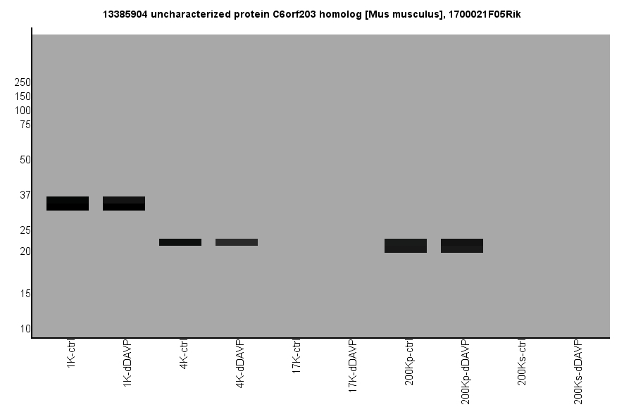 | 13385904 | 1700021F05Rik | 27716 | 1.00 | 1.00 | 0.74 | 0.74 | 0.70 | 0.74 | uncharacterized protein C6orf203 homolog | |||||||||||