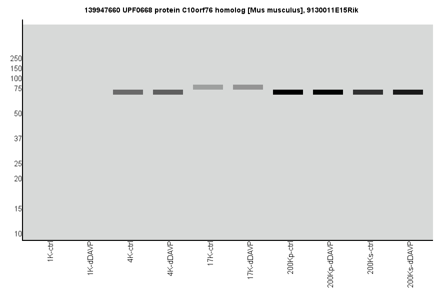 | 139947660 | 9130011E15Rik | 78502 | 0.93 | 0.93 | 1.05 | 1.05 | 0.93 | 0.93 | 0.93 | 0.93 | UPF0668 protein C10orf76 homolog | |||||||||