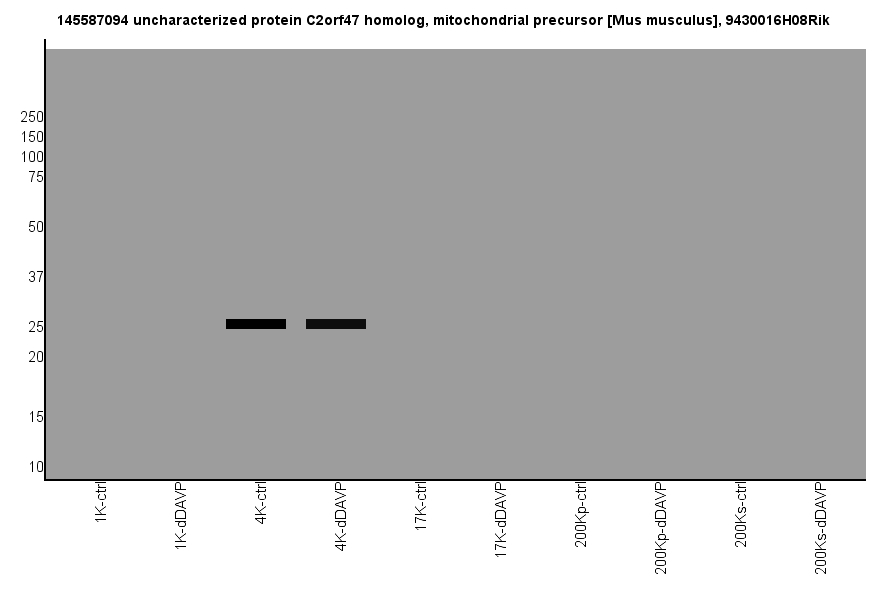 | 145587094 | 9430016H08Rik | 22474 | 1.05 | 1.05 | uncharacterized protein C2orf47 homolog, mitochondrial precursor | |||||||||||||||