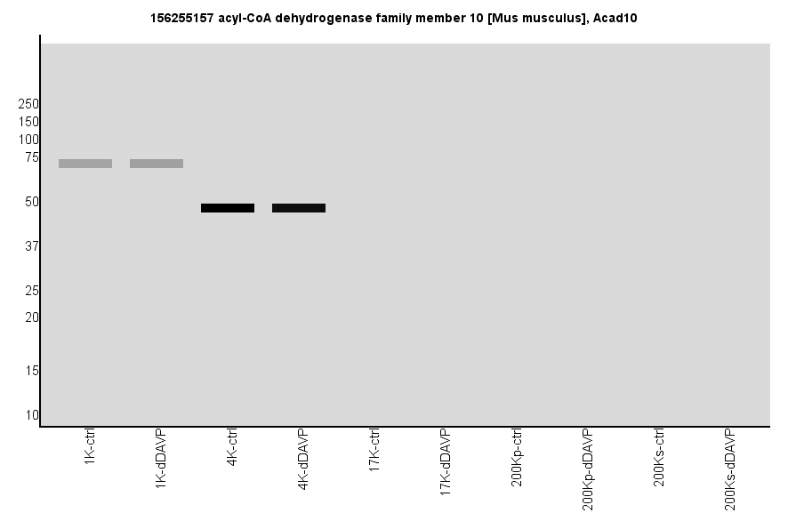 | 156255157 | Acad10 | 118849 | 0.62 | 0.62 | 0.37 | 0.37 | acyl-CoA dehydrogenase family member 10 | |||||||||||||