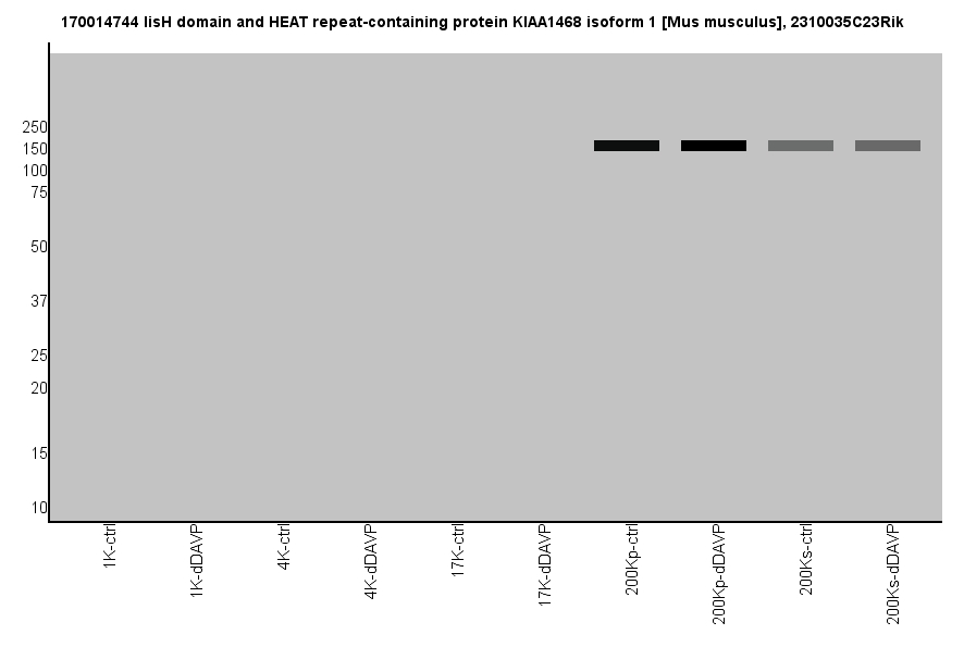 | 170014746 | 2310035C23Rik | 131744 | 1.16 | 1.16 | 1.16 | 1.16 | lisH domain and HEAT repeat-containing protein KIAA1468 isoform 2 | |||||||||||||