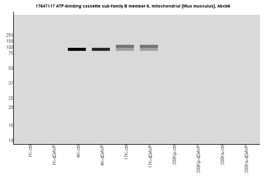 | 17647117 | Abcb6 | 93640 | 1.01 | 1.01 | 1.17 | 1.17 | ATP-binding cassette sub-family B member 6, mitochondrial | |||||||||||||