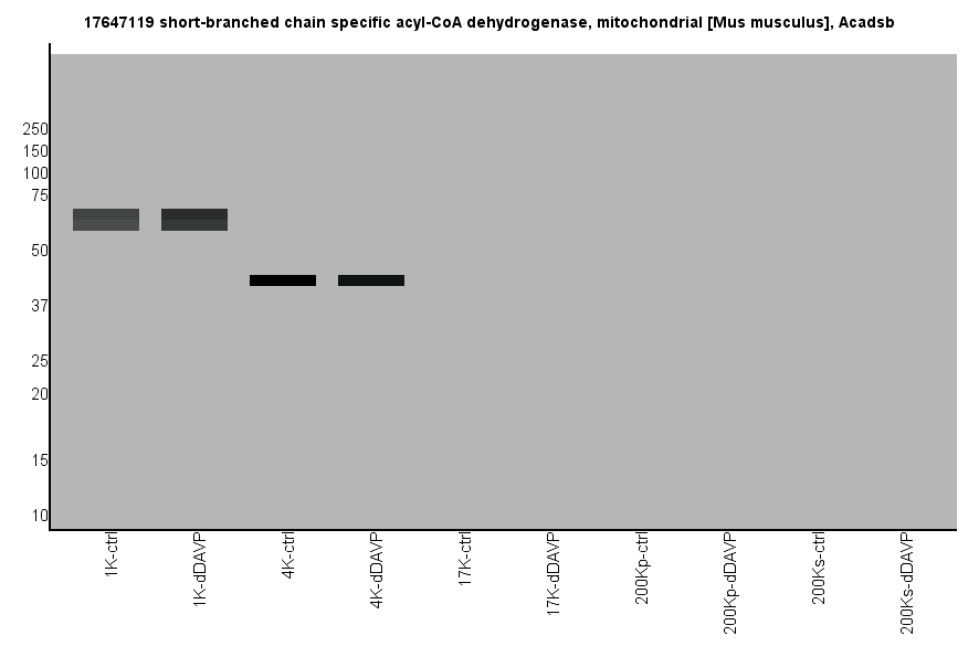 | 17647119 | Acadsb | 44042 | 1.49 | 1.49 | 0.85 | 0.85 | short/branched chain specific acyl-CoA dehydrogenase, mitochondrial | |||||||||||||